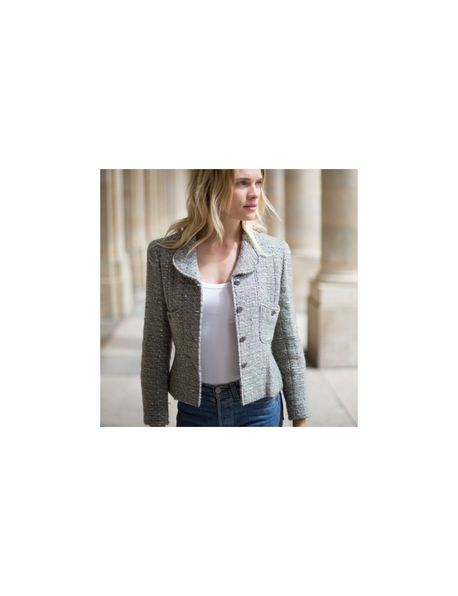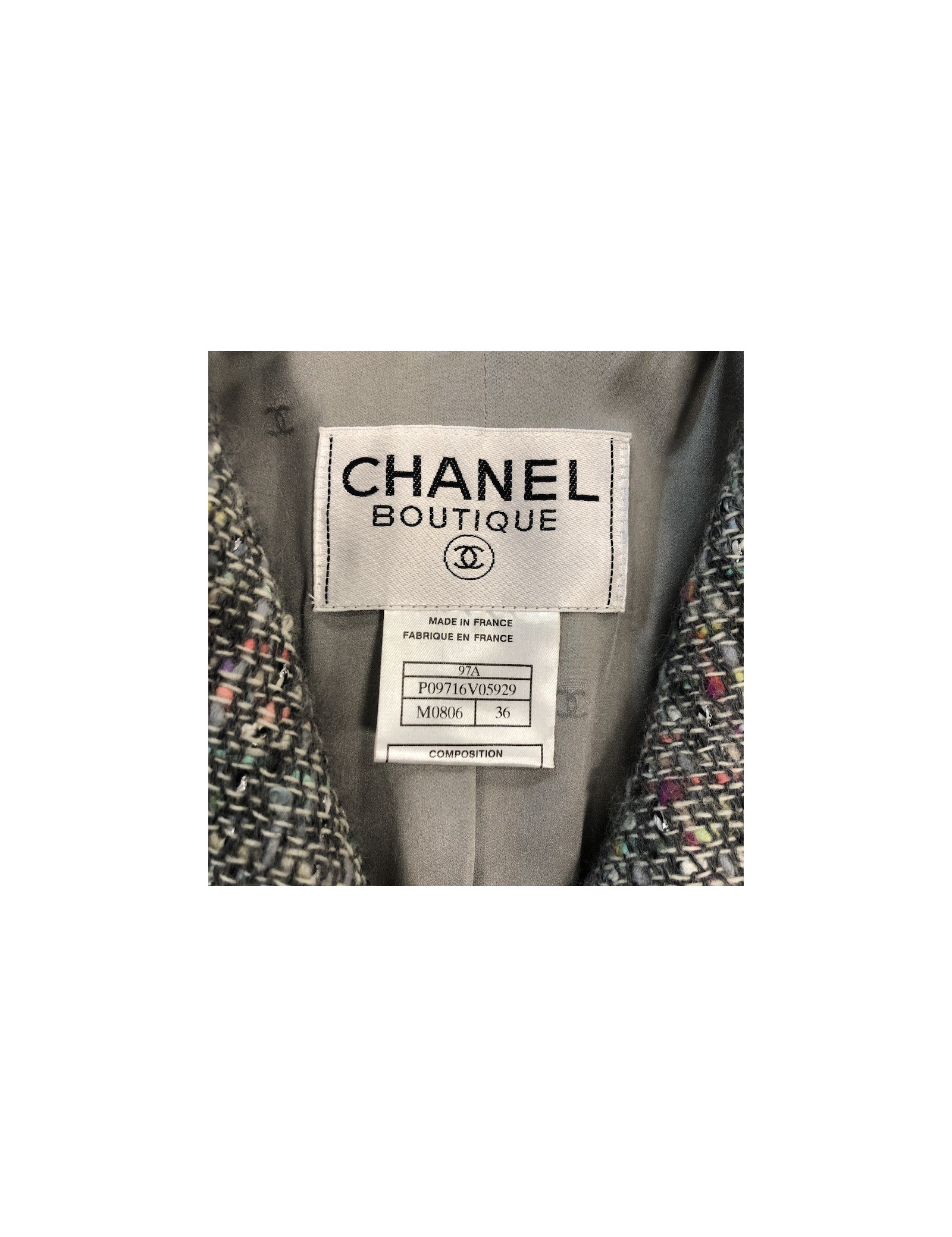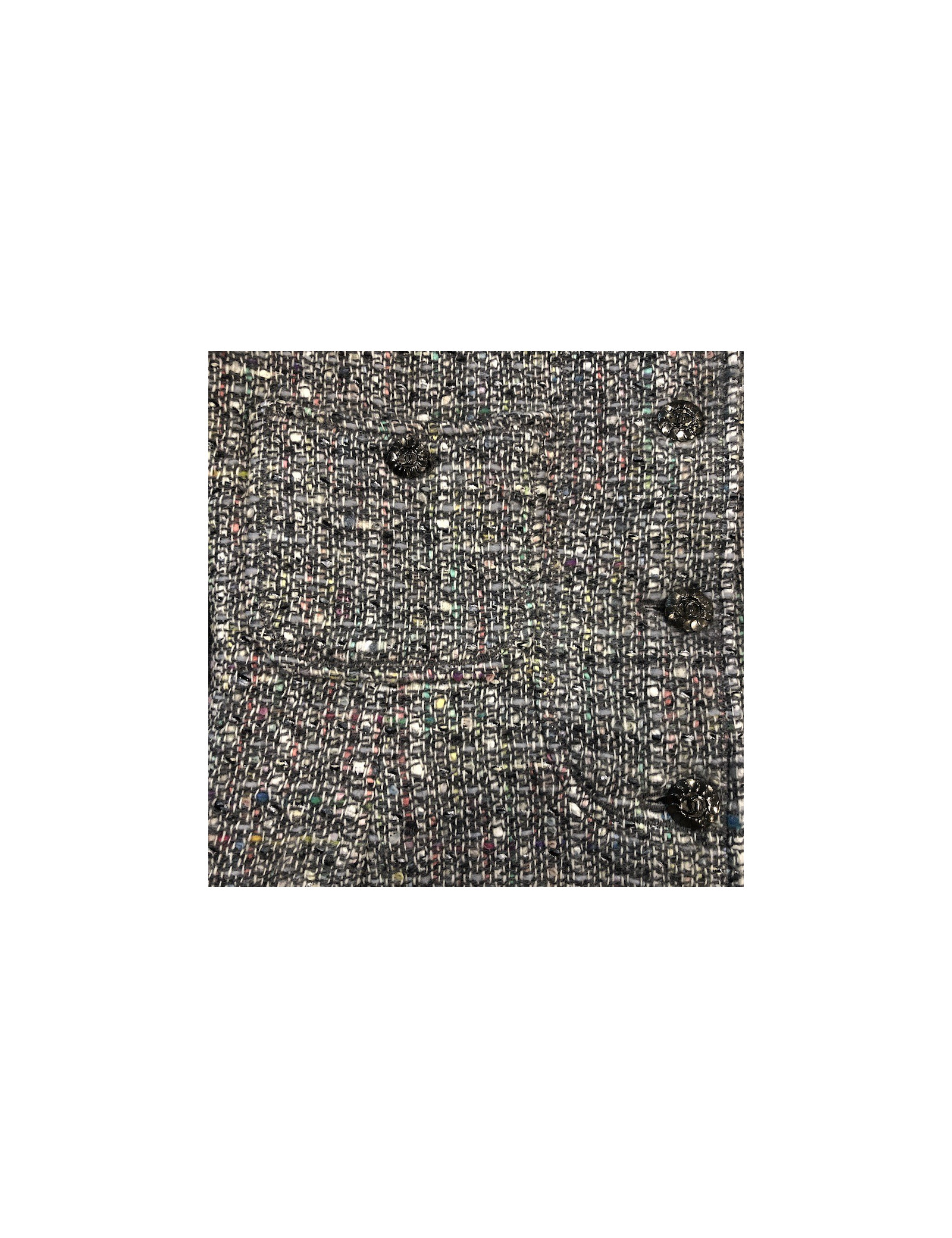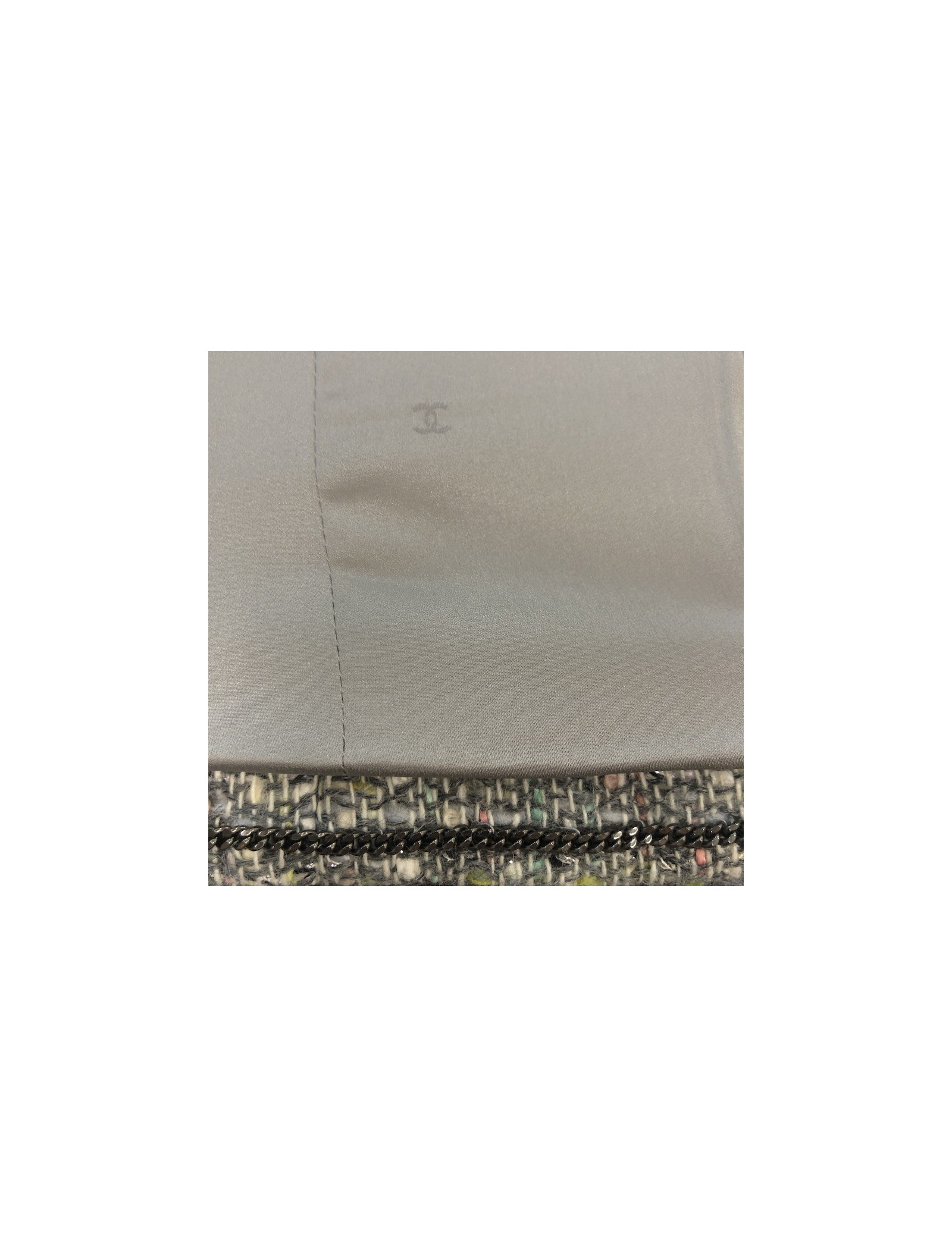 Last items in stock JACKETS CHANEL 'Paris-Bombay' jacket in gray tweed size 38EU CHANEL 20361 2,990.00 € Chanel 'Paris-Bombay' jacket in acrylic and wool in gray tweed lined with gray monogram silk, lined with Swarovski crystal mesh bands. It has a buttoned breastplate with false pockets (that can be removed). In very good shape.Size 38EU Dimensions flat: shoulder width raglan 38 cm, sleeve length 60 cm, wrist circumference 20 cm, width of the bottom 51 cm. Add to cart