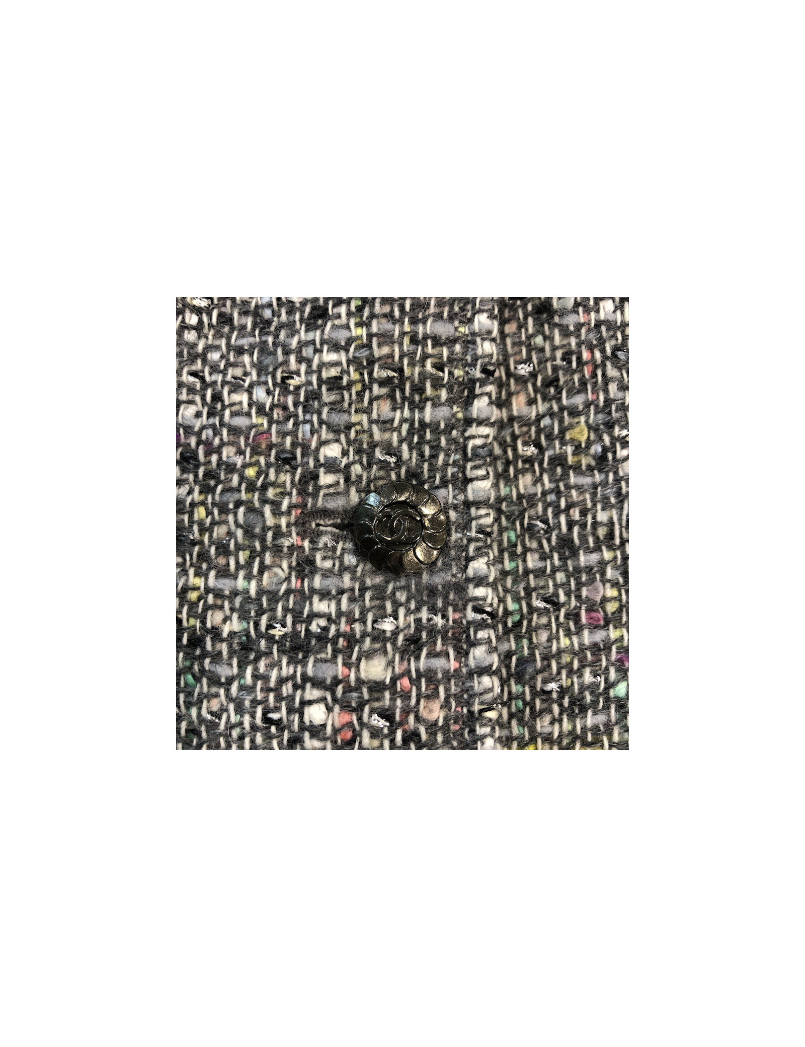 Last items in stock JACKETS Chanel T 36 fr "Les fonds marins" jacket in green cotton tweed CHANEL 19977 1,800.00 € Very beautiful Chanel jacket in green cotton tweed from the Collection 'Les Fonds Marins' Spring-Summer 2012. It has a black liseret and closes with 6 buttons in hammered metal resin anthracite with CC logo. The lining is in the green water silk with Camellias pattern, CC and Chanel signature. In very good condition. Size 36FR Dimensions flat: shoulder... Add to cart