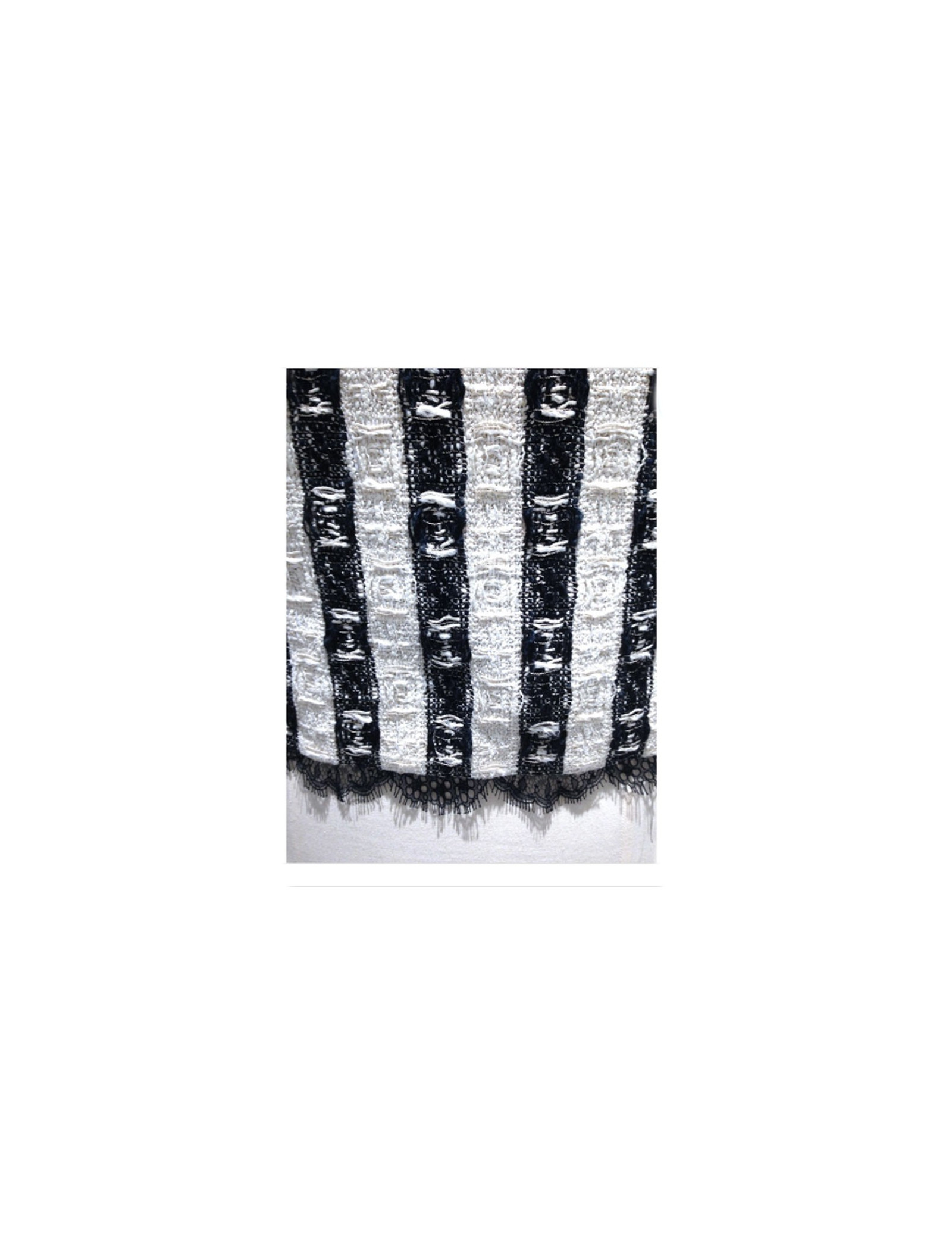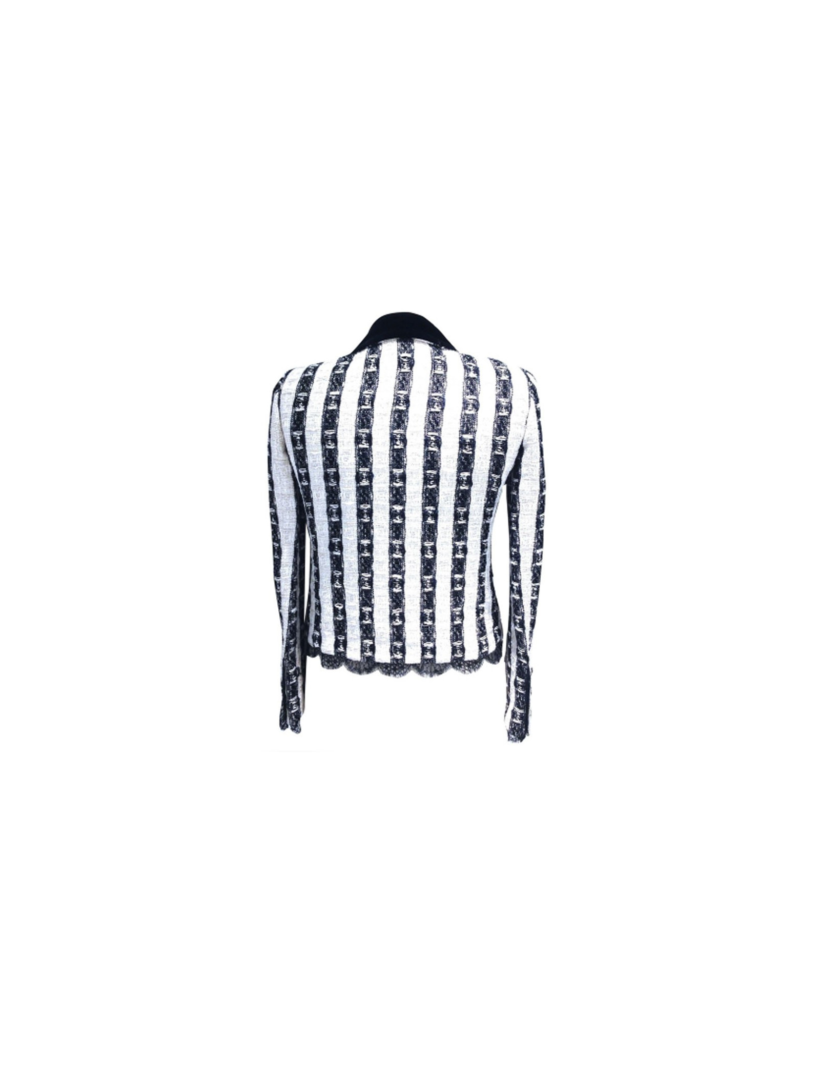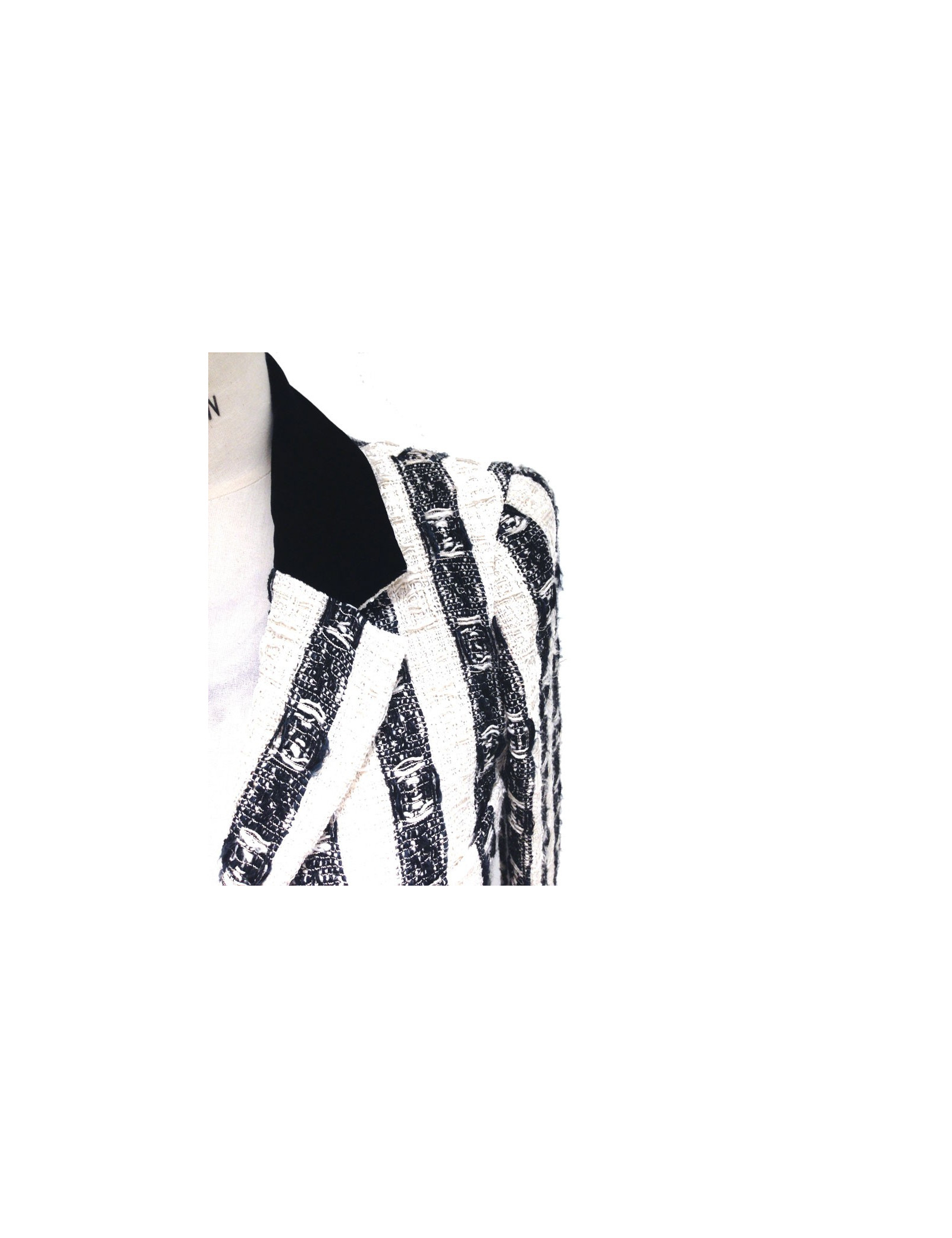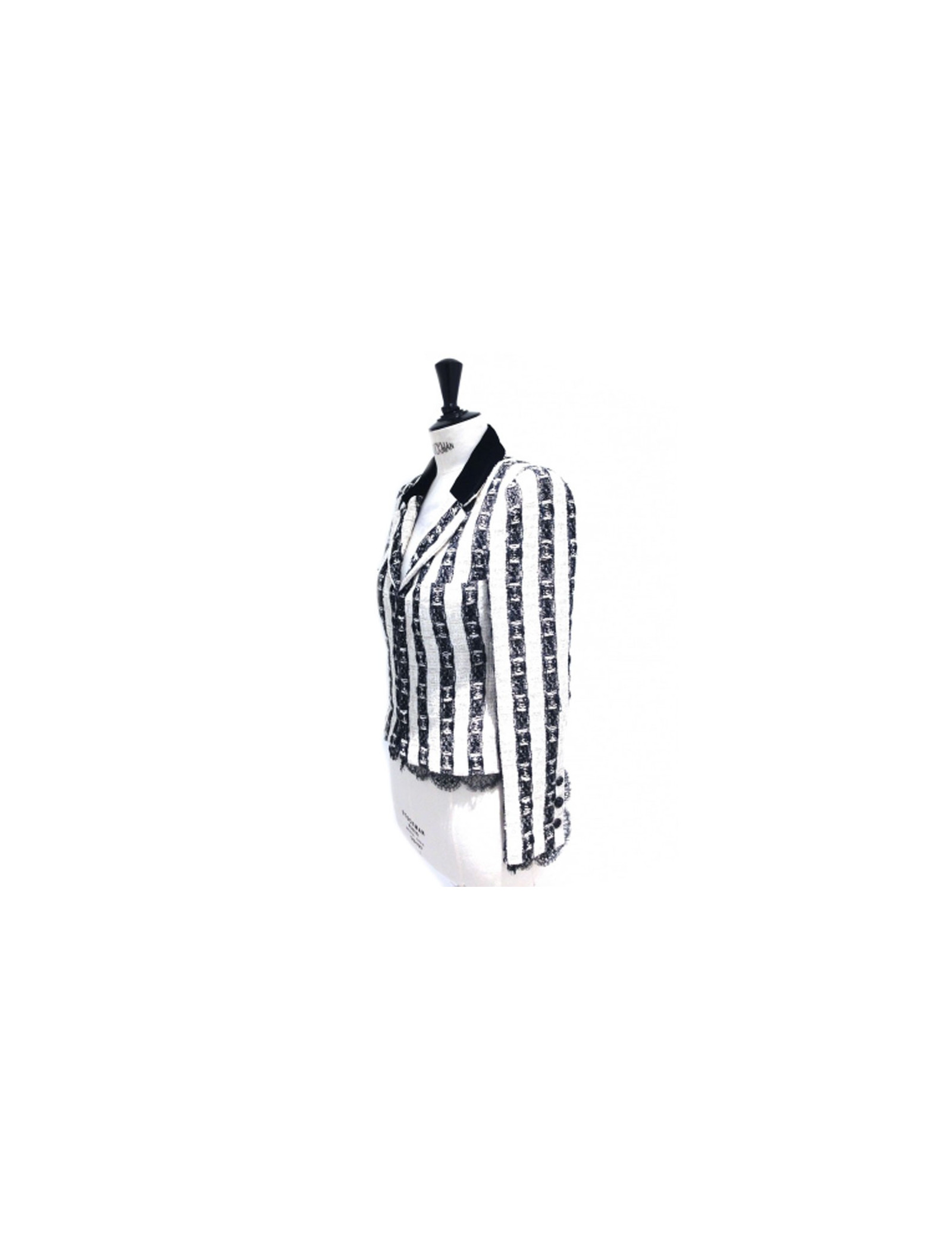 CHANEL tweed jacket with broad stripes black and unbleached, size 40, the autumn-winter 2004 collection. Black velvet collar adorns the jacket with elegance. The jacket has two pockets at the level of the chest. The delicacy of the Black Lace of this LESAGE home on all the lining of the vese, as well as the sleeves, make it an exceptional timepiece. Each handle opening is accessorised with three designer buttons of the CC acronym and small black rhinestones. Length: 58 cm Shoulder width: 41cm, Chest width: 46 cm