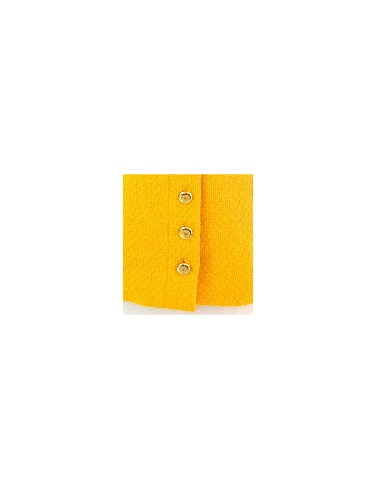 Four pockets to yellow tweed jacket CHANEL. Collection 1989; The filer client withdraws systematiquemenent labels but it is a size 36. The seven buttons or are engraved with the initials CC. The four pockets have a close button also engraved. Each sleeve is decorated with three-button closure. The lining in yellow silk, in perfect condition, is embroidered the initials CC. Inside, a String Bracelet adorns the bottom of the jacket. On the back, a 21 cm slot is adorned with three serious buttons CC. In addition to this jacket, the skirt of this set will be available to you. Length: 71 cm, Sleeve length: 55 cm, Shoulder width: 43 cm, Chest width: 46 cm