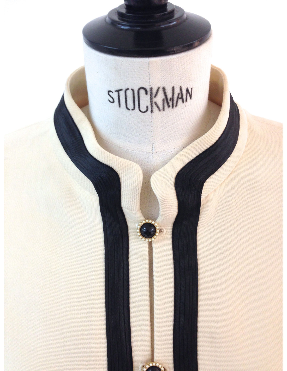 CHANEL wool jacket beige, Asian-inspired, size 40, the spring-summer 2002 collection. This jacket short at Mao collar, decorated with black silk borders, presents four false pockets, and six magnificent gilt buttons of mother-of-Pearl black and adorned with small white beads. The lining in silk, in perfect condition, is embroidered the initials CC as well as camellias.