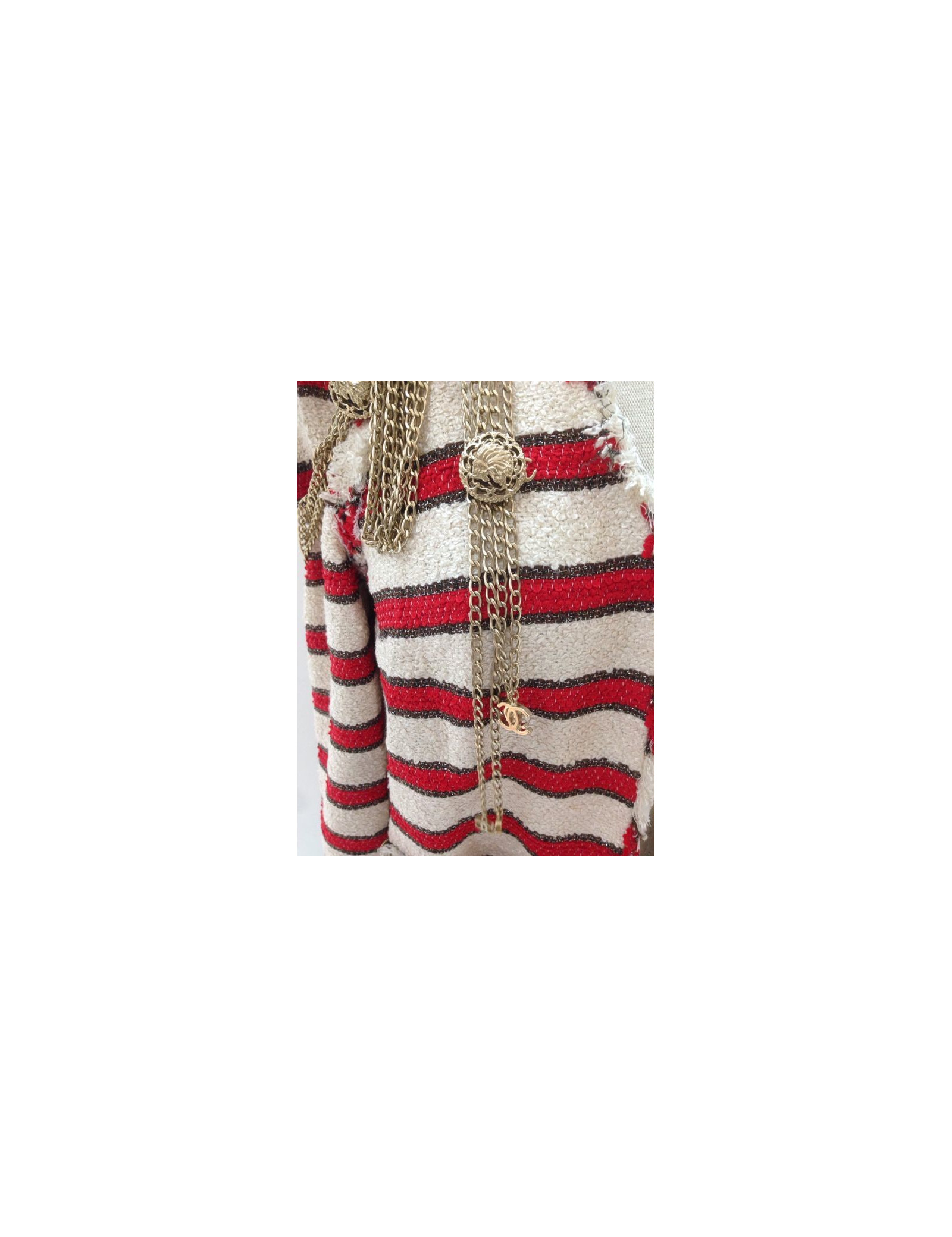 CHANEL jacket, size 36, spring-summer 2008 collection. EXCEPTIONAL piece. This gorgeous piece of collection is an off-white tweed, striped red and gold mat Couture fringed jacket. Internal epaulettes. "Lining 100% silk, in very good condition, sealed"Chanel"and embroidered designs camellias. 3/4 sleeves. Two small lower pockets with sublime golden metal chains and buttons in relief in form of lion's head and abbreviation CC. Group of five strings adorning the shoulders and back. On the back, two groups of strings and pendants CC are removable.