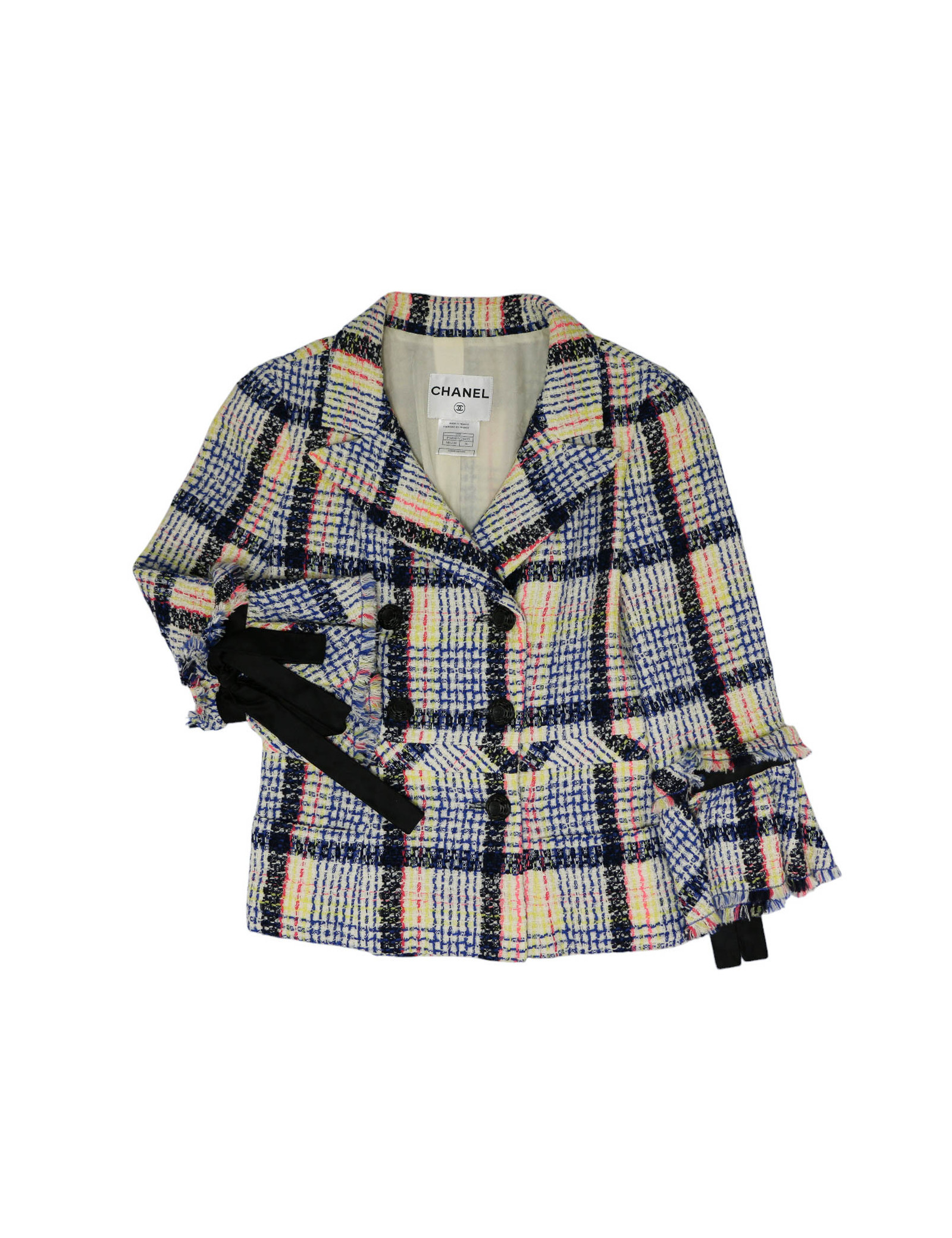 Last items in stock JACKETS CHANEL tweed jacket Size 42 FR CHANEL 33190 4,300.00 € CHANEL ochre and brown tweed jacket Condition : very goodMade in FranceSize : 42FRMaterials: acrylic, tweedLining : brown silkColors : ochre and multicolorMeasurements: shoulders 42 cm, underbust 46 cm, height 60 cm, sleeve length 58 cm, wrist 28 cmYear : Fall 2003Details : the jacket is multicolored in autumnal tones (brown, ochre...). Raglan sleeves,... Add to cart