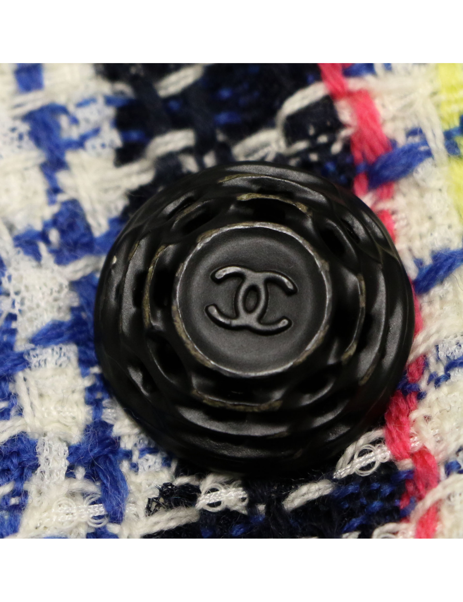 Last items in stock JACKETS Chanel T 36 fr "Les fonds marins" jacket in green cotton tweed CHANEL 19977 1,800.00 € Very beautiful Chanel jacket in green cotton tweed from the Collection 'Les Fonds Marins' Spring-Summer 2012. It has a black liseret and closes with 6 buttons in hammered metal resin anthracite with CC logo. The lining is in the green water silk with Camellias pattern, CC and Chanel signature. In very good condition. Size 36FR Dimensions flat: shoulder... Add to cart