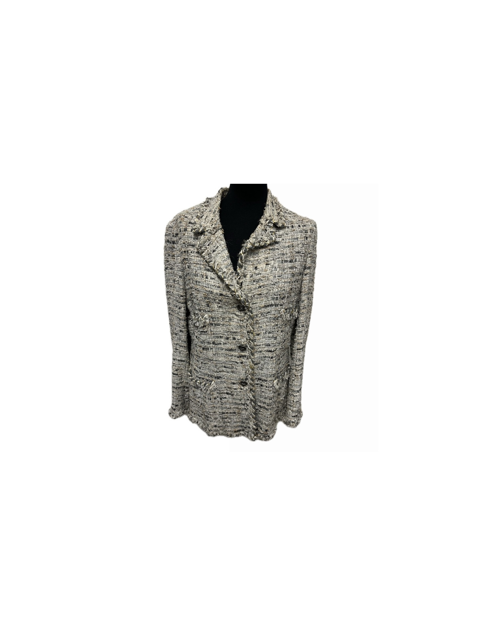 Last items in stock SETS CHANEL grey suit Size 40 FR CHANEL 32484 3,100.00 € CHANEL black ang grey suit ( skirt and jacket) Condition : very goodMade in FranceSize : 40FRMaterials : wool, raw silkLining: silkColors - jacket : marled black, skirt : blackMeasurementsJacket : shoulders 40 cm, under chest 45 cm, height 65 cm, sleeve length 60 cm, wrist circumference 25 cmSkirt: total length 55 cmDetails : black contrasting stripe, 13... Add to cart