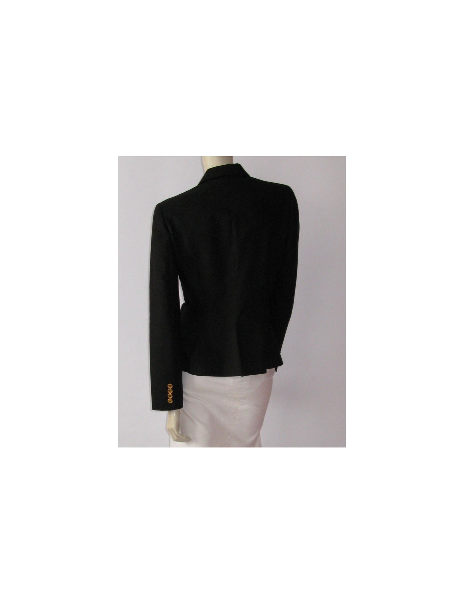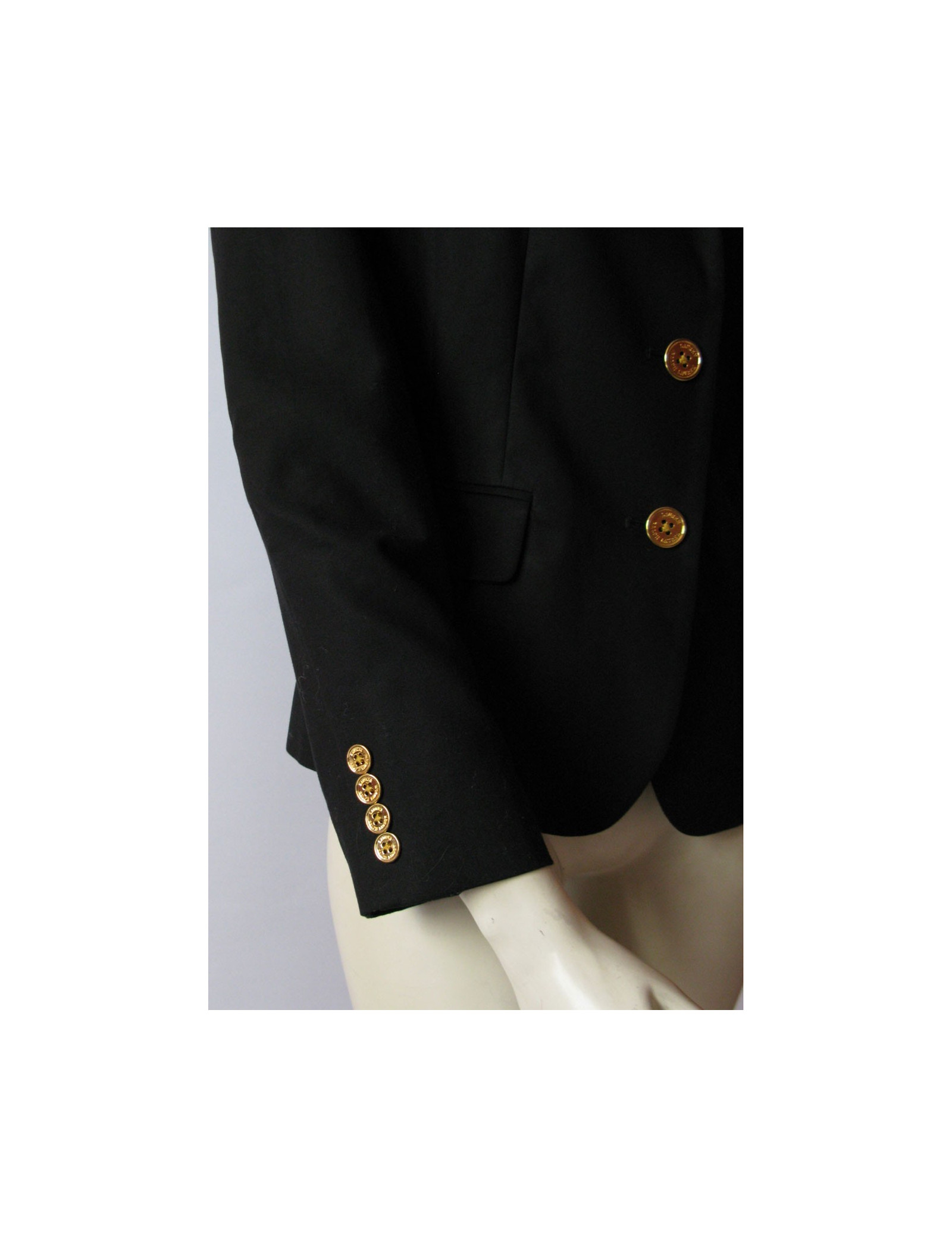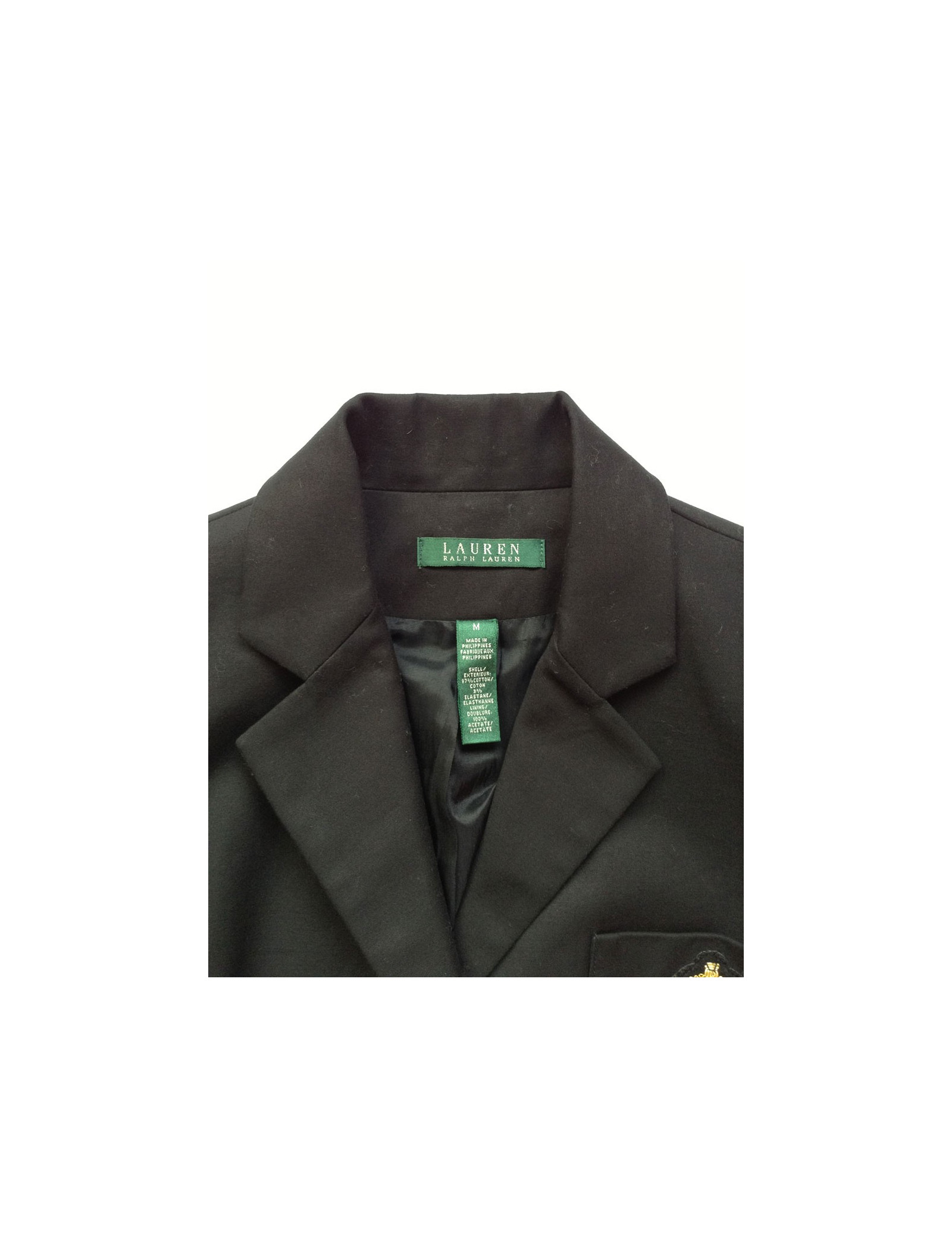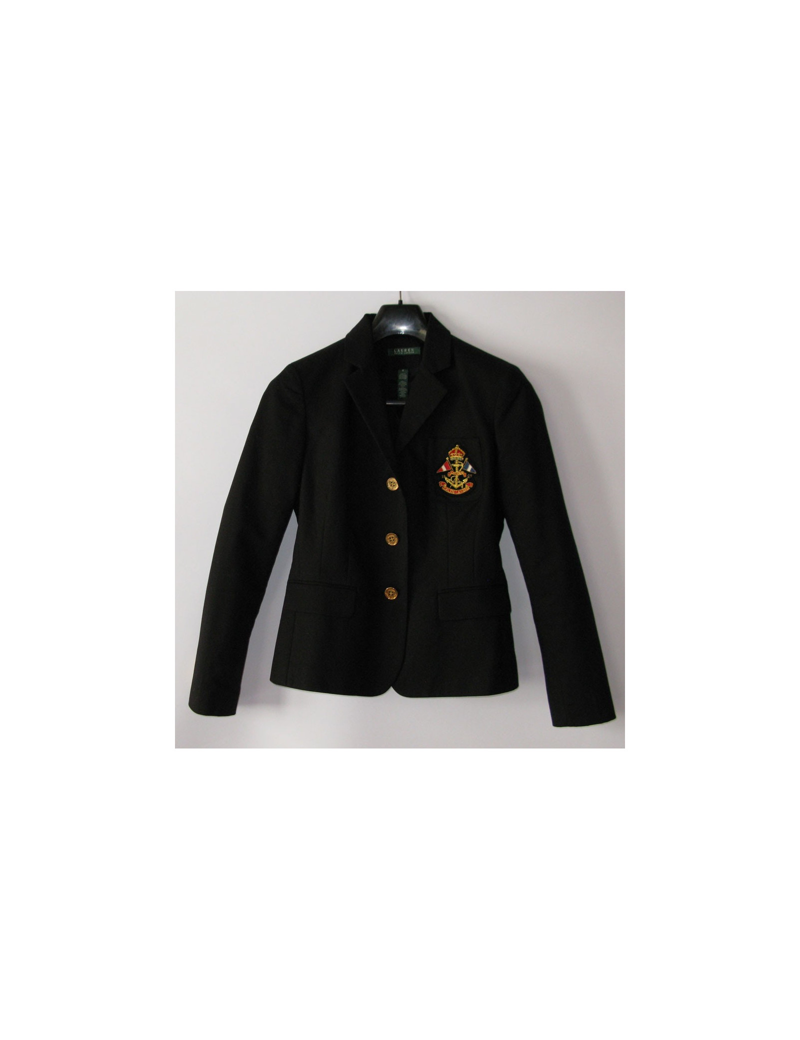 Veste blazer "style Chic et classe préparatoire" de la Maison Ralph Lauren. Cup black Blazer bent, chest with coat of arms representative Pocket a Crown, the anchor of a boat, 2 flags and "Lauren Ralph Lauren" trademark. Pockets in rabat at the level of the hips, 3 Gold buttons for closing front and 4 buttons decoration on the wrists any acronym "Lauren Ralph Lauren". Size M. 97% and for lining 100% acetate. pp 595 EUR Collection: Spring/summer Length: 57 cm, Chest width: 46 cm Length of sleeves: 62 cm, Build: 40 cm