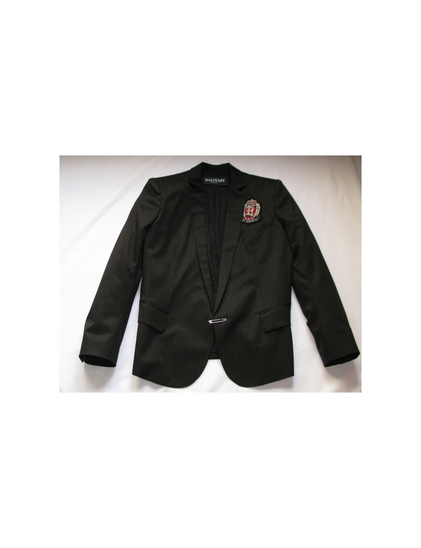 Balmain blazer in black wool with fine red stripes. T40FR. It is a fitted cut with tailored collar, long sleeves, 1 slant pocket on the left chest, crest embroidered with a crown, a large 'B' for BALMAIN and the address of the shop .