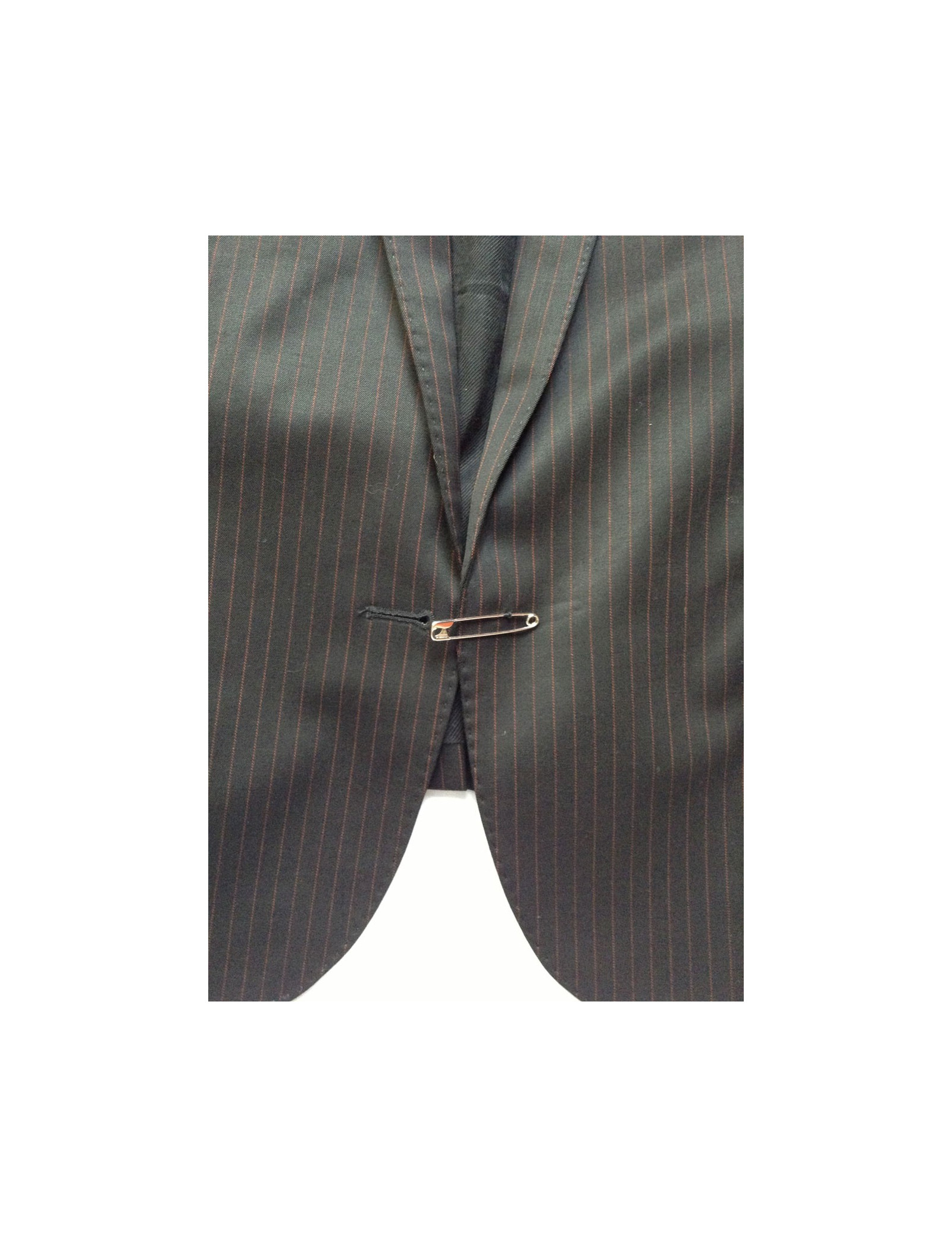 Slit on the back, flap patch pockets on the hips, 1 inside pocket, center closure with safety pin, 3 buttons on the cuffs.