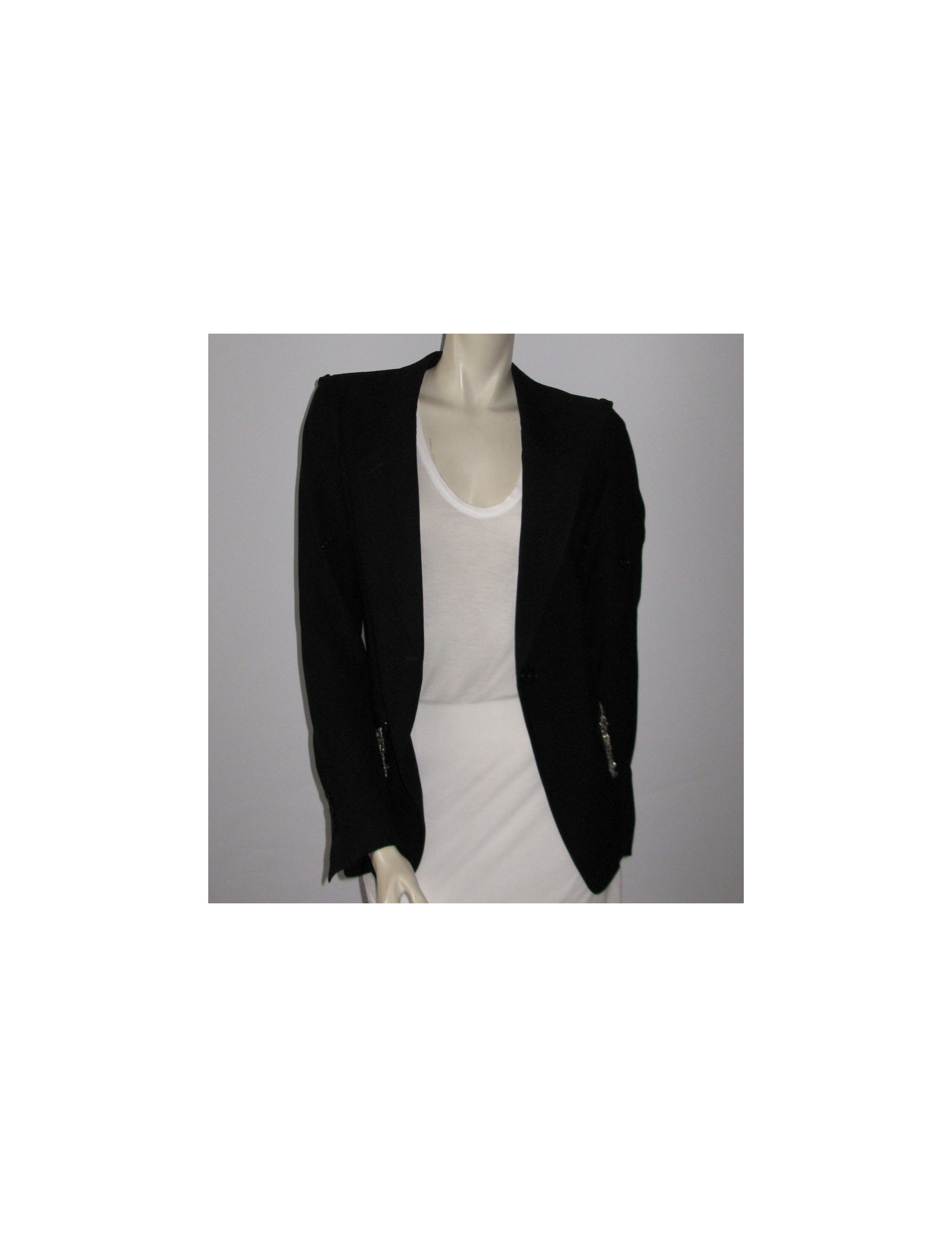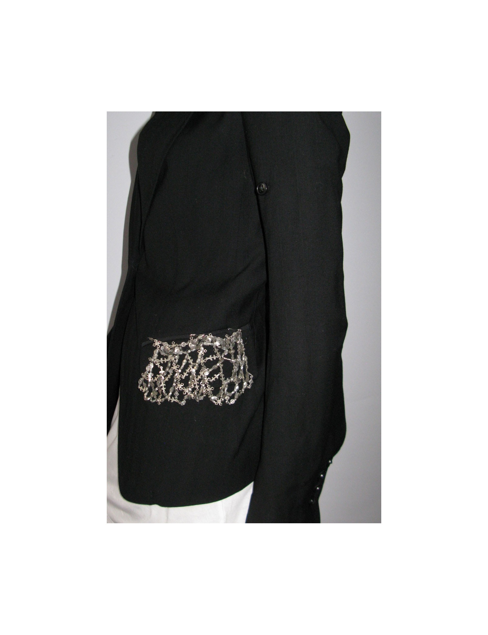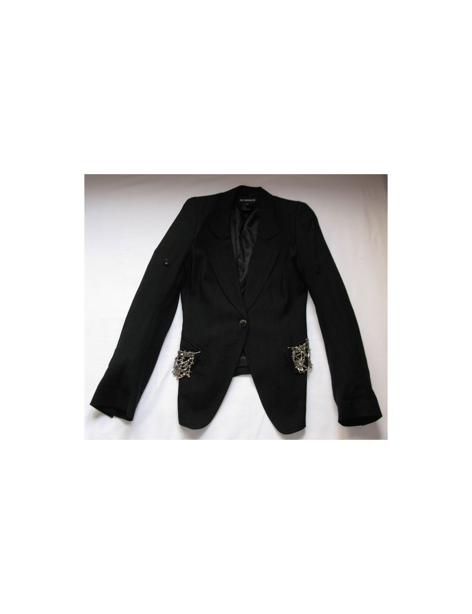ANN DEMEULEMEESTER black T40IT Blazer, cut close to the body, long sleeves with possibility to roll up the sleeves through the small button on the top of the handle. Tailored collar, angled pockets flaps, decorated with a coat of mail silver, adorned with metallic details. Slit at the back. Central lock 1 button, small slit on sleeves near the 4 buttons located at the wrists. 51% wool, 49% viscose. Length: 65 cm, Chest width: 41 cm Sleeve length: 66 cm, Build: 36 cm