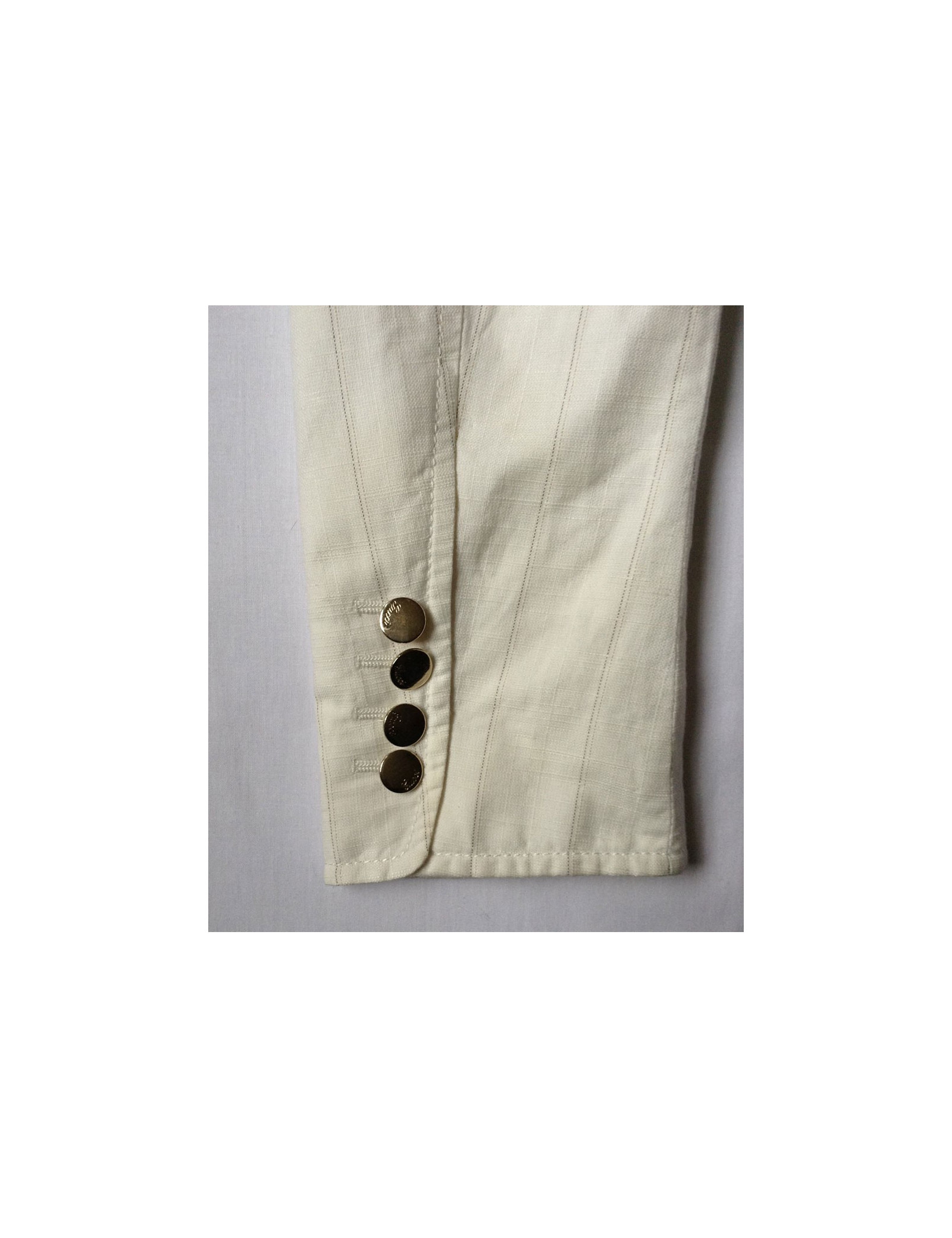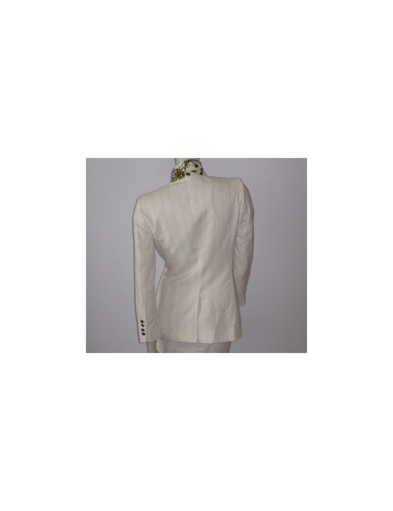 GUCCI T40It white jacket Pinstripe Brown and beige, tailored collar, chain Golden Stirrup engraved with the brand inside the neck. Jacket curved cut, long sleeves with 4-button cuffs acronyms "Gucci" decoration. 1 pocket on the chest followed by 2 large pockets on the front to level hips. Slit at the back. Front closure with a golden logo button "Gucci". Printed logo lining. 63% cotton, 34% linen.