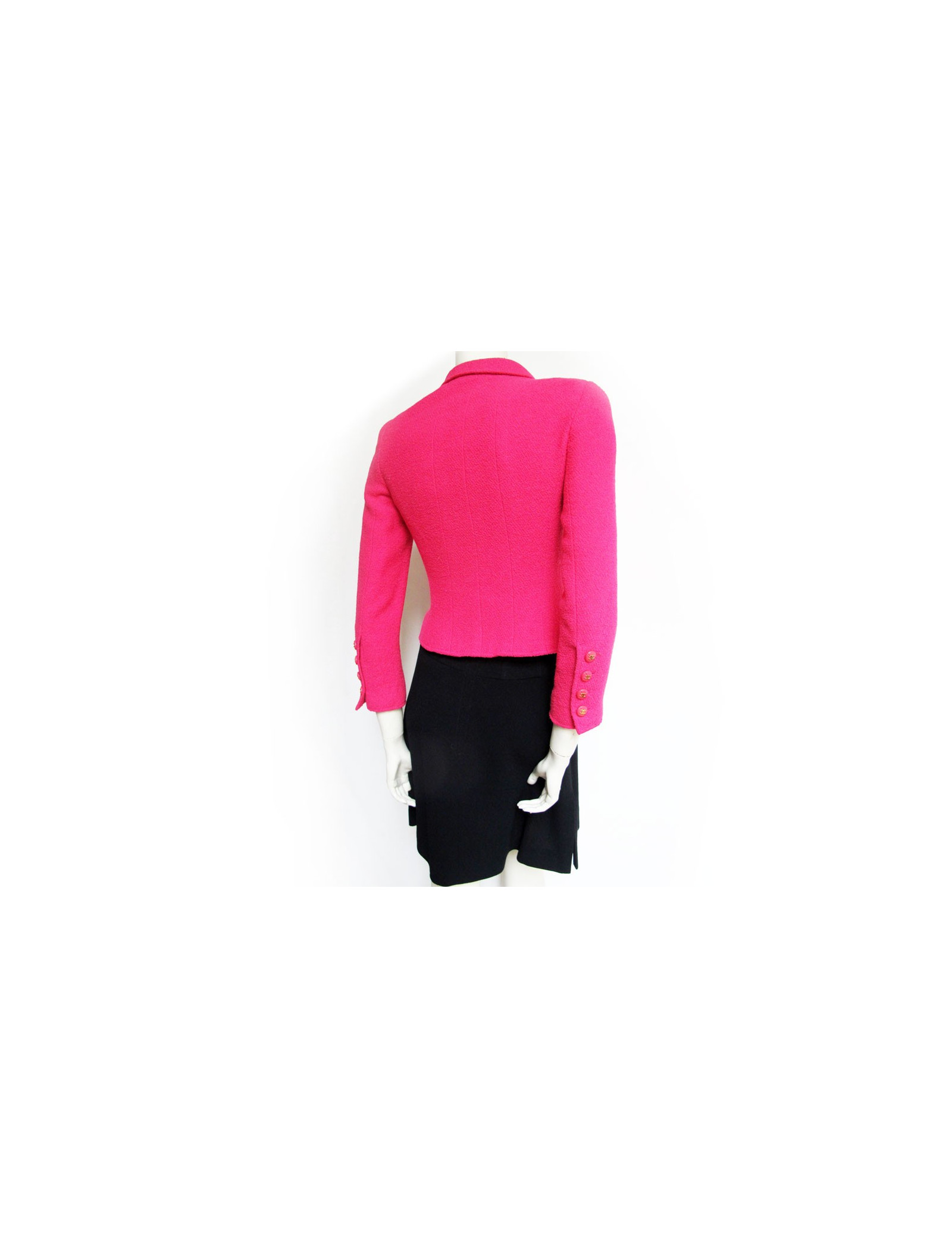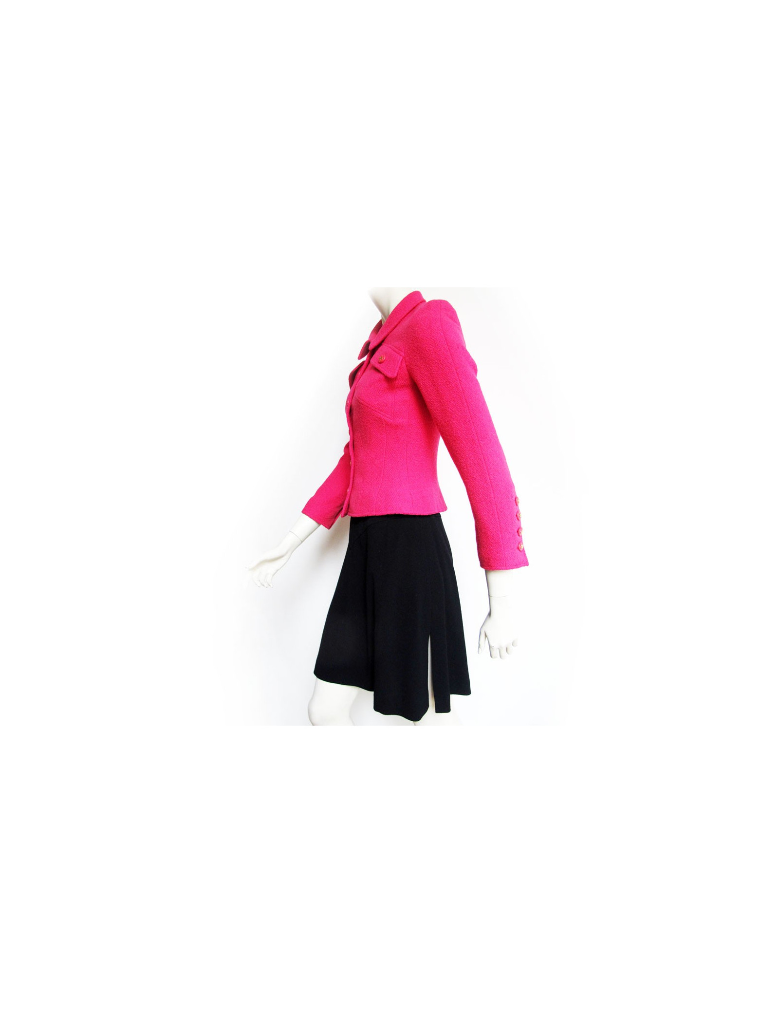 All CHANEL t 36 fuchsia and black. The Fuchsia jacket is 100% cotton. The buttons are acronyms CC gold metal. The lining is silk. In very good condition. Height: 54 cm, back width: 36 cm, sleeve length: 55 cm, width at the level of the chest: 36 cm, width size: 36 cm, width at the bottom of the jacket: 39 cm The black skirt is made of 100% wool. The lining is silk. Size 36. The size, there is a way corset frame. It closes in the back of a zip. A small slit of 19 cm from each side of the skirt. Height: 52 cm, width at the waist: 29cm, hips: 44 cm, width at the bottom of the skirt: 65 cm will be delivered in a Chanel bag