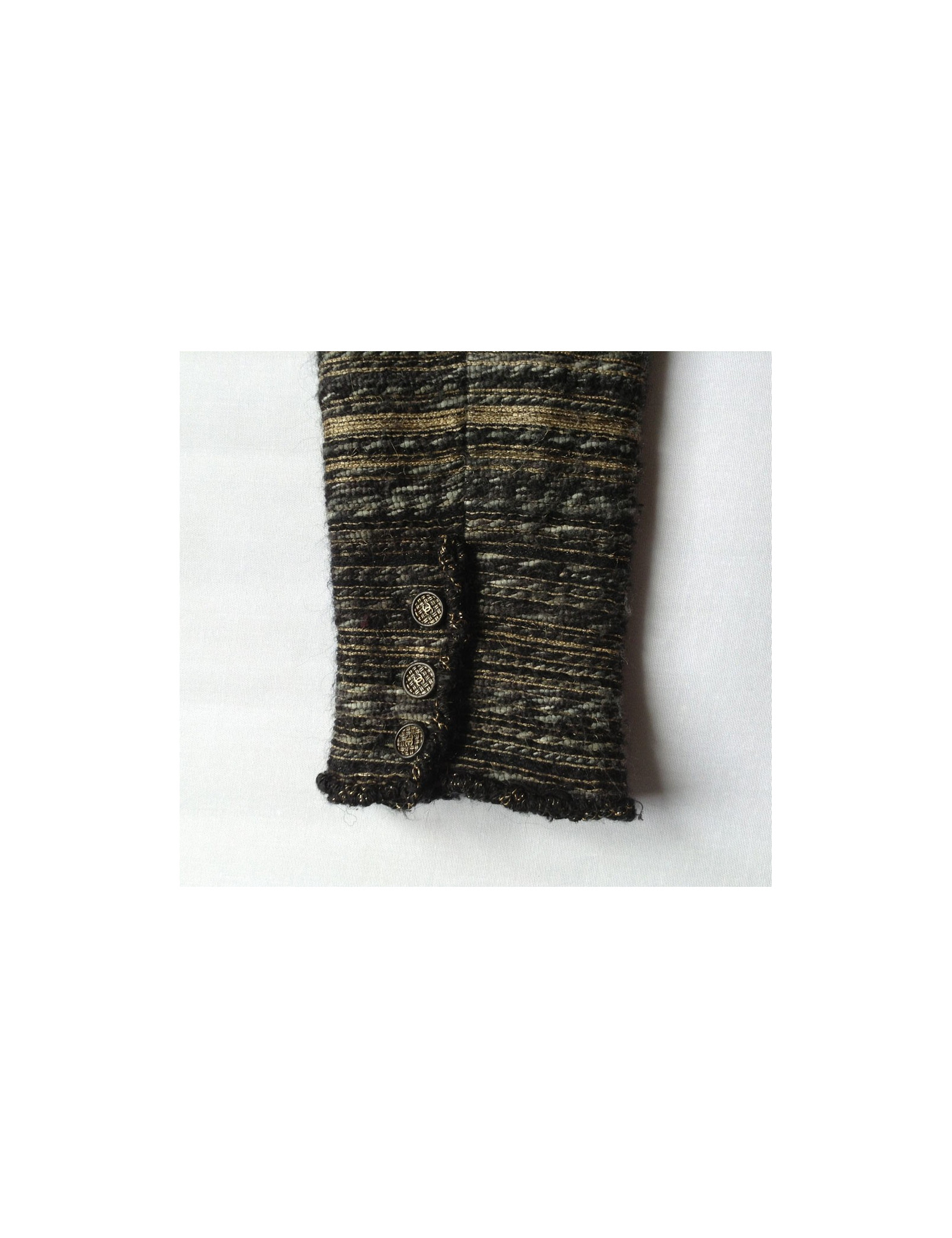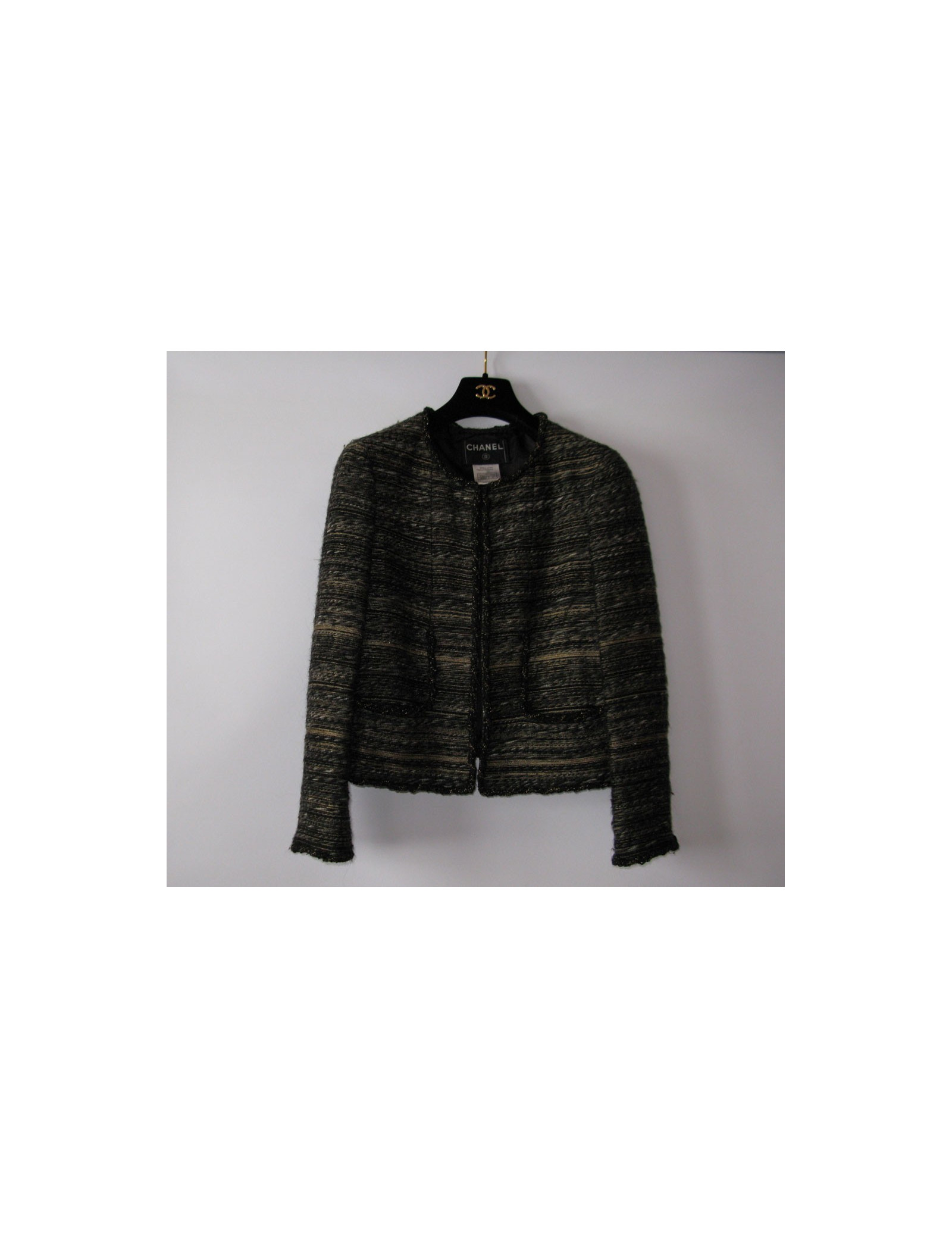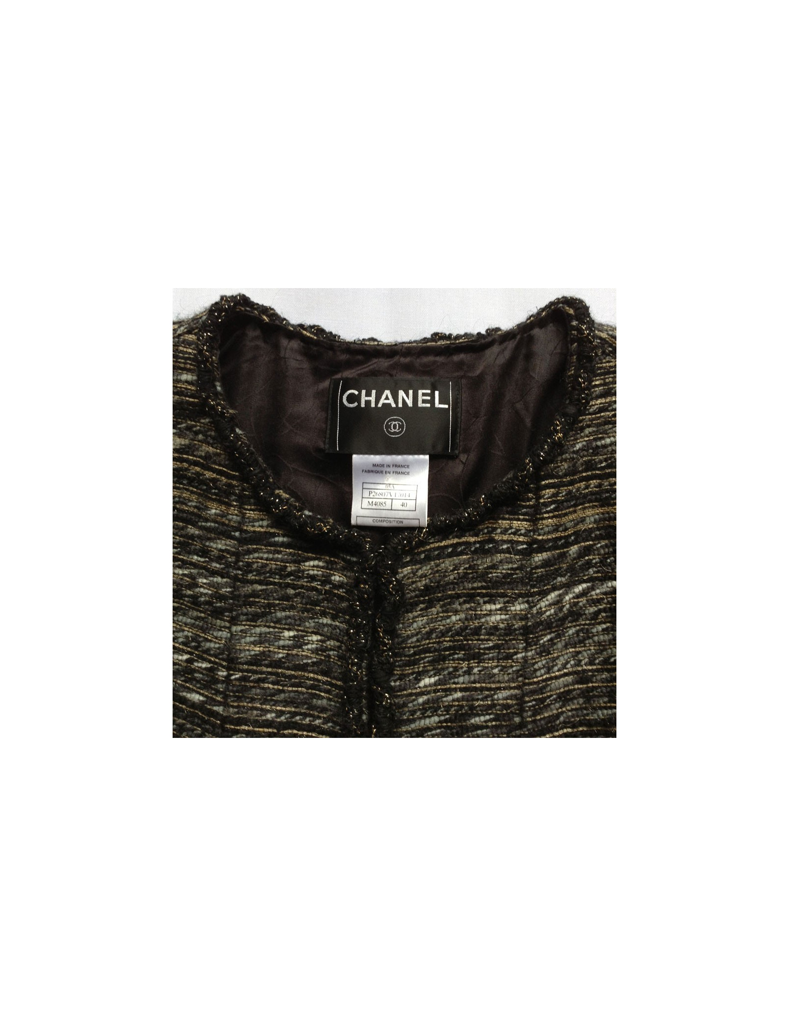 Divine! CHANEL multicolor tweed jacket: black, anthracite, blue and gold. Straight cut, ras neck collar, long sleeves. Closing buttoned at the wrists by 3 beautiful buttons acronyms CC with the fabric of the jacket. The col, the edge of the wrists, the pockets on the sides in large "L"-shaped, the Center and the bottom of the jacket are looped to a mat of Black wool with son '' or ''. Opening front by 5 hooks. Size 40fr - wool.