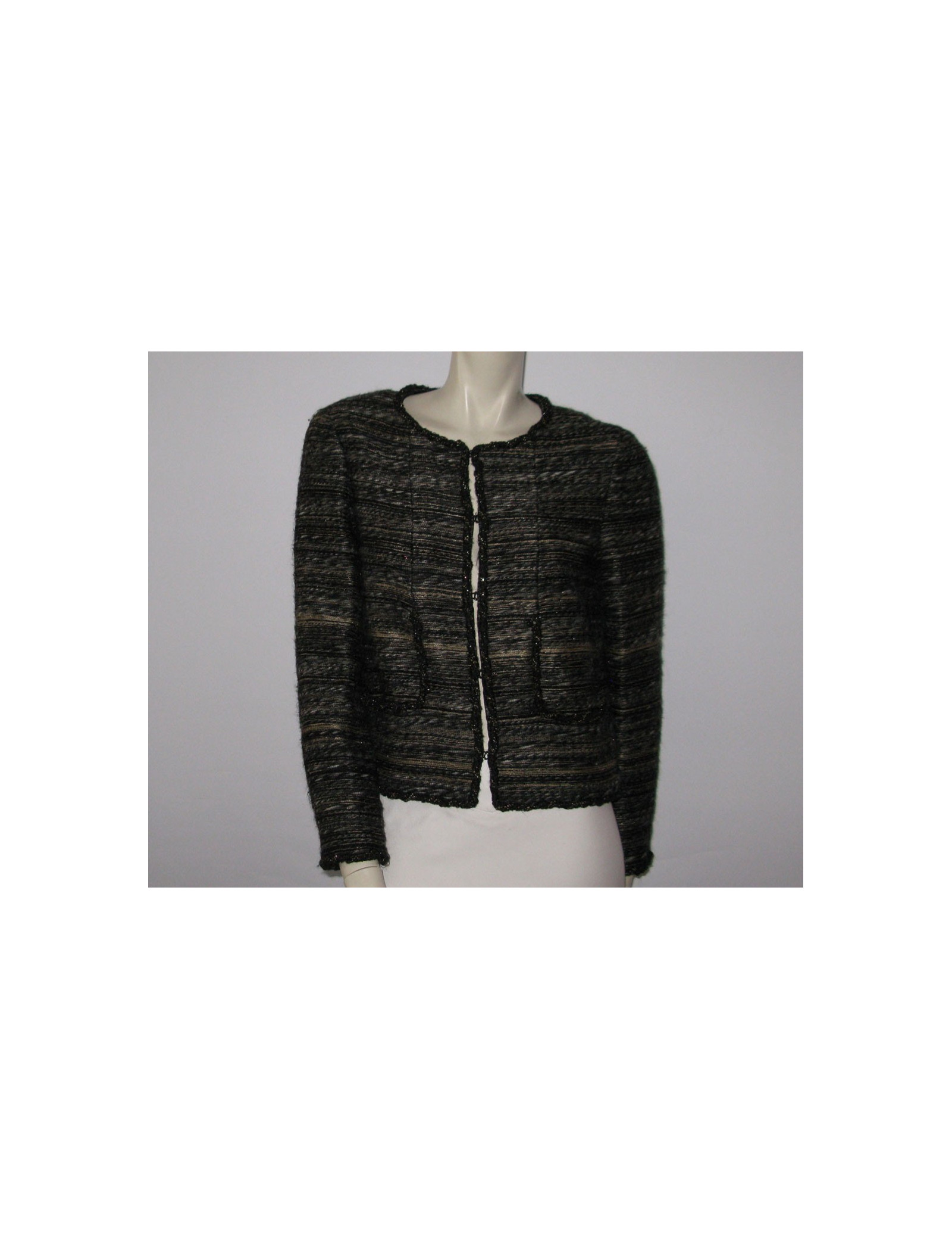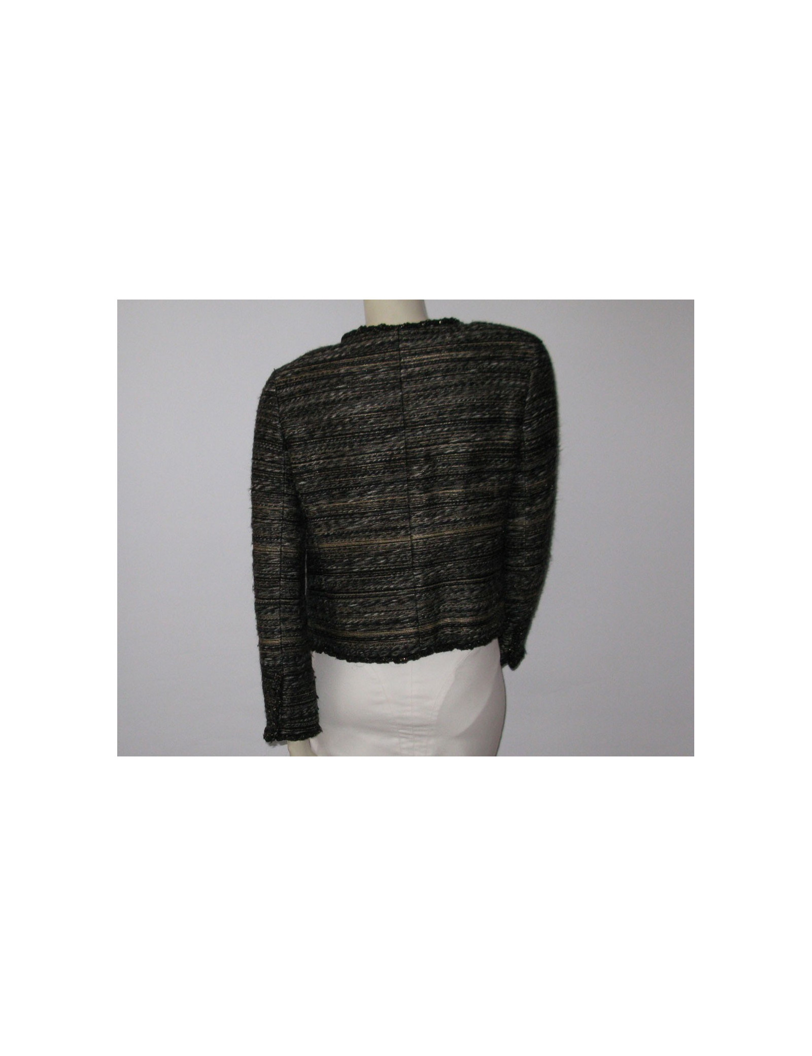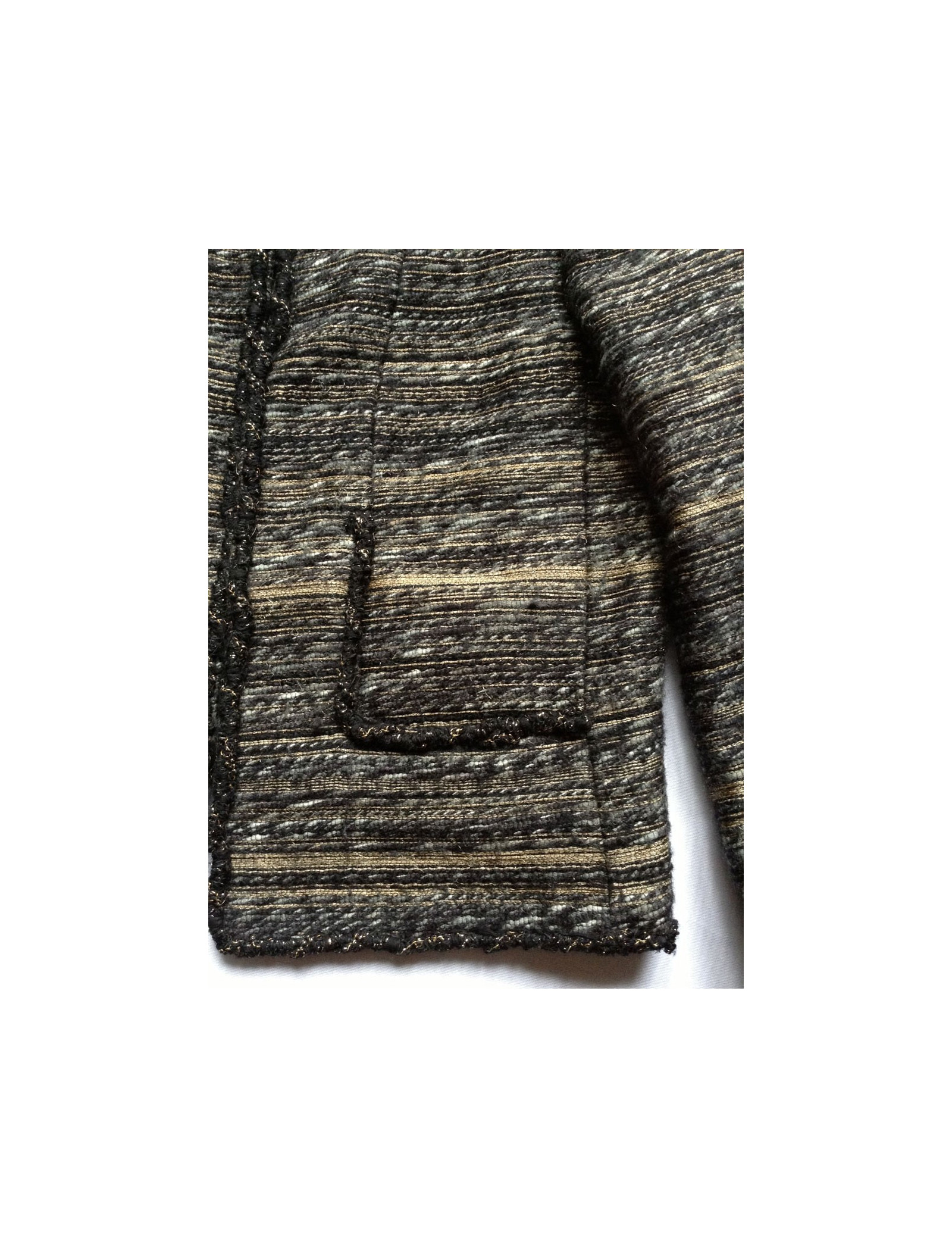 Divine! CHANEL multicolor tweed jacket: black, anthracite, blue and gold. Straight cut, ras neck collar, long sleeves. Closing buttoned at the wrists by 3 beautiful buttons acronyms CC with the fabric of the jacket. The col, the edge of the wrists, the pockets on the sides in large "L"-shaped, the Center and the bottom of the jacket are looped to a mat of Black wool with son '' or ''. Opening front by 5 hooks. Size 40fr - wool.