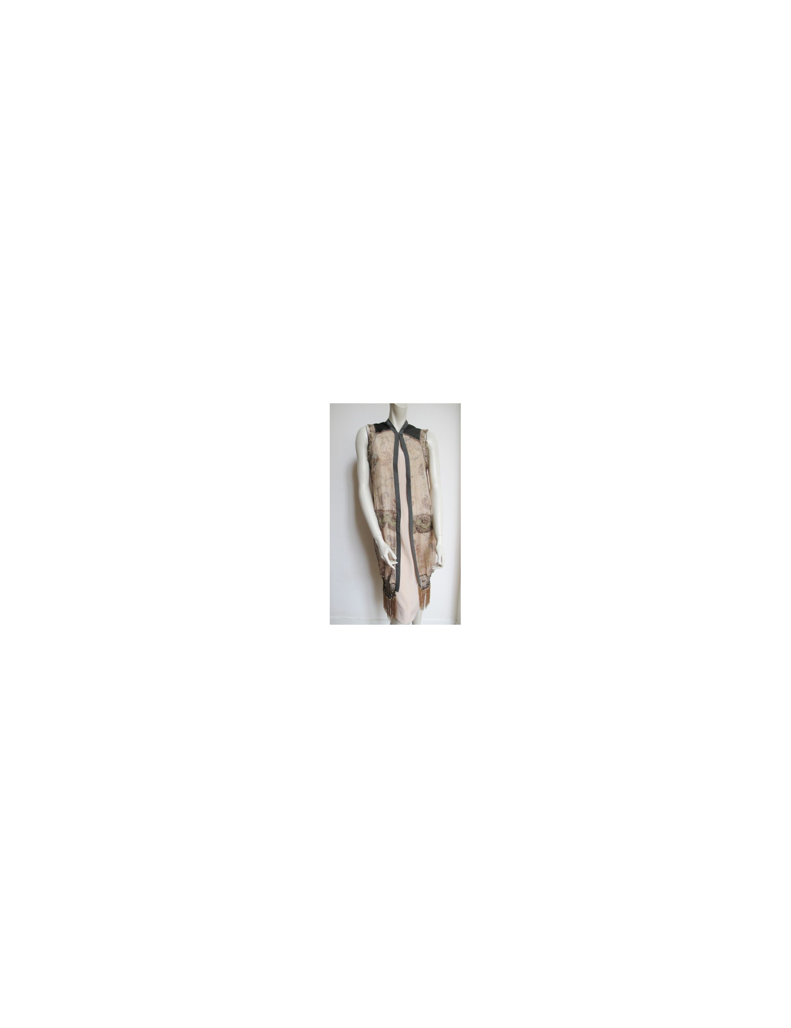 Baroque style! Sleeveless Share Spirit in khaki silk, printed floral, the contour of the arm as well as size are enhanced by... The bottom is adorned with beads and fringe. Size 36.