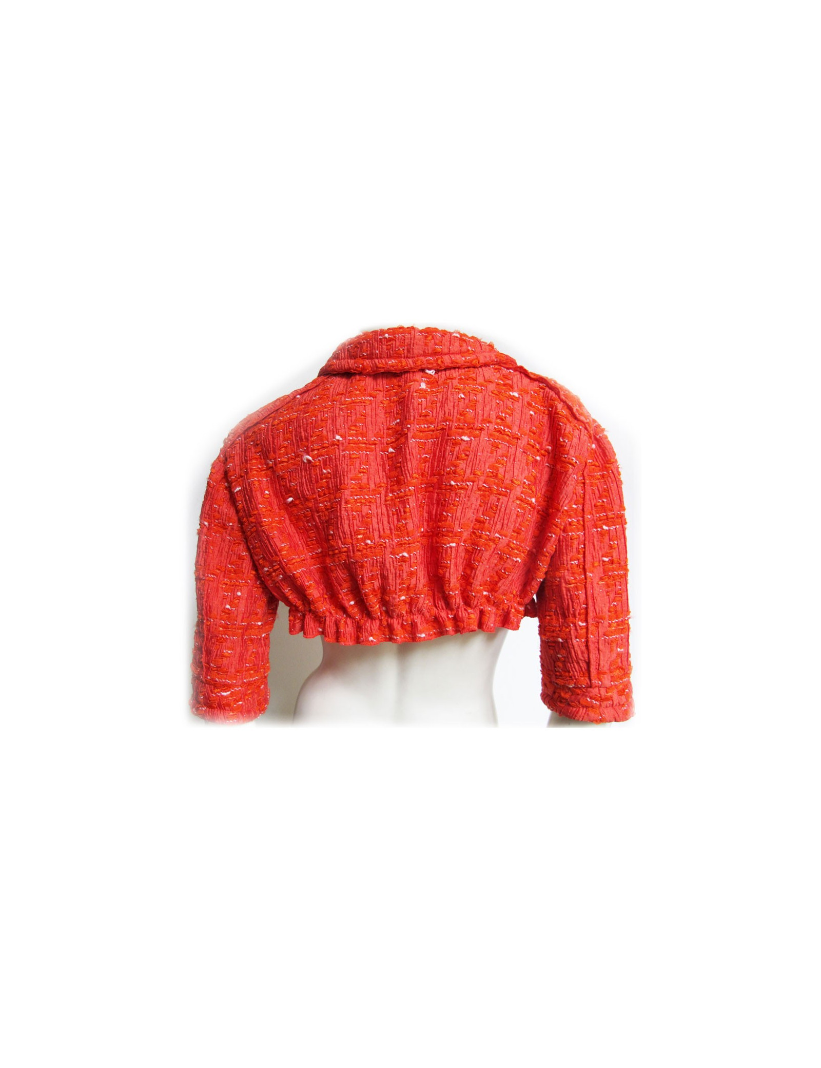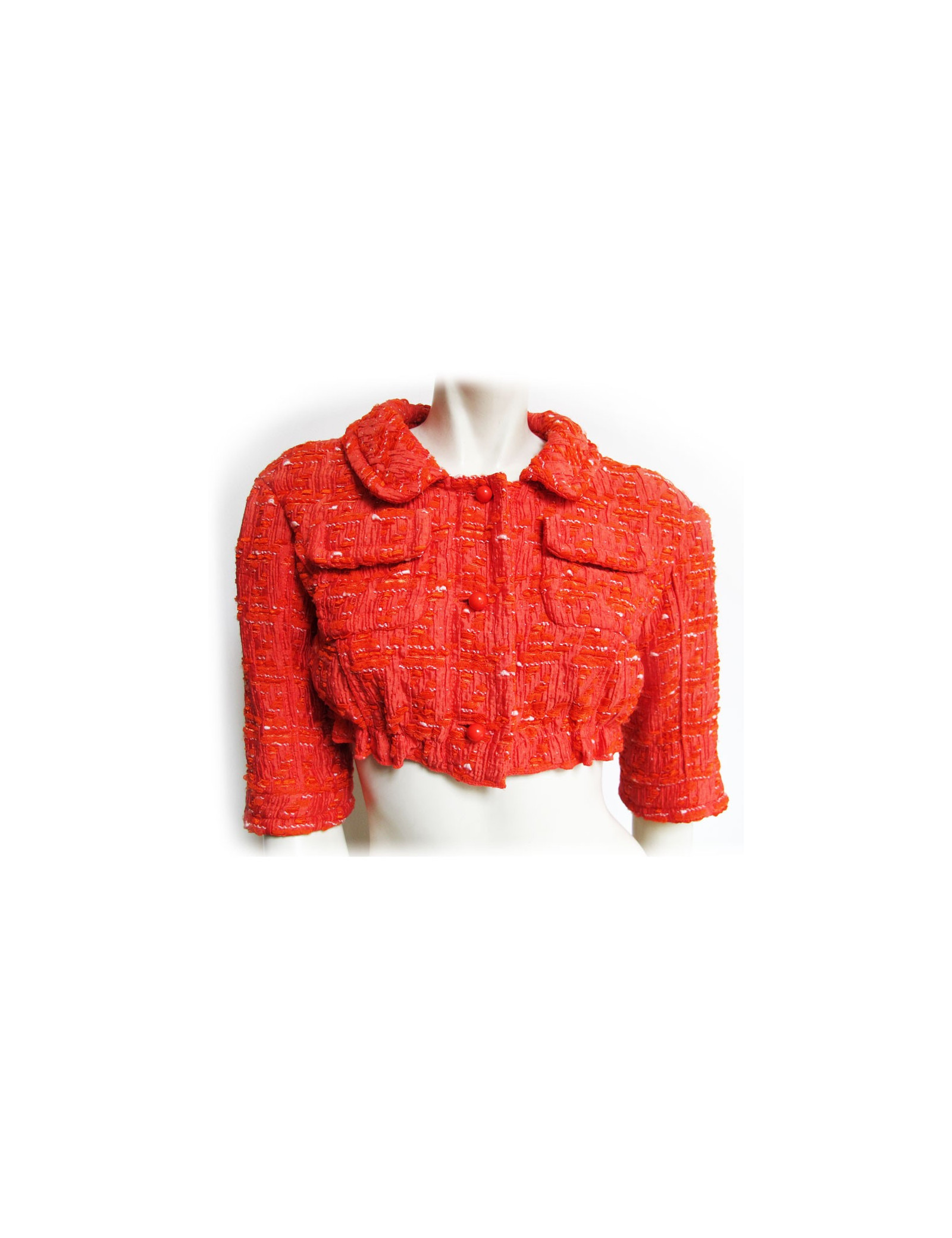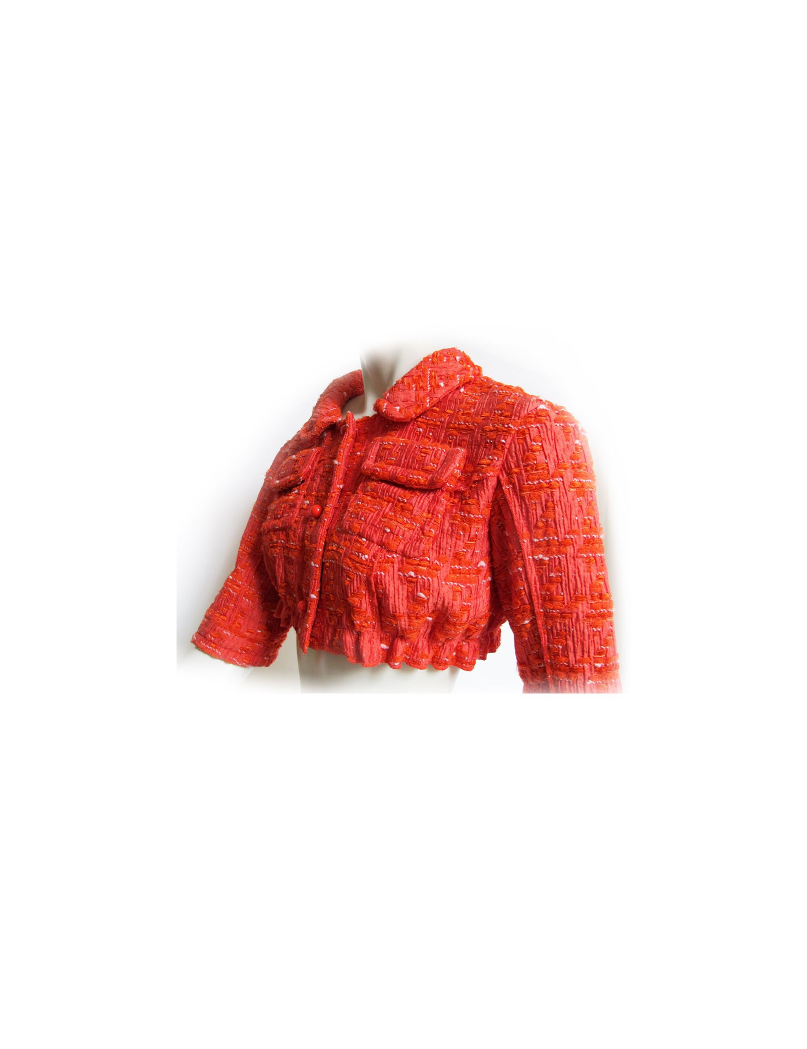 Lovely NINA RICCI short orange jacket. Two flat pockets on each side with a flap. 3 orange plastic buttons.