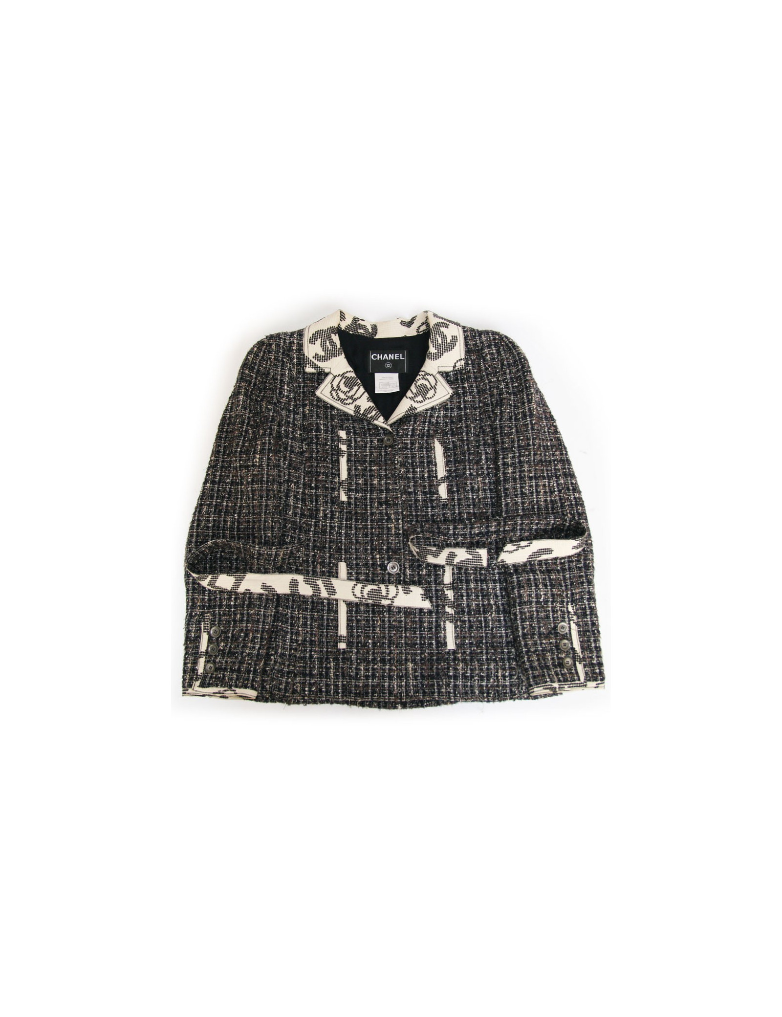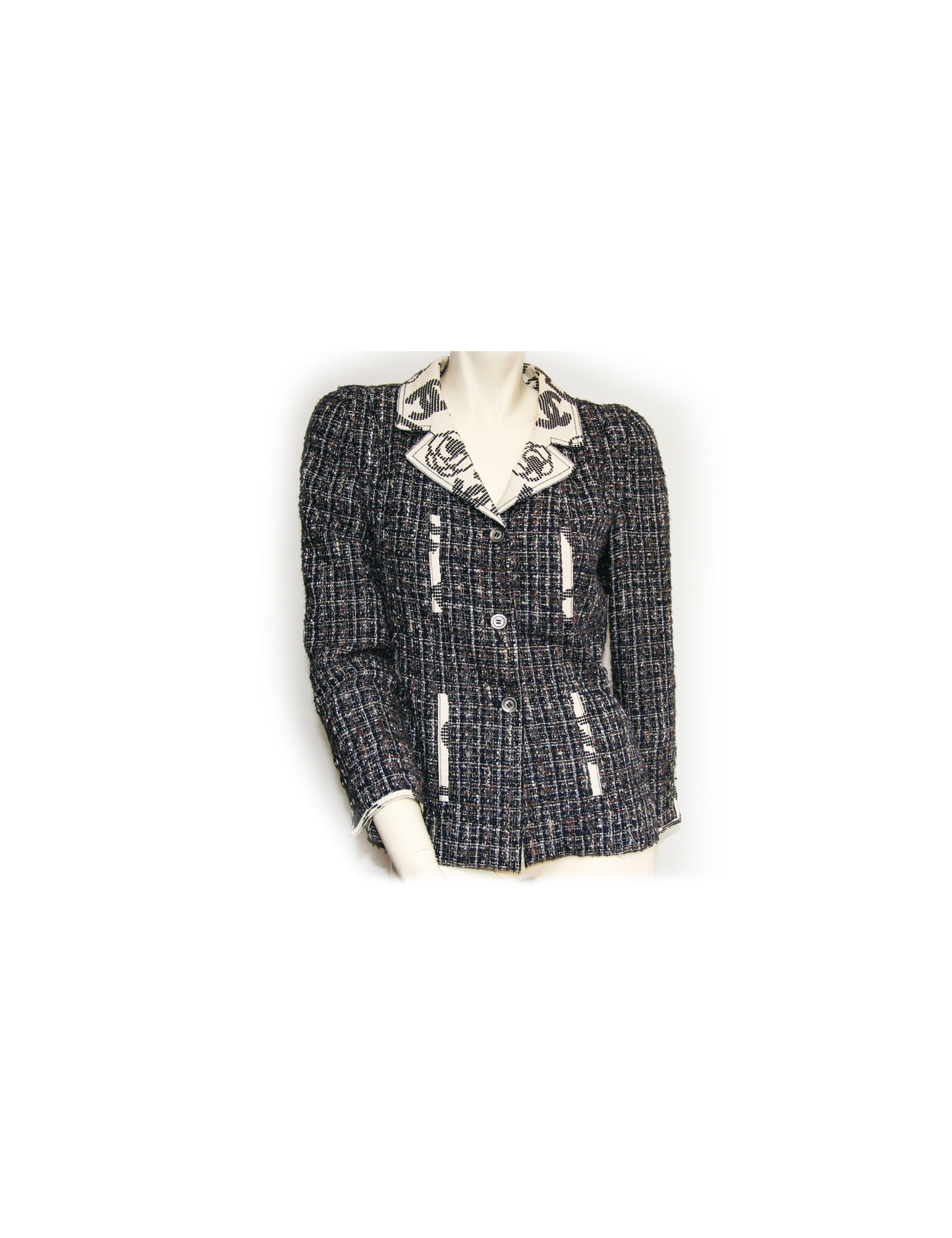 -800.00 € Last items in stock JACKETS CHANEL tweed beige and sky blue T 34 jacket CHANEL 13556 2,400.00 € 3,200.00 € CHANEL tweed beige and blue (white and orange wires) jacket, size 34, Spring-Summer 2009 collection. Two lower pockets adorn the jacket. The silver zipper brings a modern twist to this jacket. A little extra pressure button to also close the collar of the jacket. White lace details surround all blue edgings of the jacket. The lining blue silk, in perfect... Add to cart