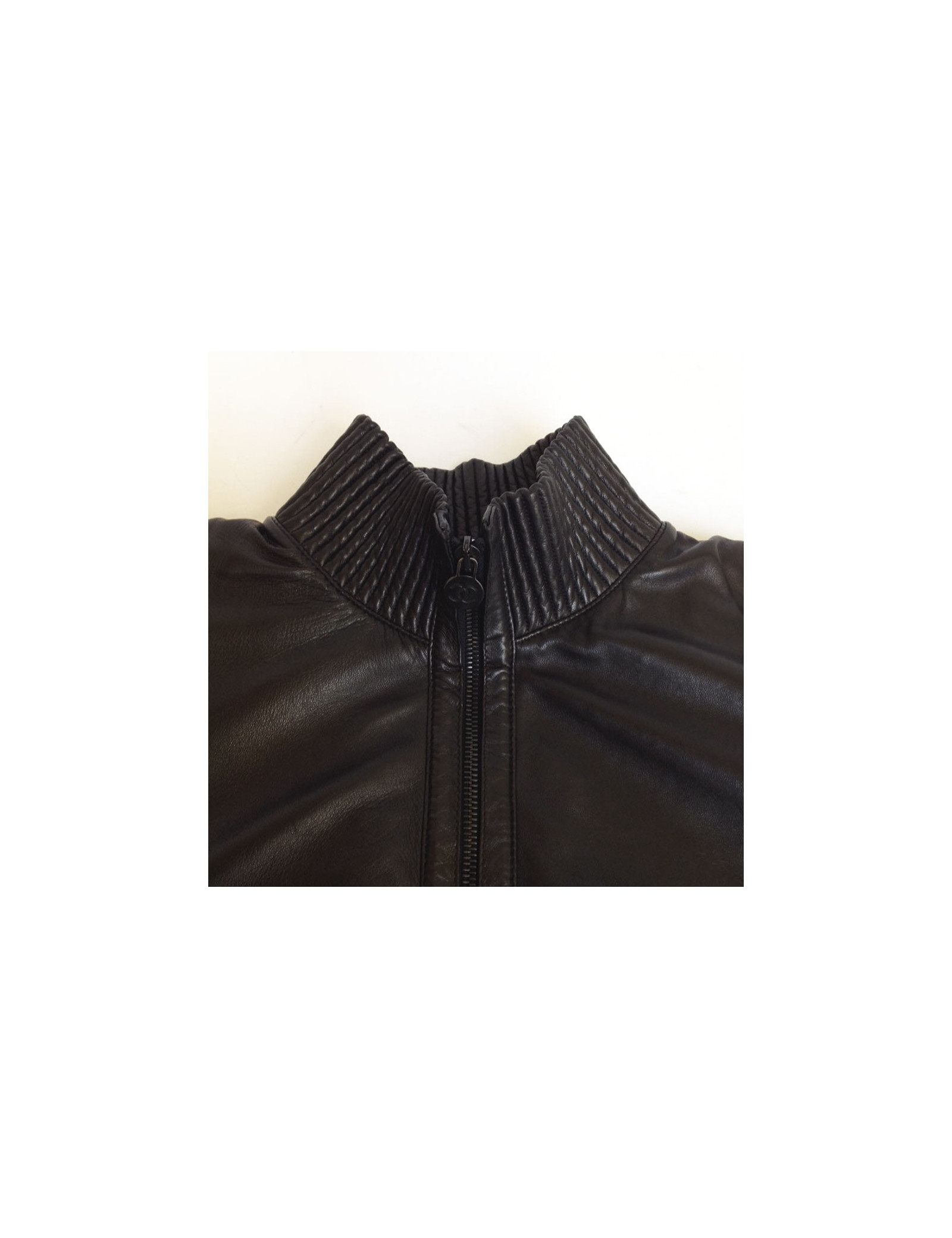 Chanel jacket in wool and lambskin black T40. Two patch pockets at the waist. It is tightened at the waist. It bears the initials CC on the left shoulder. In very good condition. It has a small tear under the right arm, see picture.