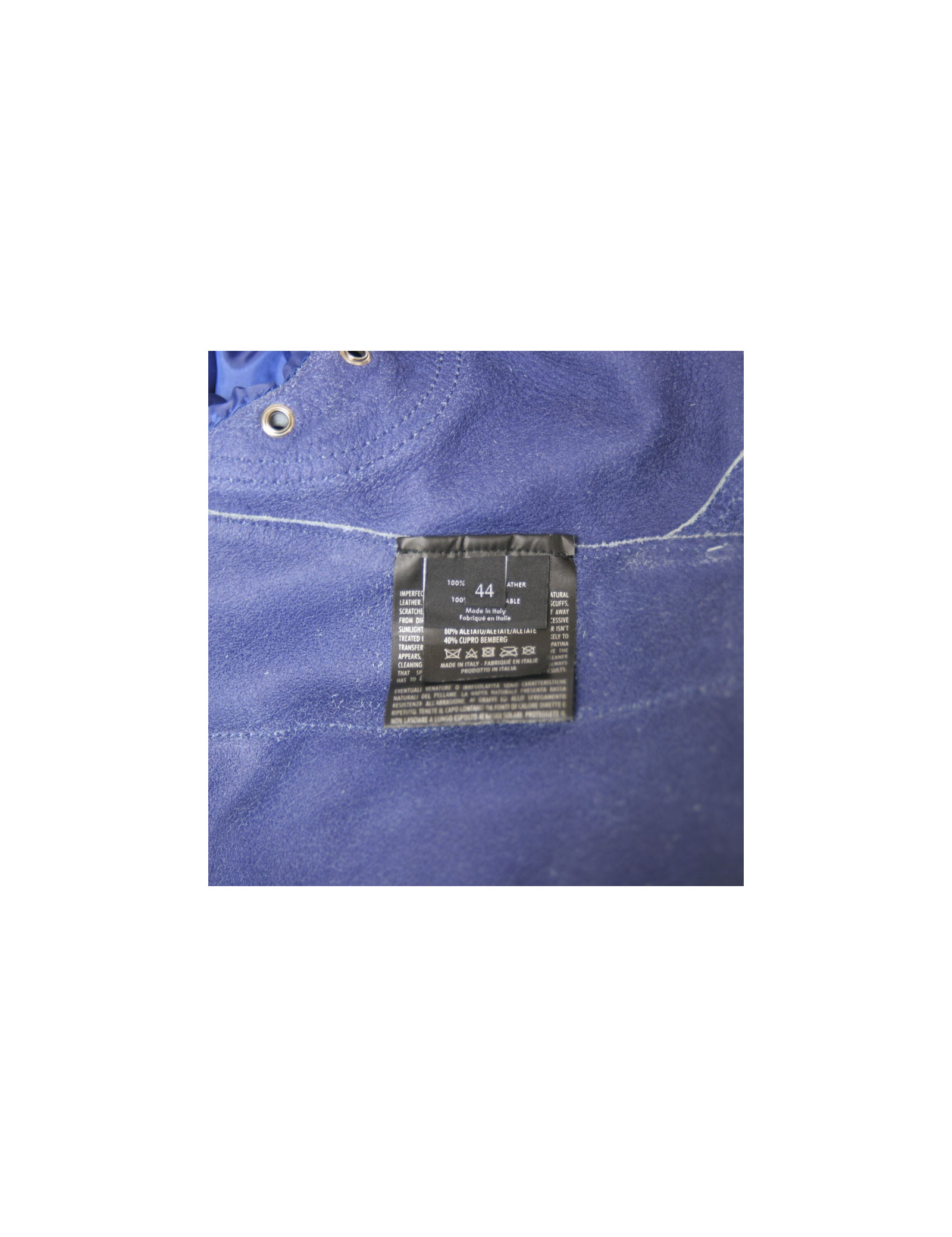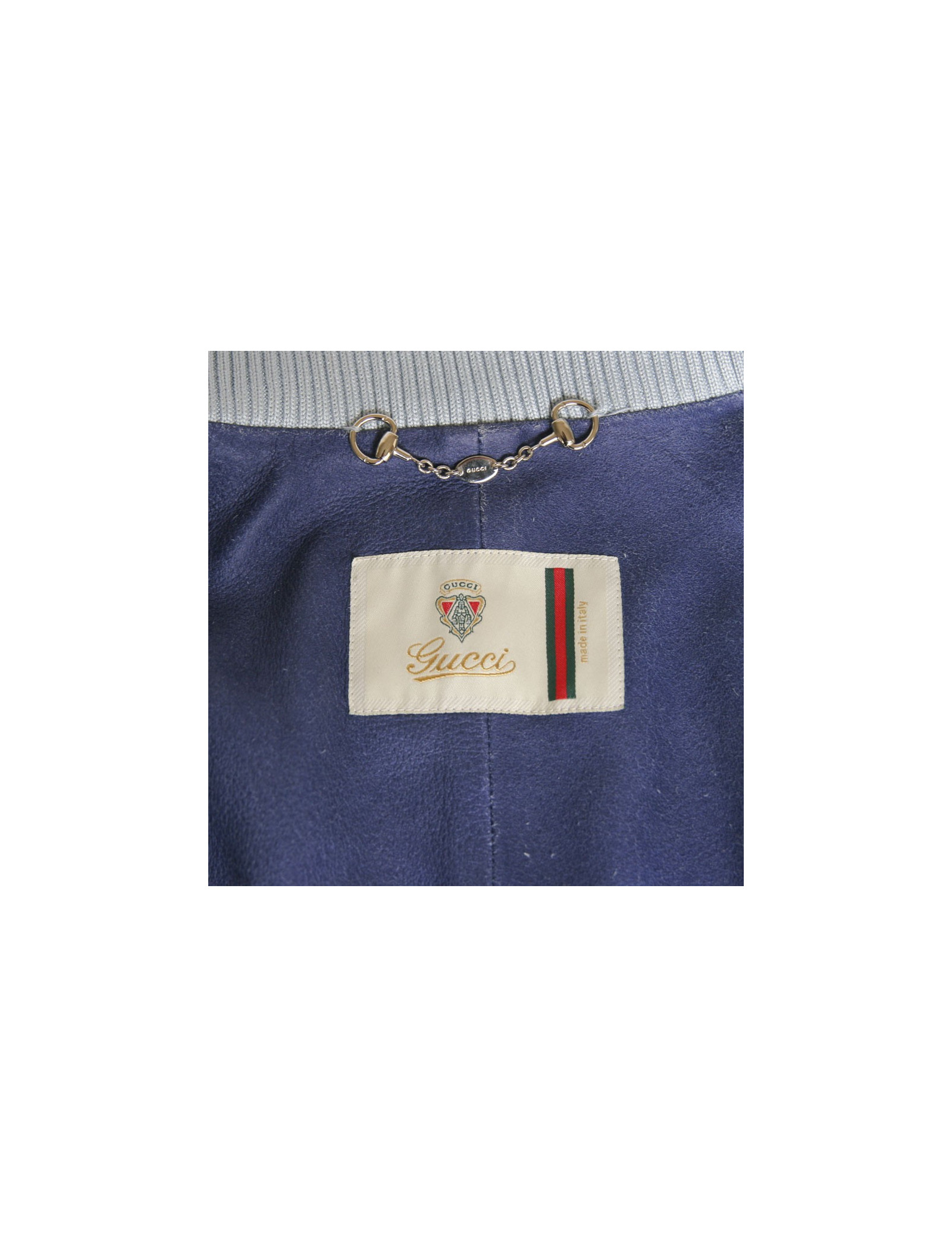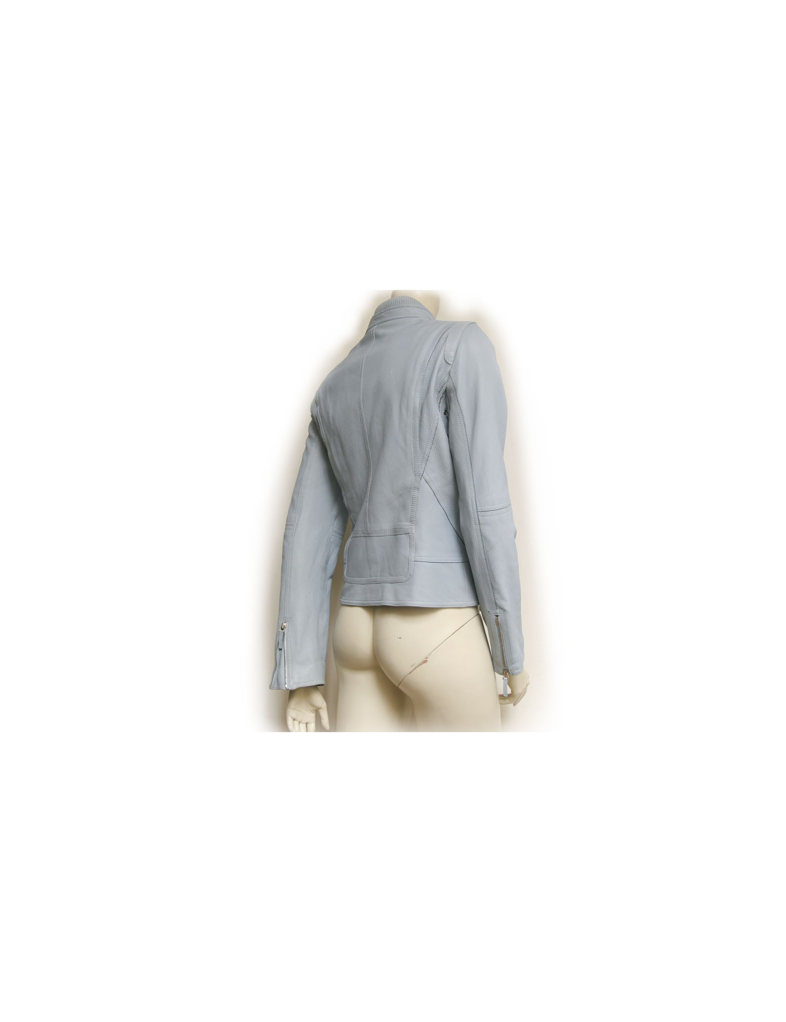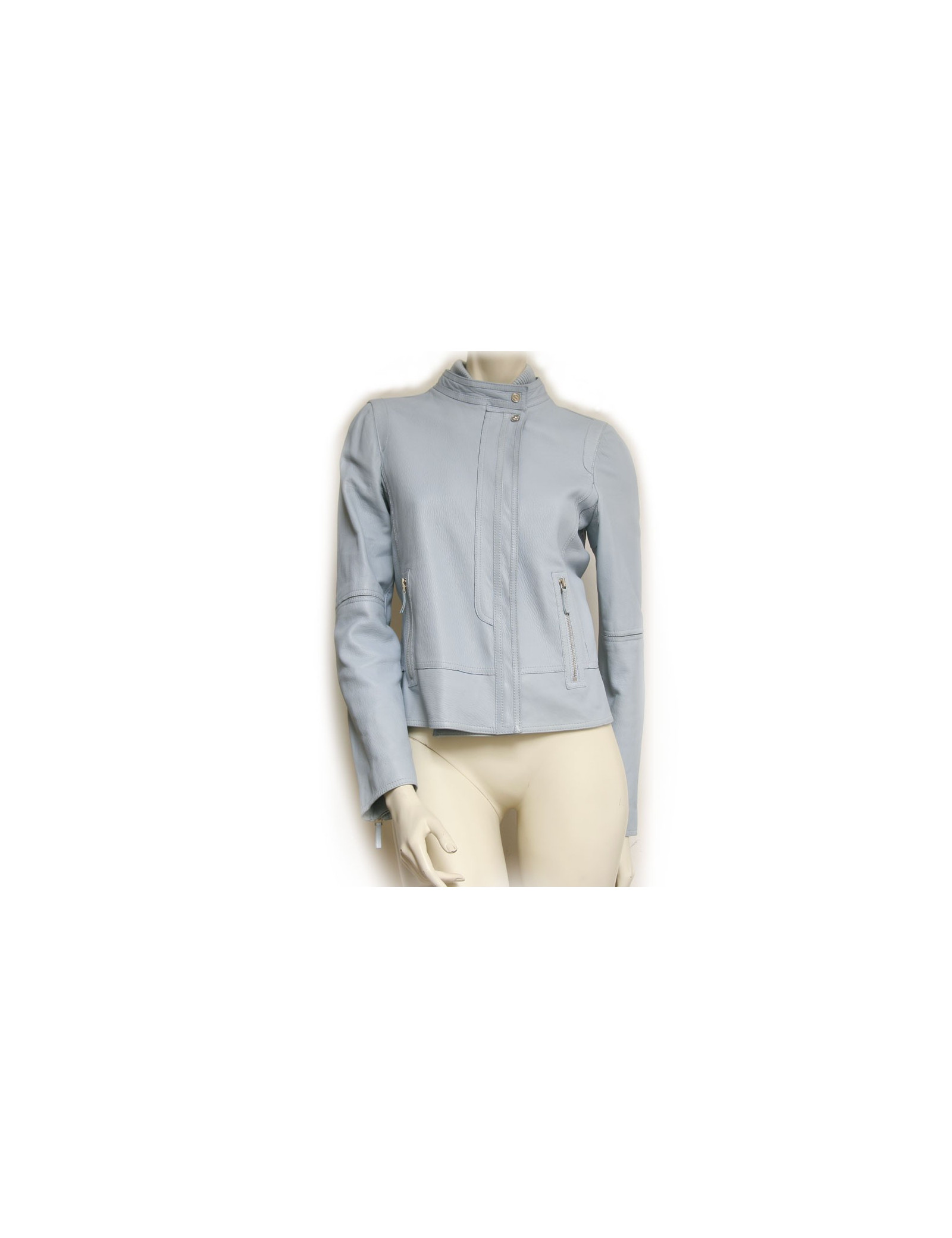 Sky blue Gucci leather jacket. Size 44 Italian is equivalent to a 40 french. Zipper closure. Two zipped front pockets. Ceintree. Closing pressure down and up to the cervix. Col stretch cotton. In very good condition. Small patch on the right sleeve.