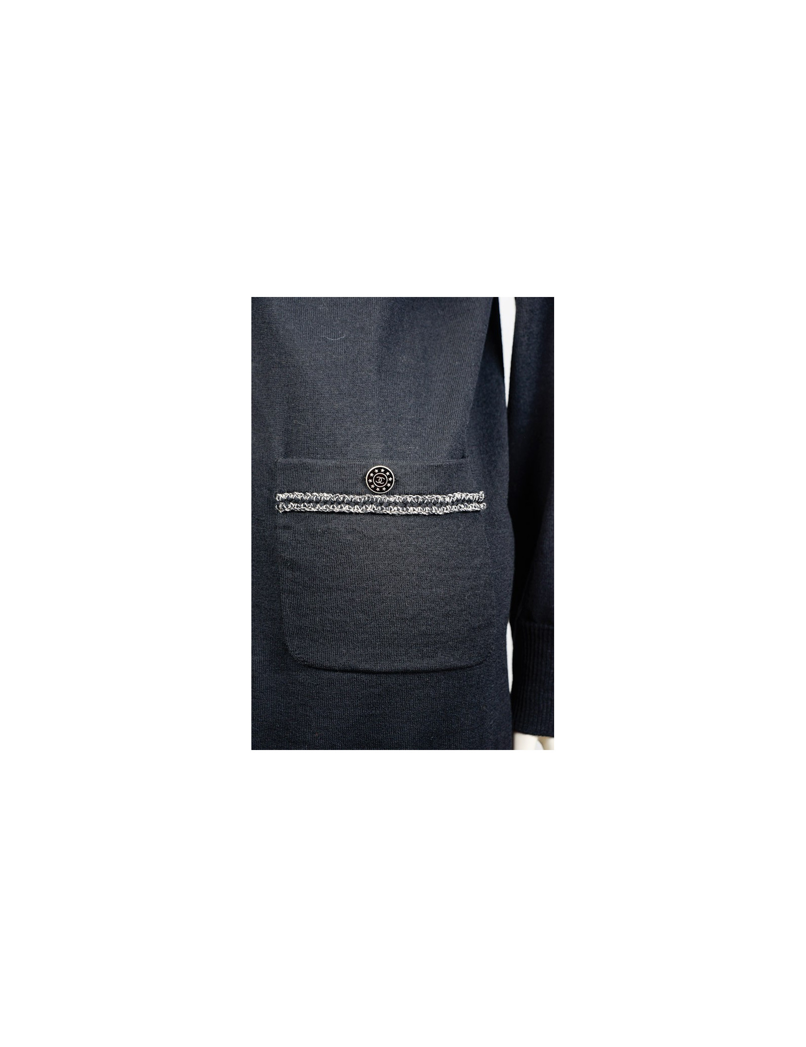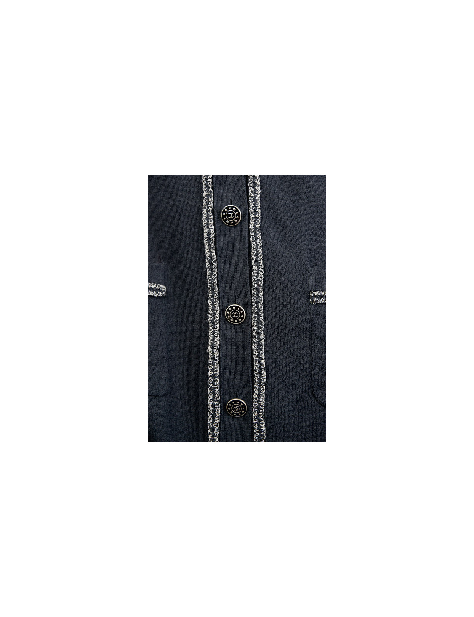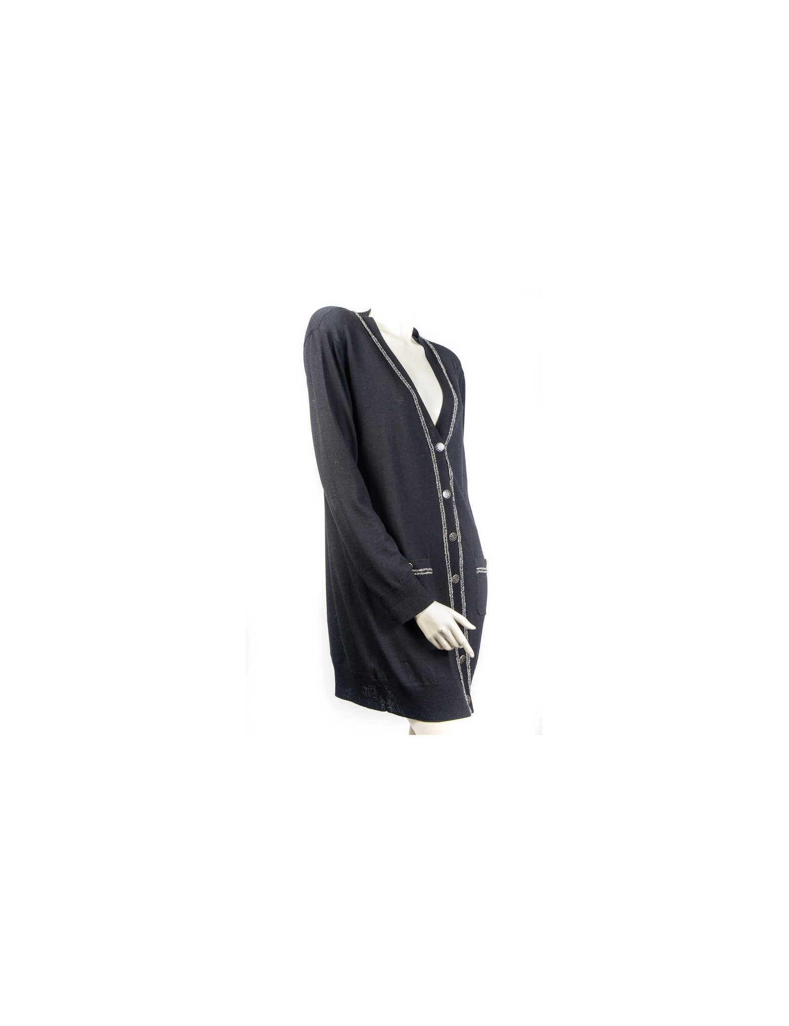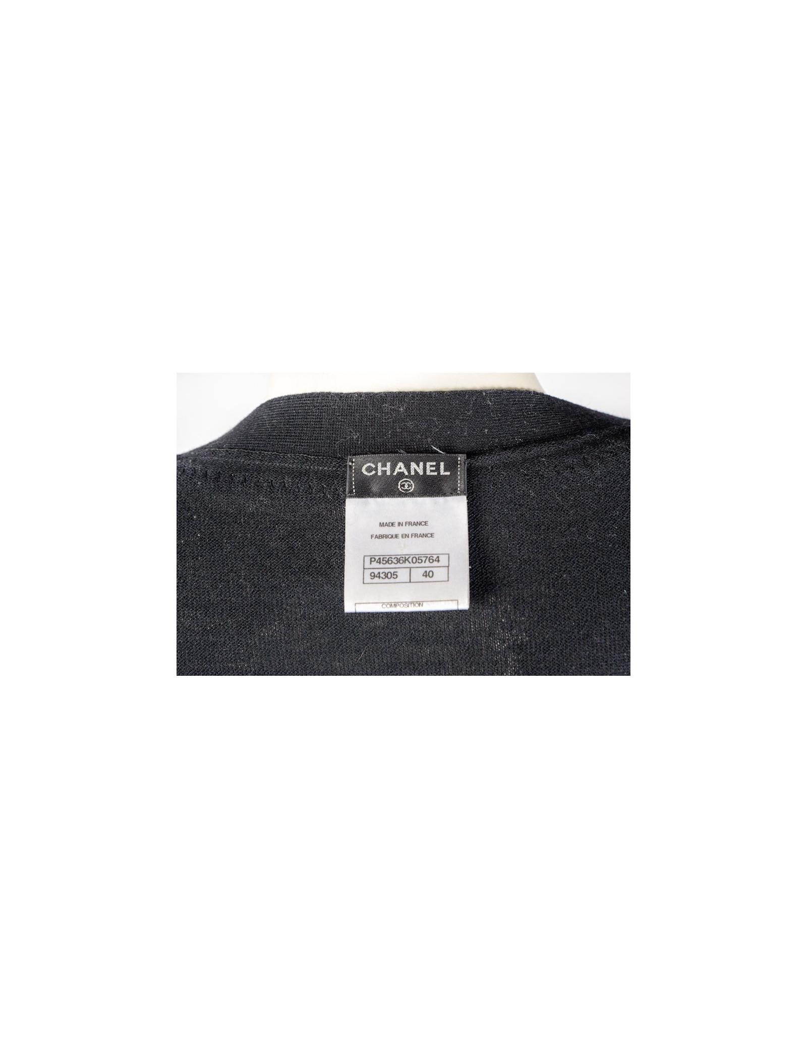 Long black jacket in wool iconic of the House of Chanel, with black and white trimmings. Size 40. Current collection. Retractable shoulder pads. In very good condition.
