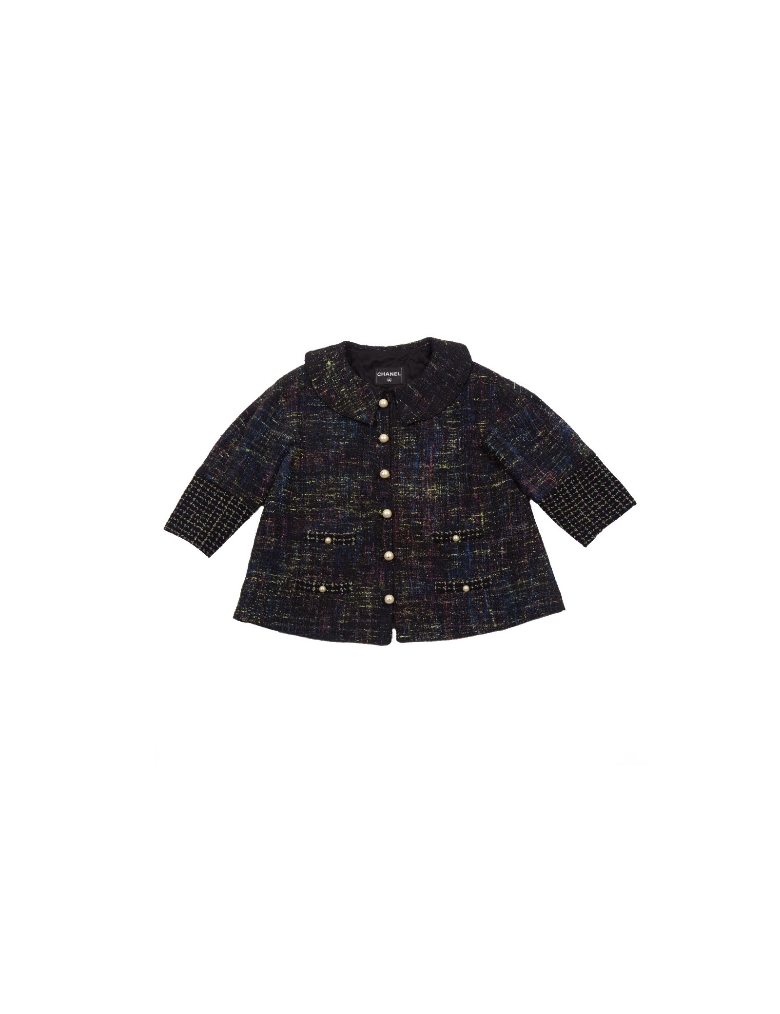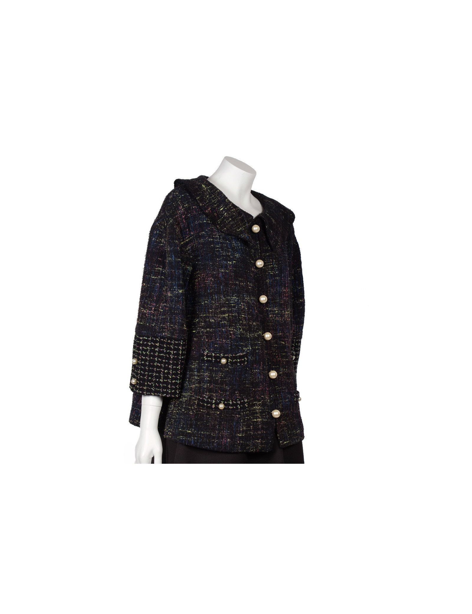 Gorgeous Chanel jacket a-line tweed and Pearly pearls, summer 2012, the tweed jacket is colored green, blue and Fuchsia on black background. There are two pockets of each side of the jacket, the main closure is zippered, the jacket features six fake buttons of pearly beads fasteners, the sleeves are flared at the bottom and has two buttons in Pearly beads. No label size/composition