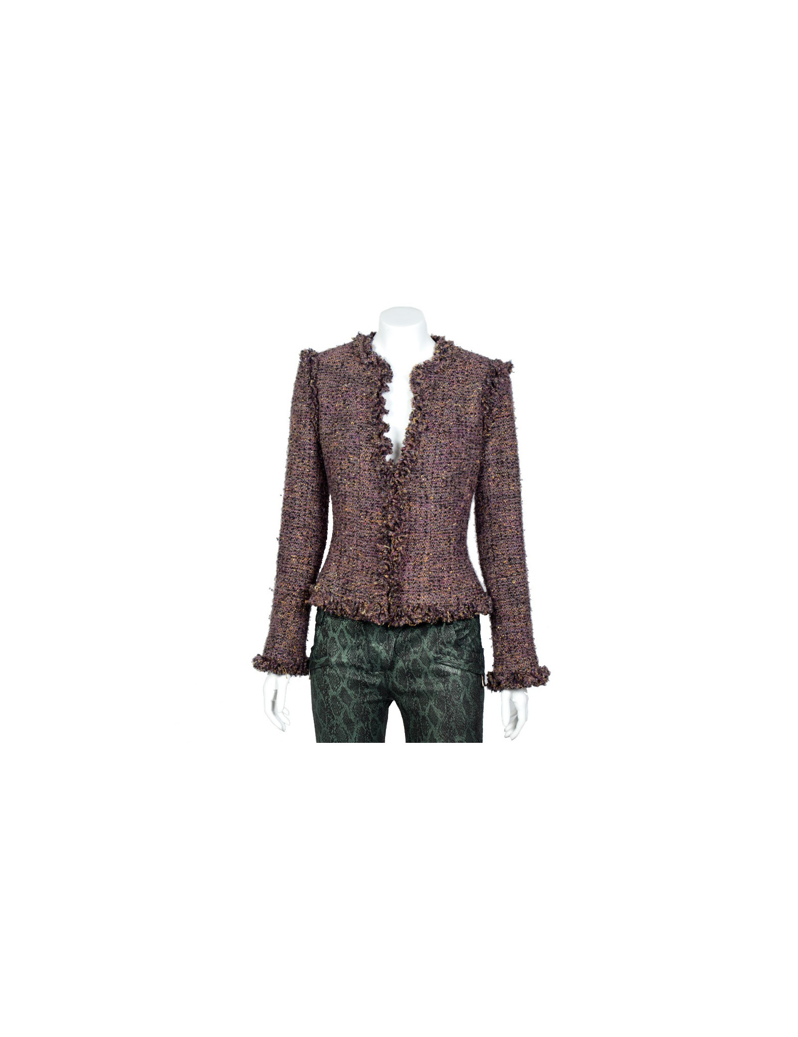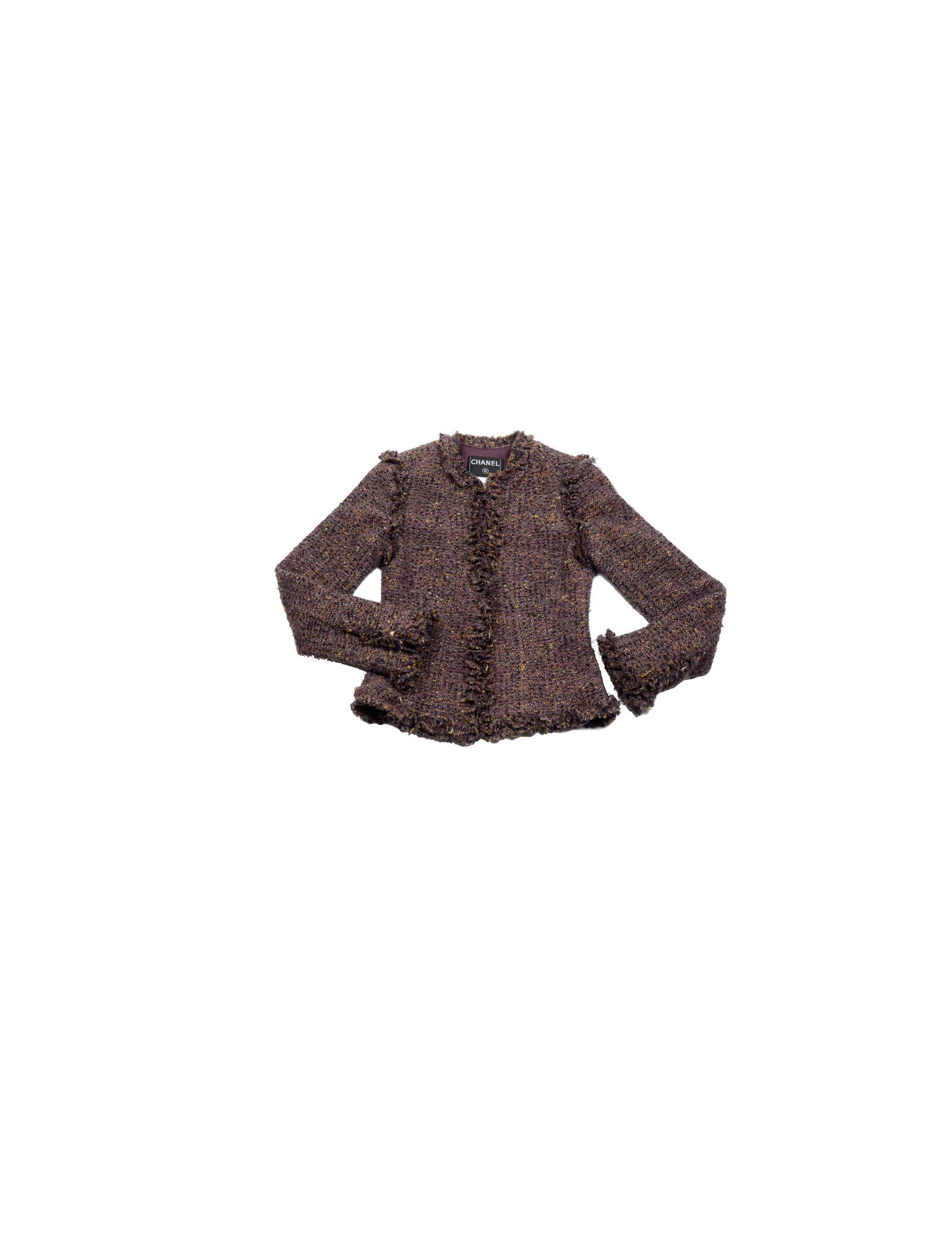 Plum tweed Chanel jacket. Size 40. Edges in short mesh at wheel placed sleeves, neck, buttonhole and shoulders. Vest pocket with slots open to the wrists. Buttons gold picot-shaped armholes. Plum silk inner lining. Very good condition.