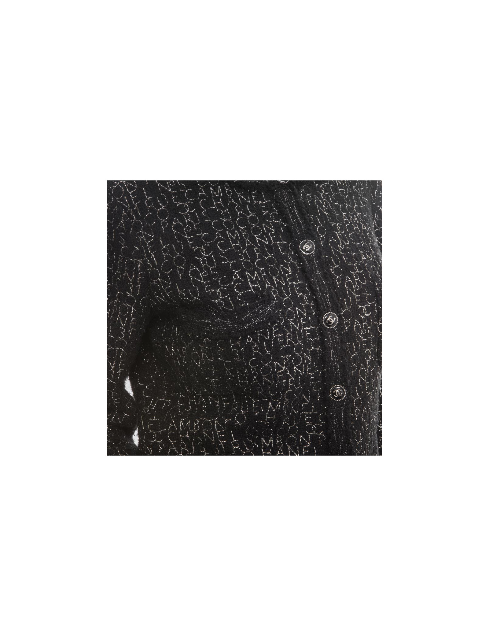 CHANEL jacket in black tweed embroidered with silver thread 'Coco, Cambon Paris, Chanel'. Collection Spring / Summer 2007. It closes with 6 black and silver enamelled buttons "CC". Two small pockets at the front. The lining is black silk monogram.