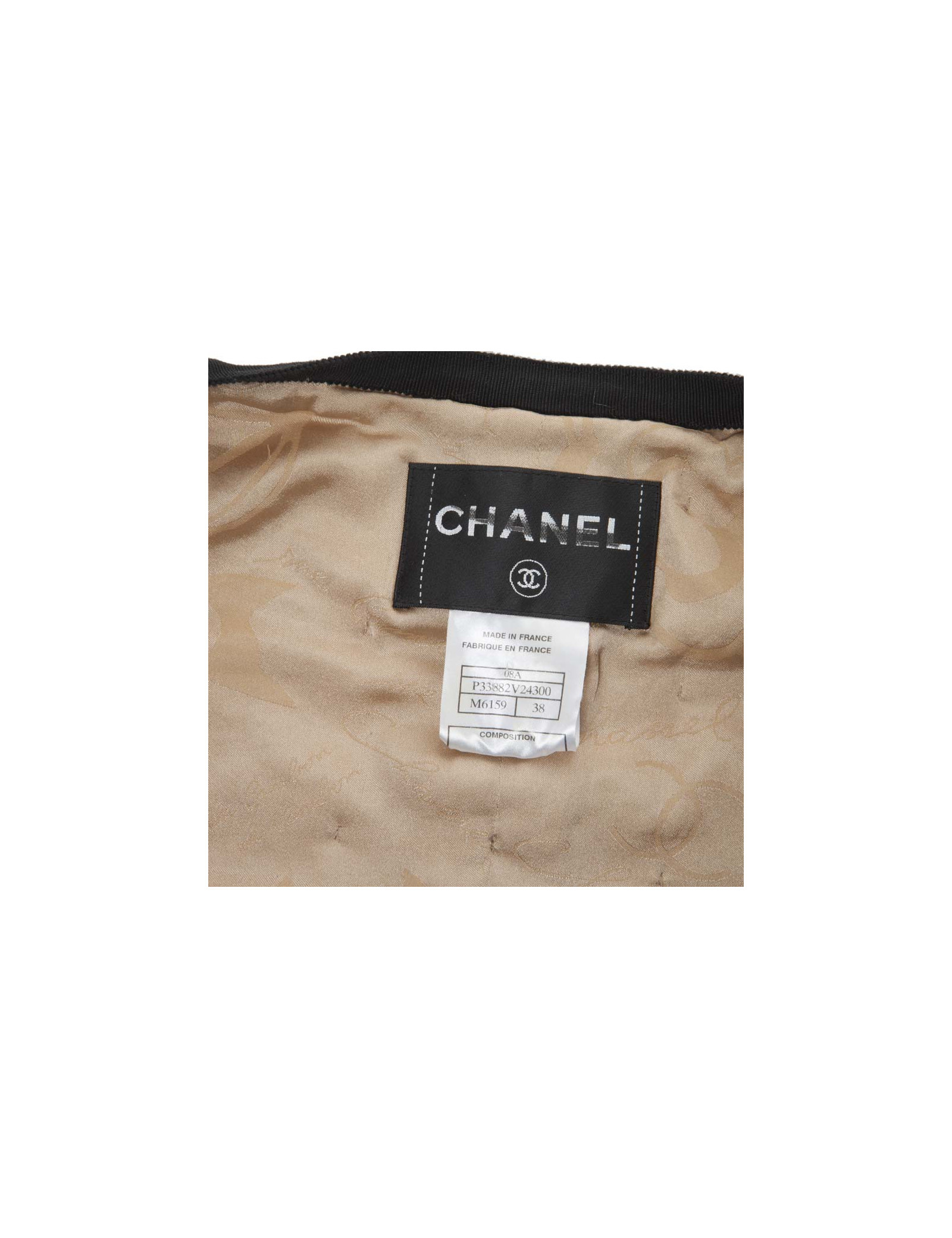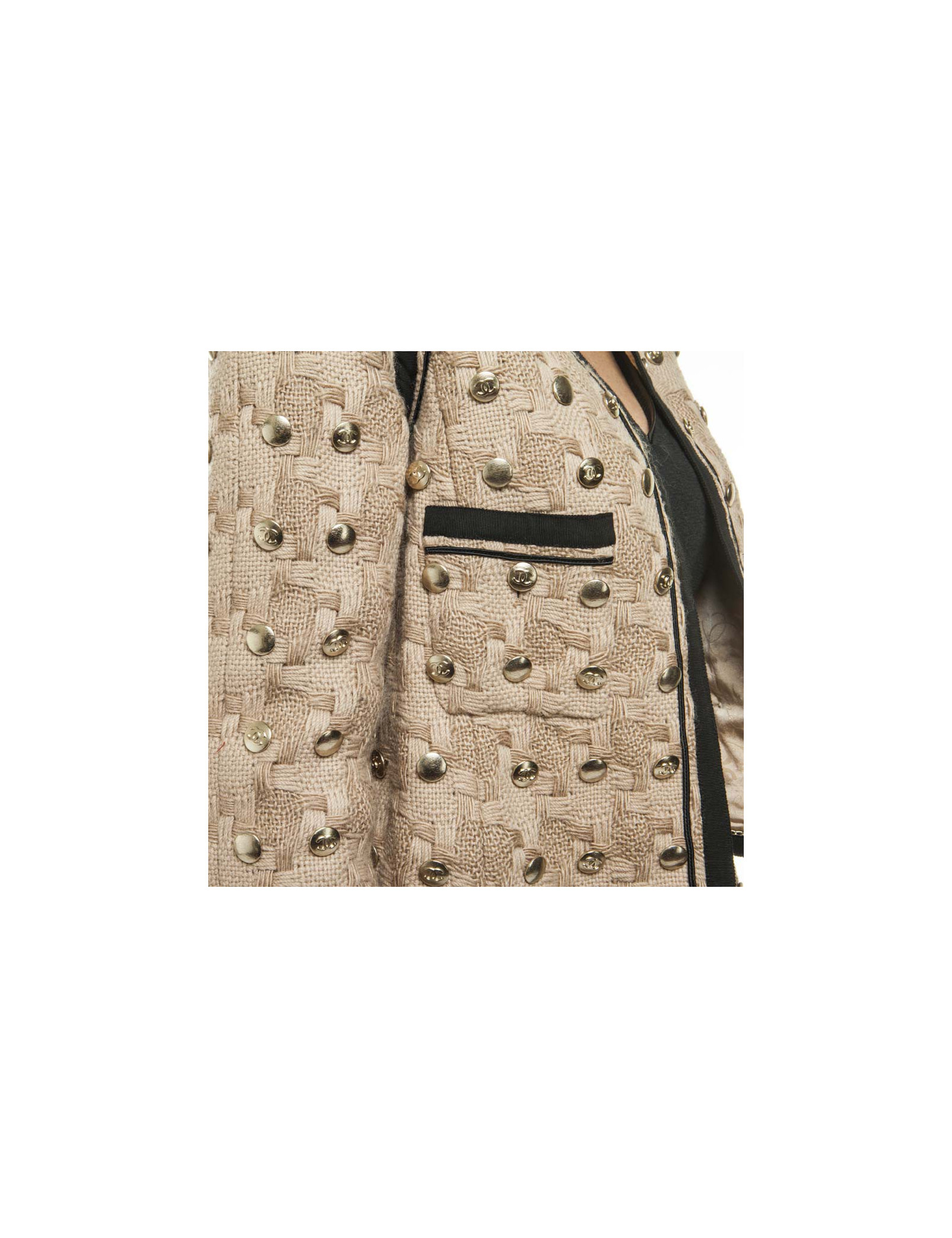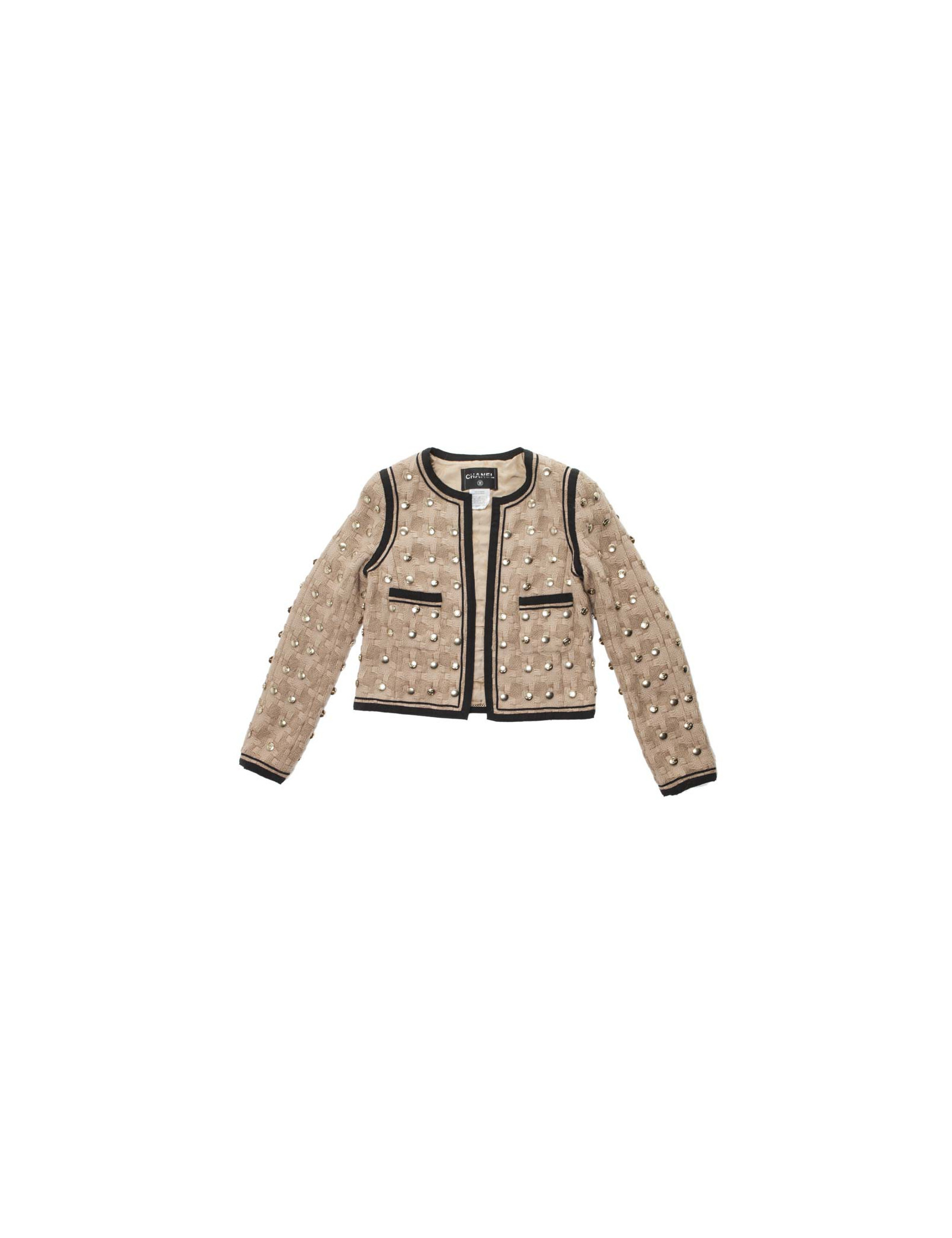 Collector Automne 2008, veste courte Chanel, en laine beige bordé de bandes noires, entièrement cloutés (boutons), siglés CC et neutres, doré mat. La doublure est en soie 100% monogramme. Le bas se termine par un chainette dorée. Il y a deux poches. Taille 38. En très bon état.