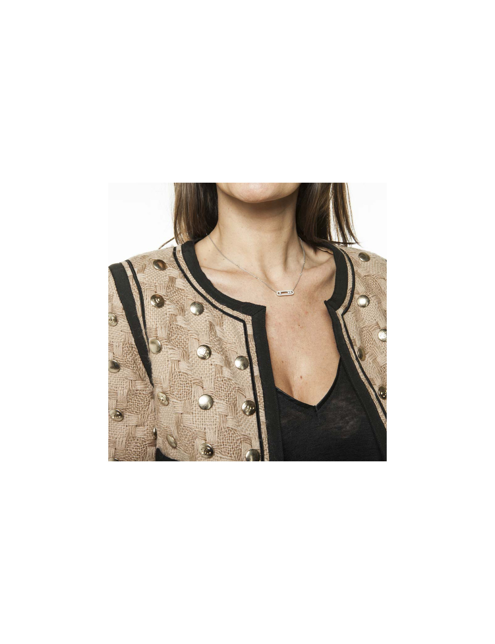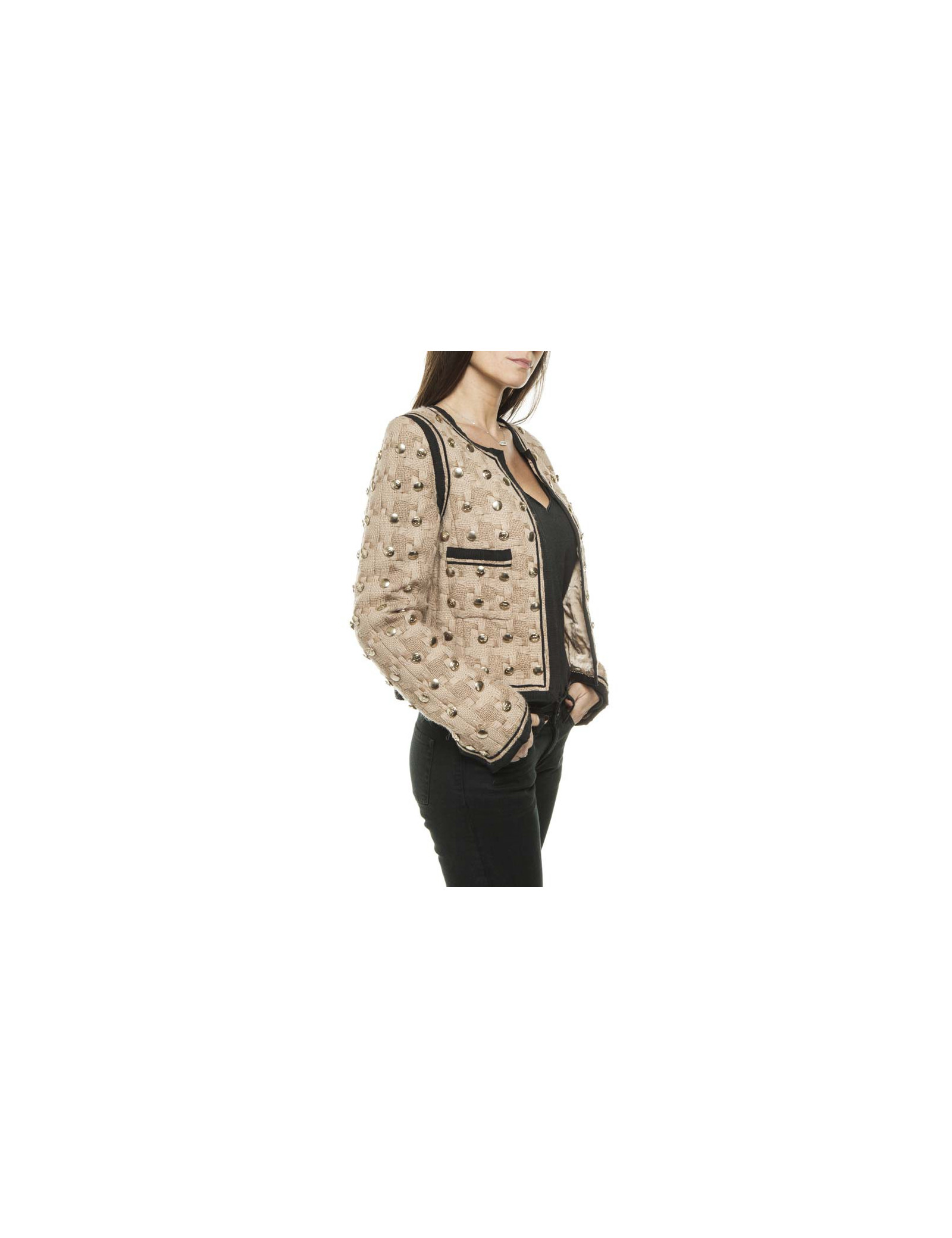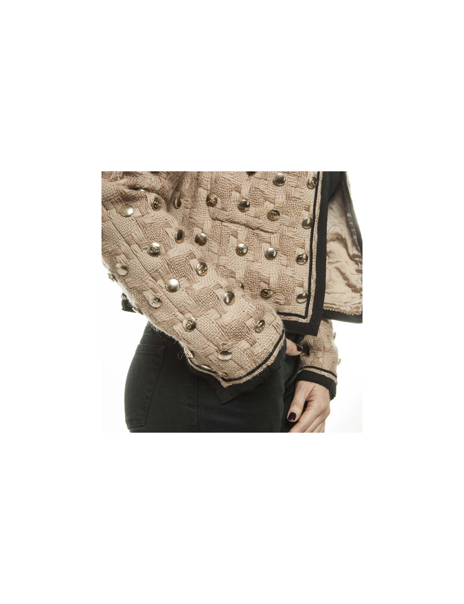 Collector Automne 2008, veste courte Chanel, en laine beige bordé de bandes noires, entièrement cloutés (boutons), siglés CC et neutres, doré mat. La doublure est en soie 100% monogramme. Le bas se termine par un chainette dorée. Il y a deux poches. Taille 38. En très bon état.
