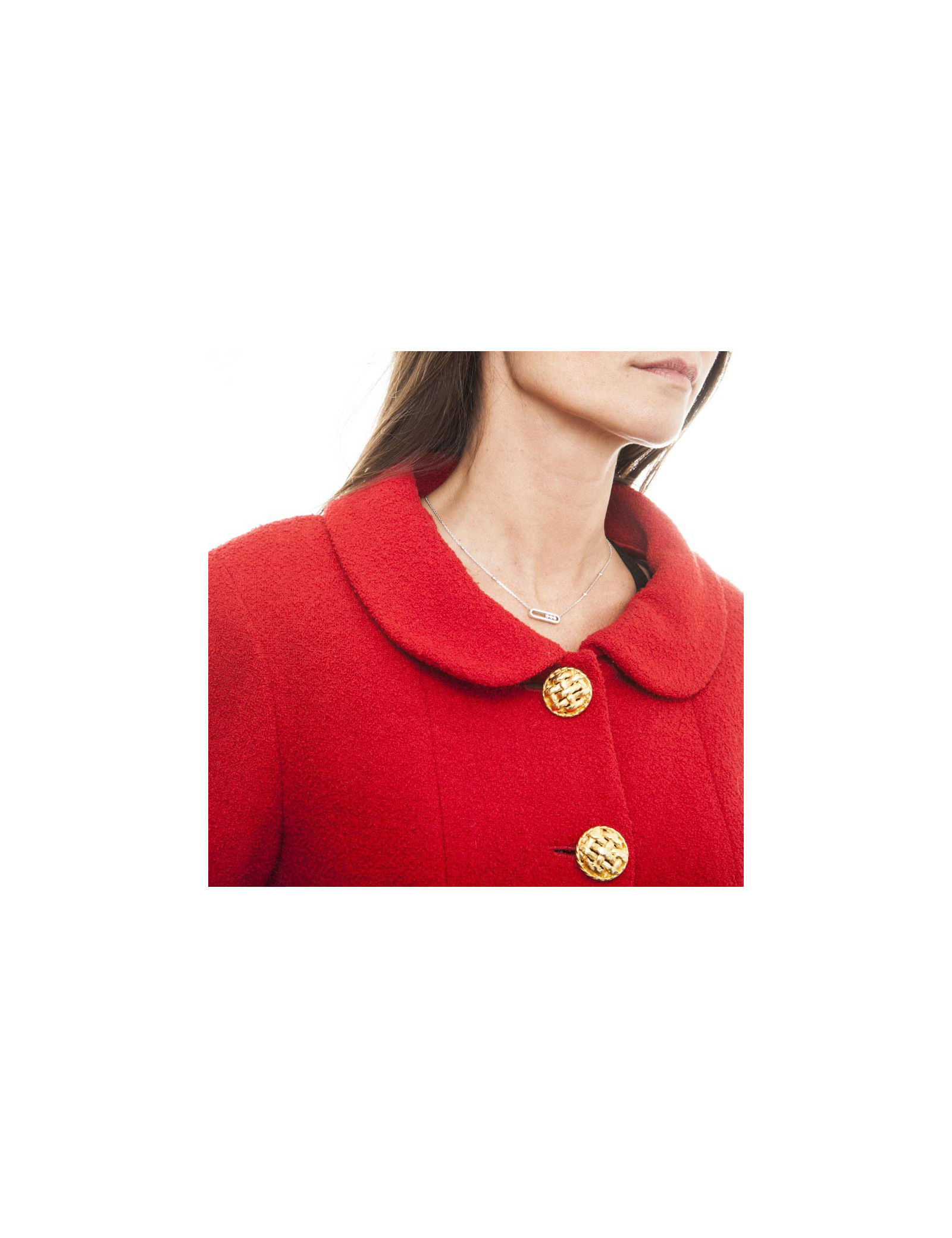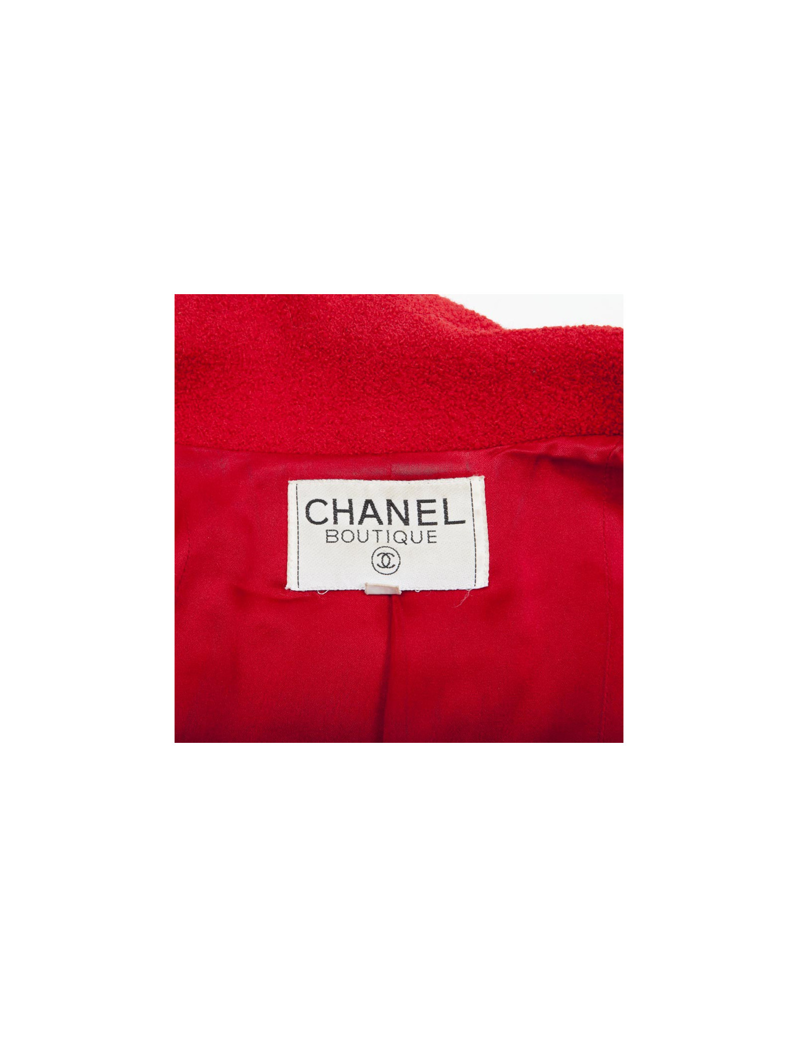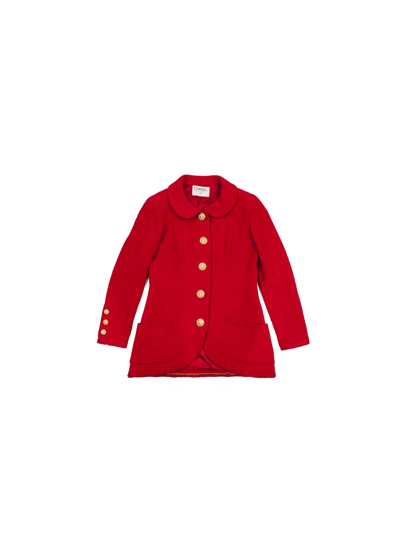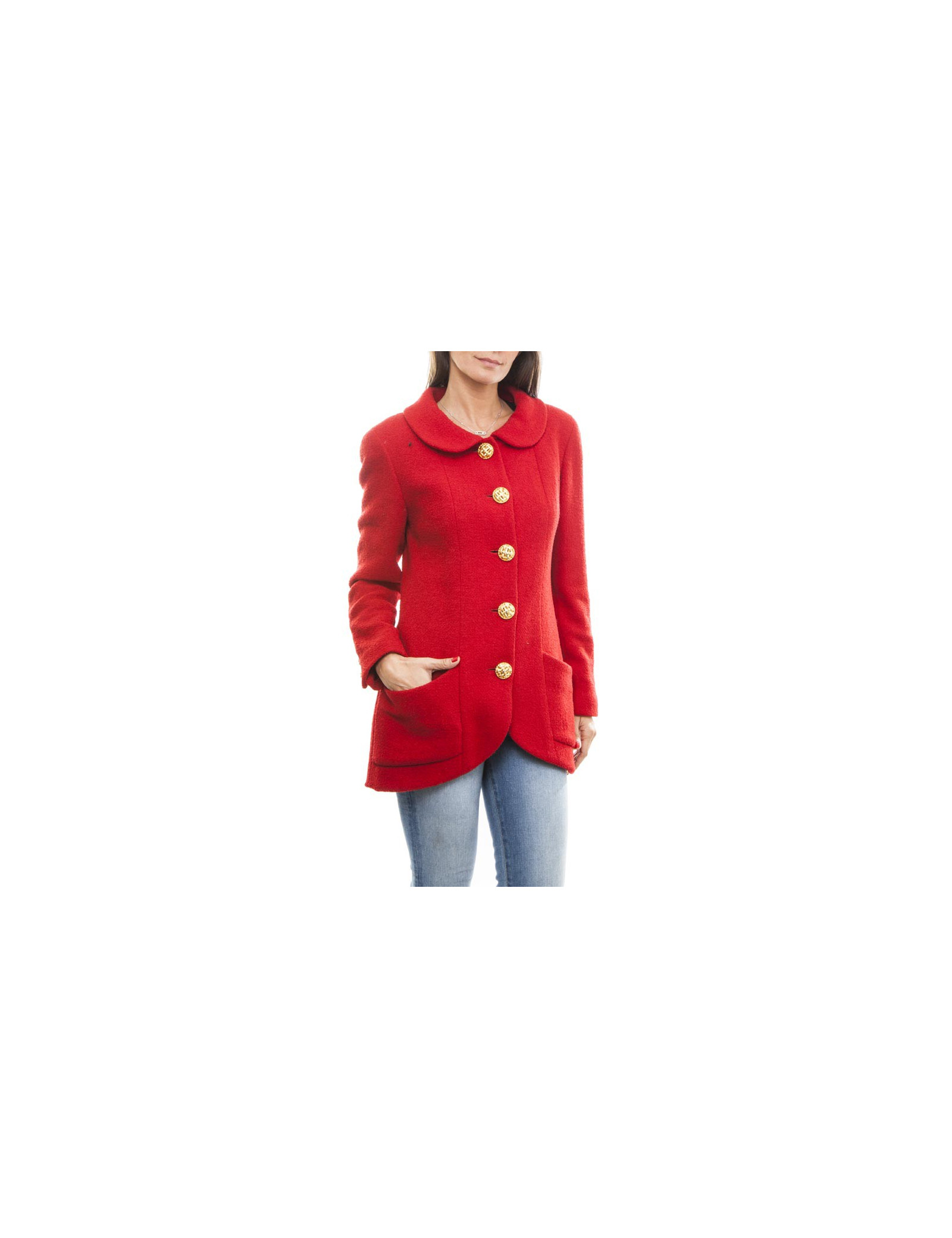 Chanel jacket in red wool lined with red silk (no label of material), closed by four big gold buttons with two pockets veneered. The sleeves are long with three smaller buttons.