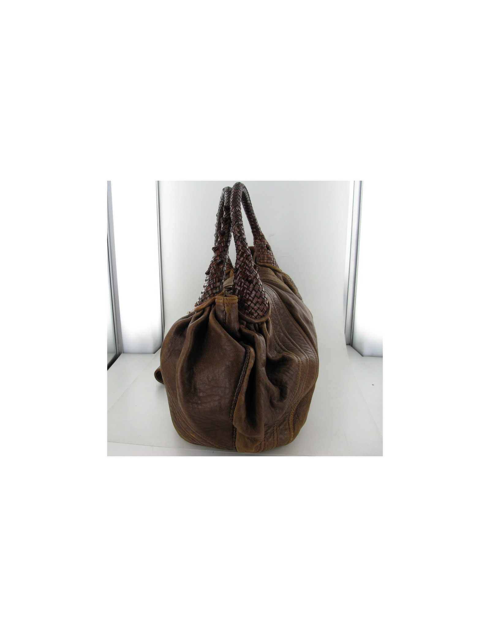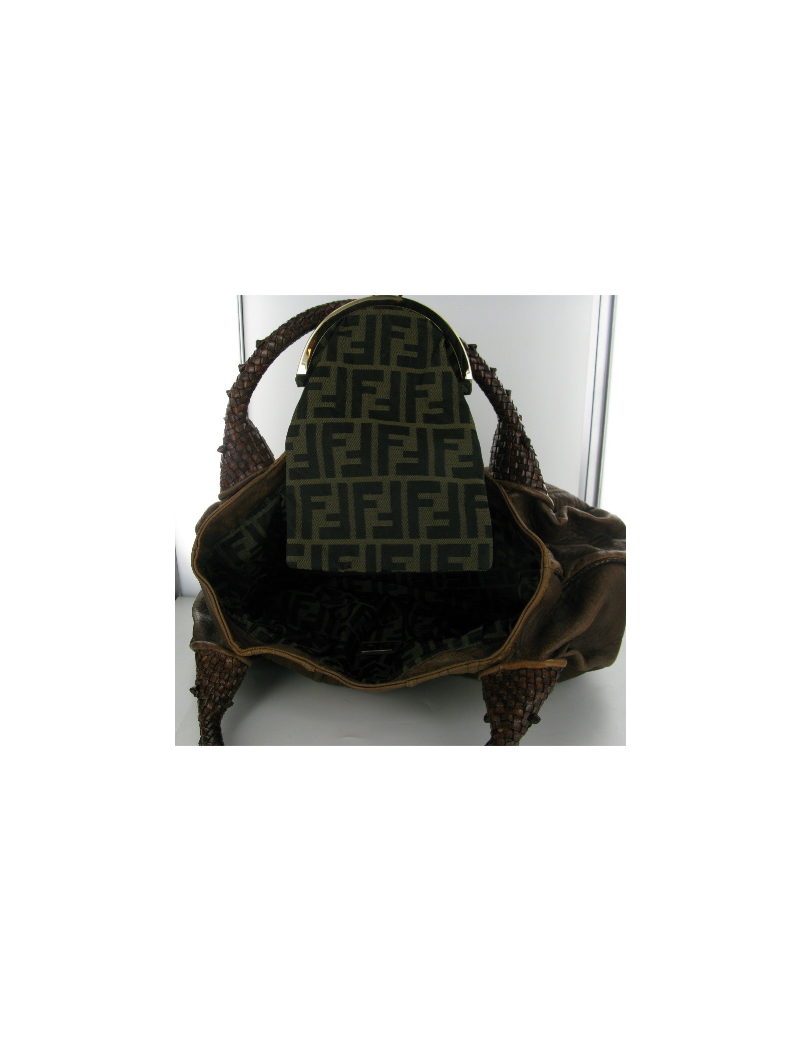 Superb hand brown leather FENDI Spy bag. The handles are brown braided leather, they are 45 cm. The jewelry is made of gilded brass, inside is fabric monogram. This bag has a Pocket door way currency. The leather is skated, use on corners wear.