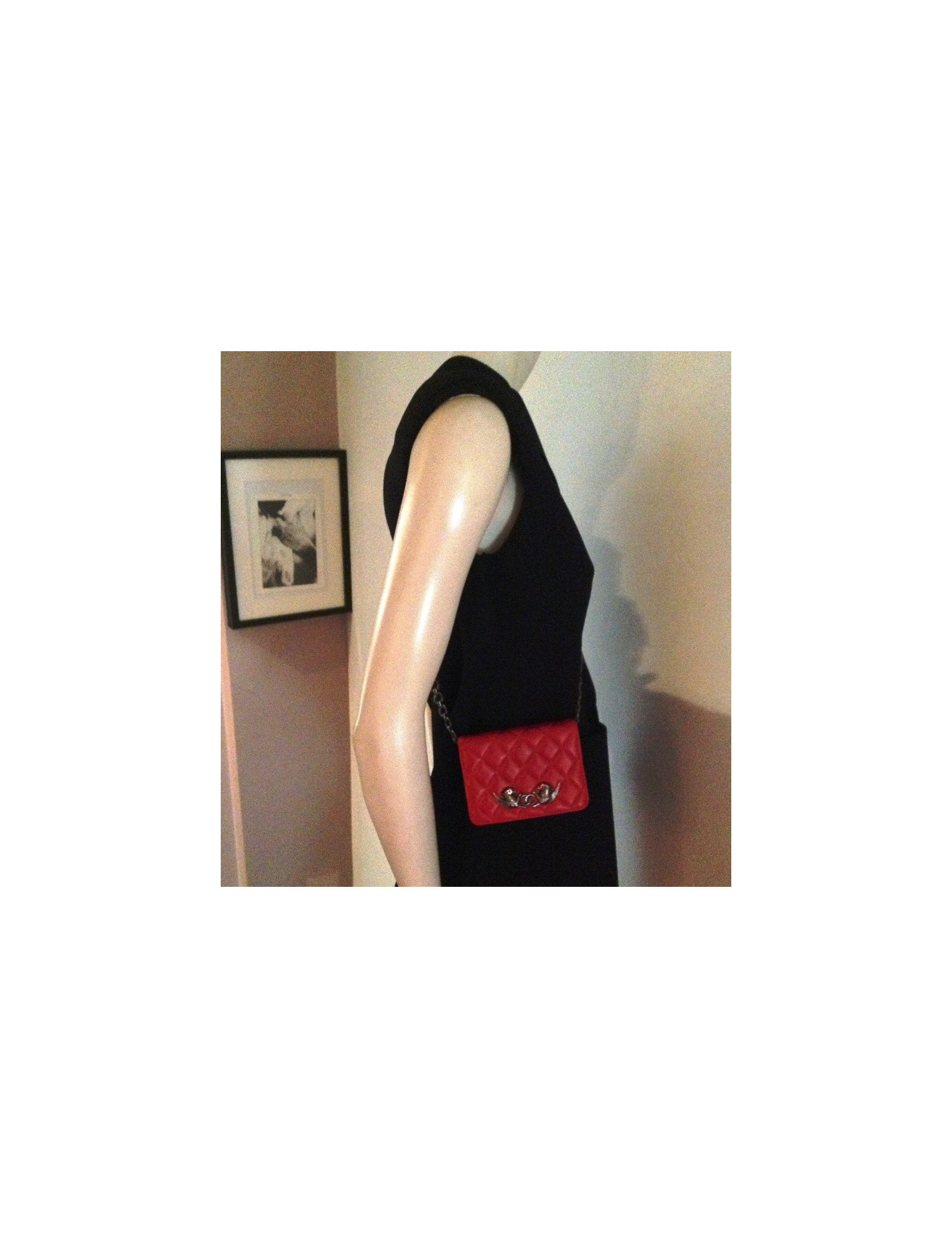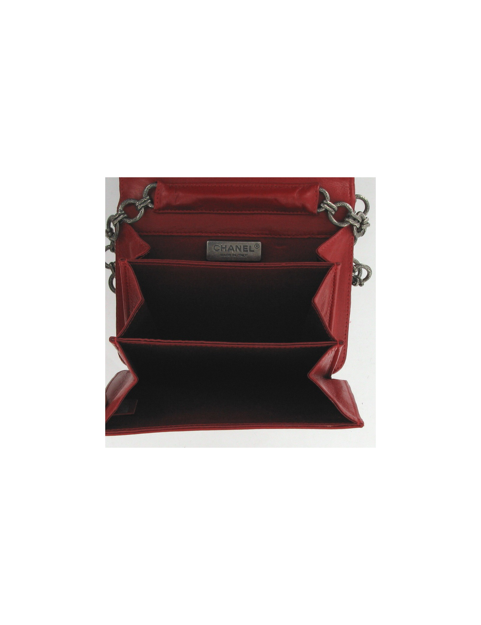 Beautiful small CHANEL bag in red quilted lamb. The jewelry is silver aged, it is distinguished by a clasp representing two winged lions. It has a flap closure, inside is red silk. There are 3 bellows and an inner door. The strap is a silver age string chiseled links, it is 98 cm. S of balances.