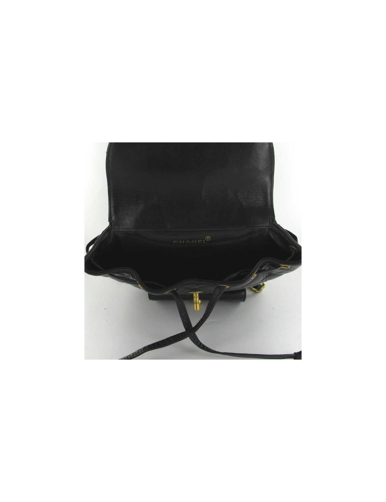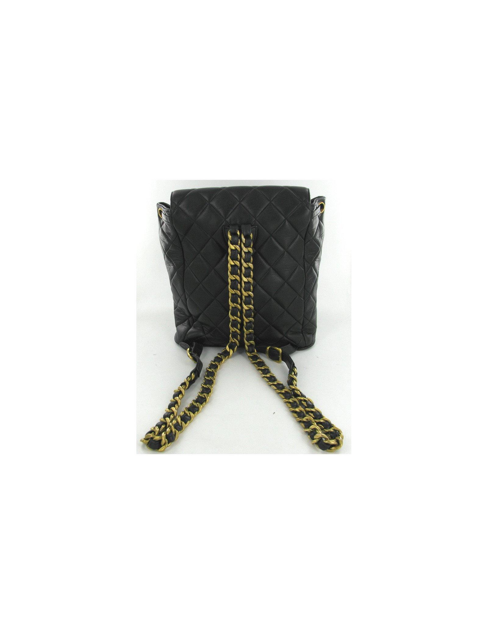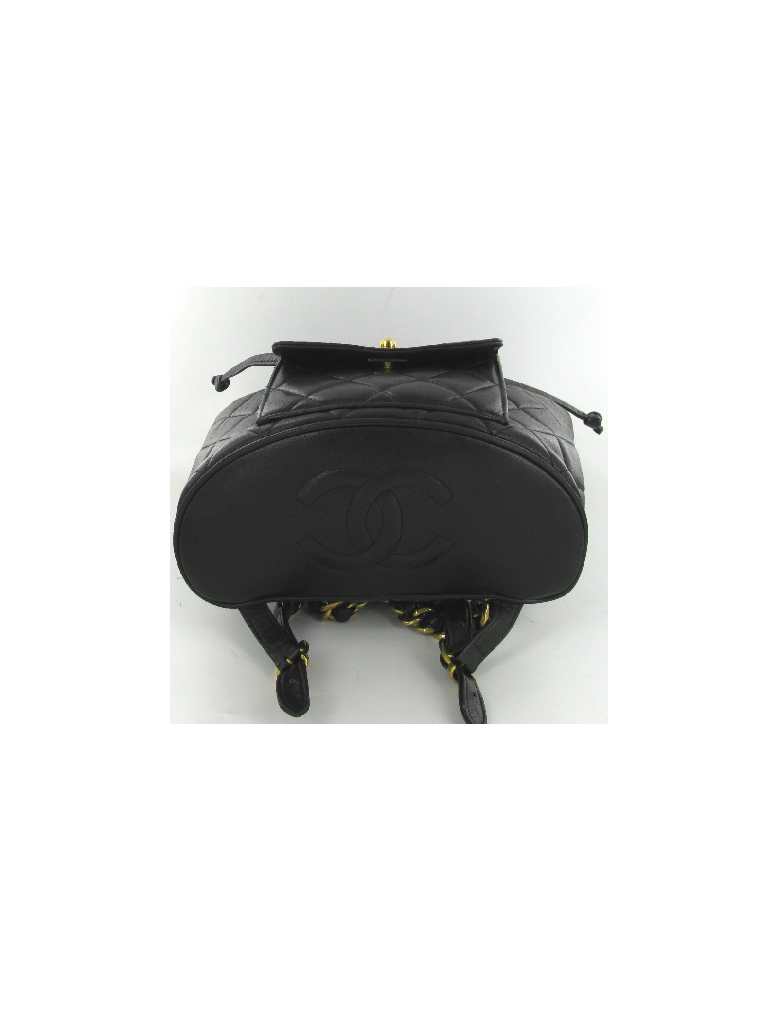 Sublime backpack vintage CHANEL black quilted lamb. Jewellery is gold, the background is embroidered a great CC and the Interior is black leather. There is a front pocket, closed by a flap with a golden clasp CC. Suspenders are strings but old mixed black leather, they are adjustable and measure each 70 cm. It dates from the years 94-96.