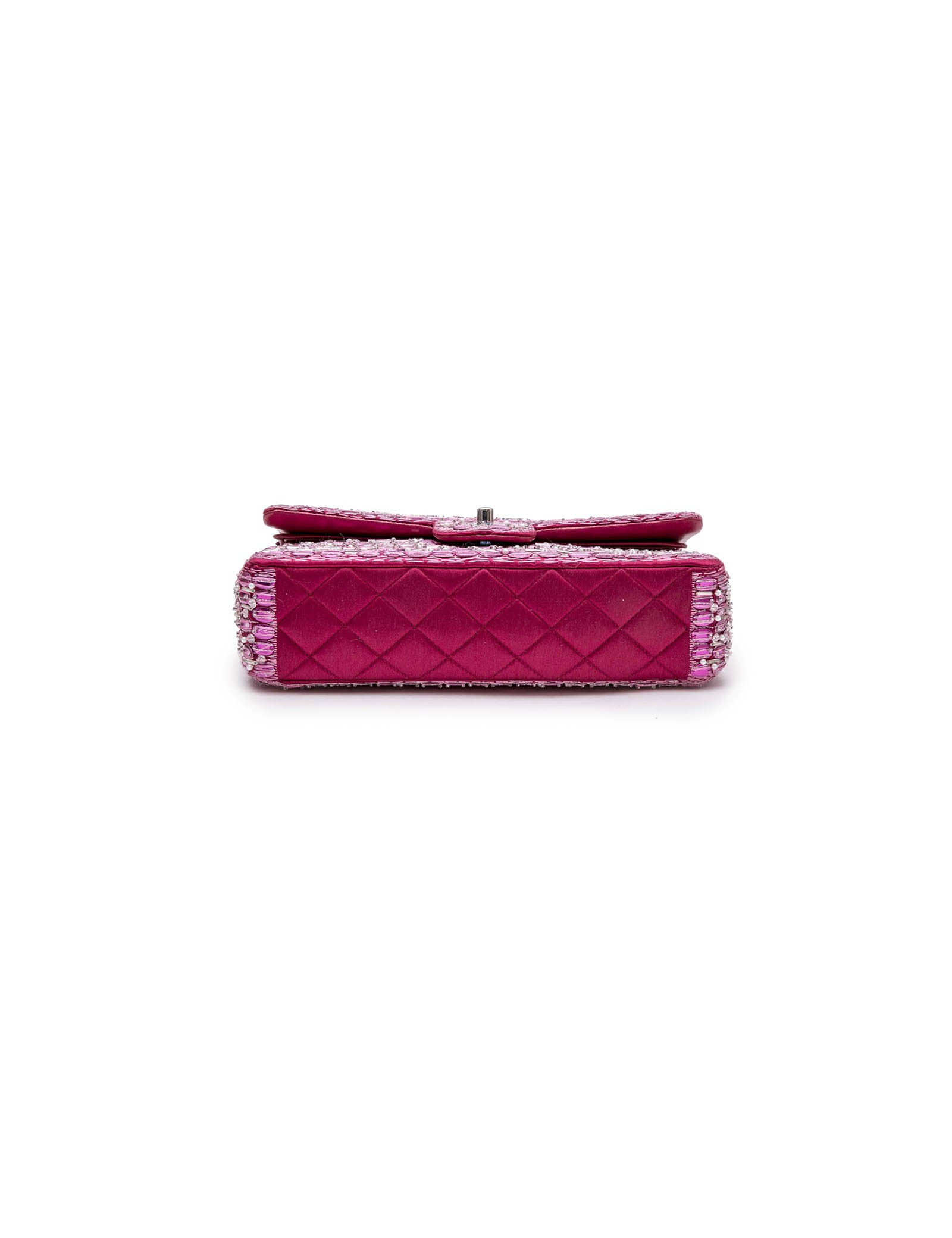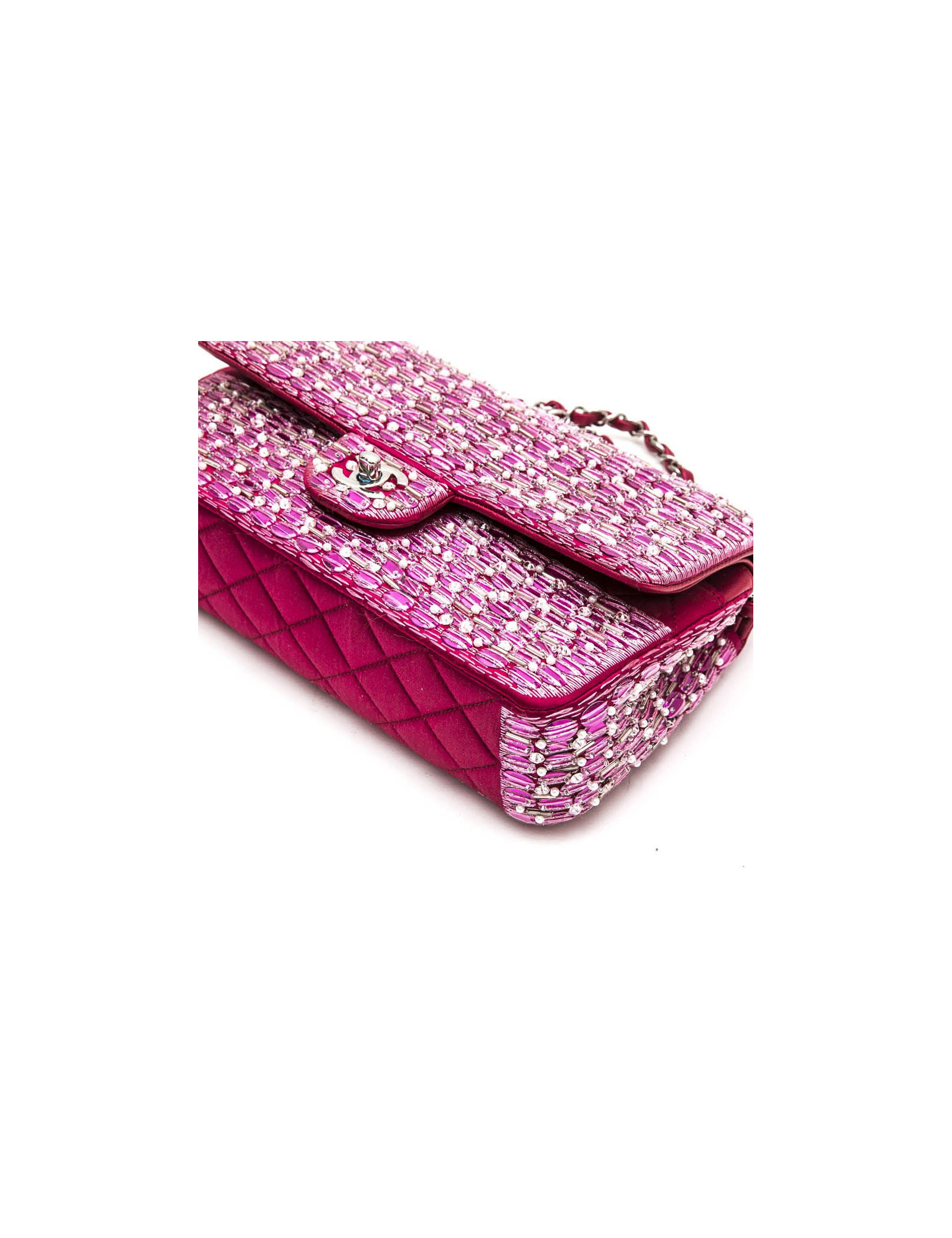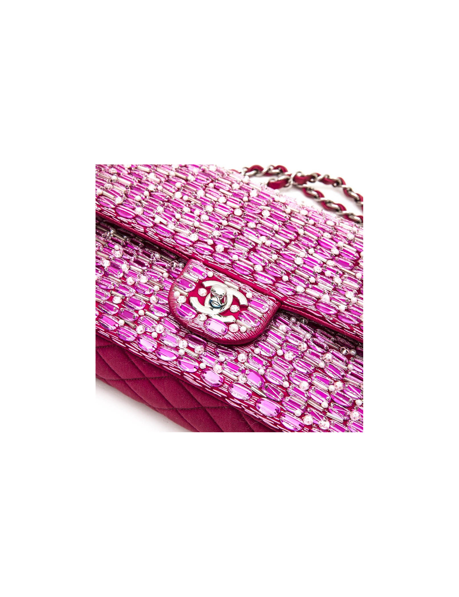 Chanel Couture double flap bag, Limited Edition, in smooth lambskin lined with iridescent fuchsia and embroidered on silk with satin tubes, pearls and pearls. Hardware in palladium silver metal. The interior is lined entirely in iridescent fuchsia leather.
