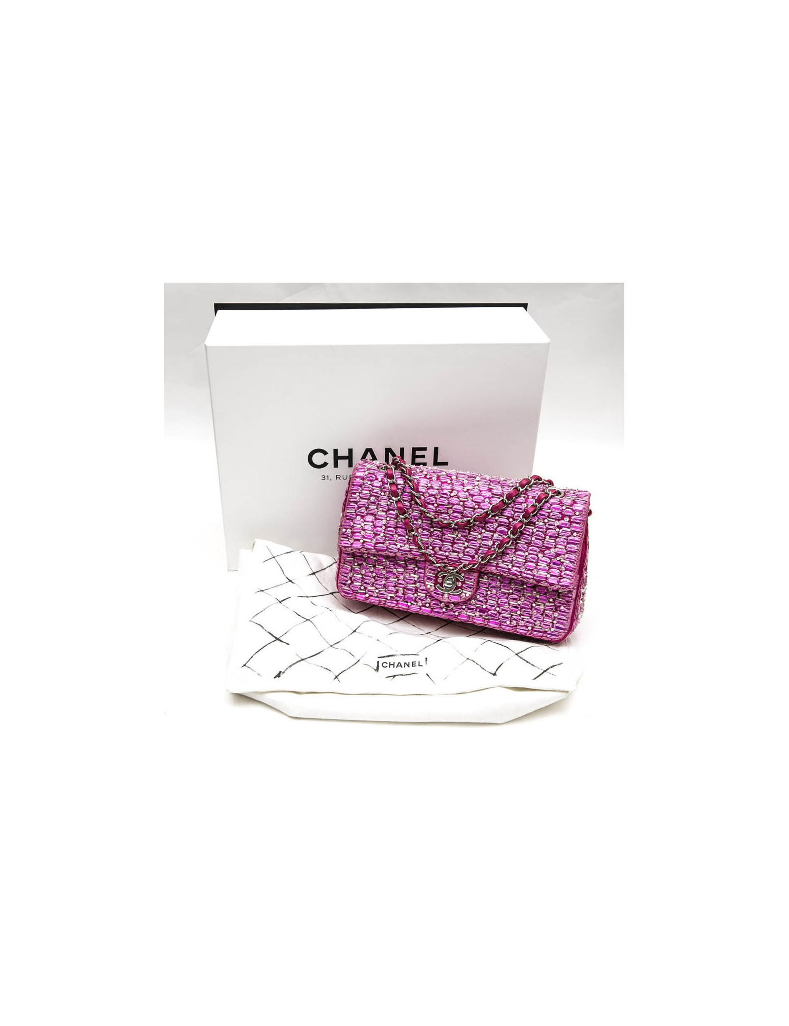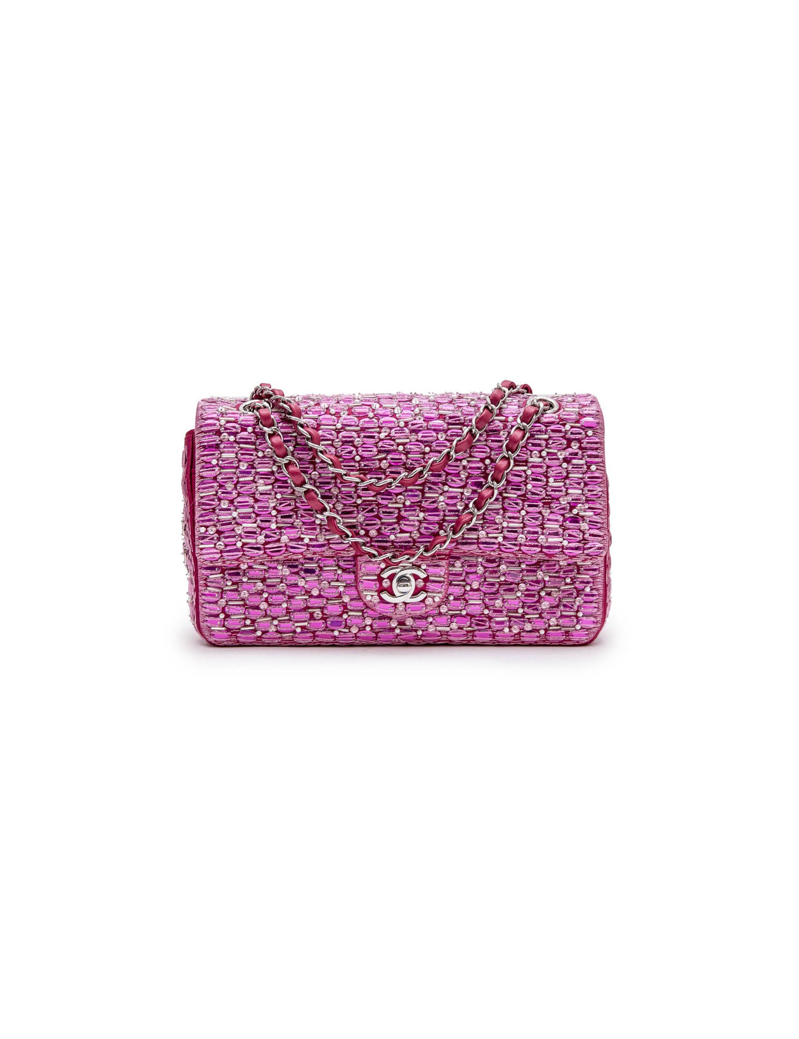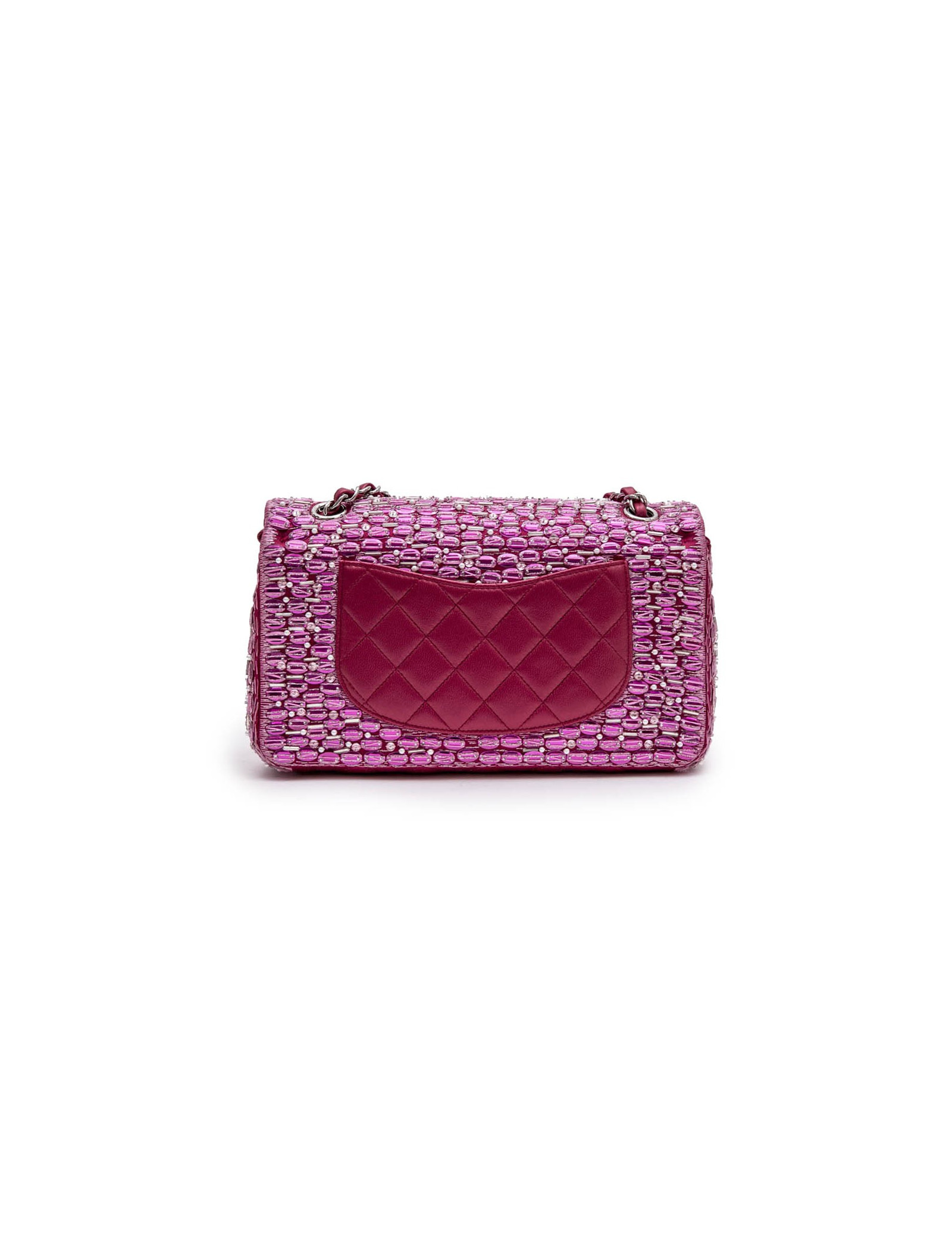 Chanel Couture double flap bag, Limited Edition, in smooth lambskin lined with iridescent fuchsia and embroidered on silk with satin tubes, pearls and pearls. Hardware in palladium silver metal. The interior is lined entirely in iridescent fuchsia leather.
