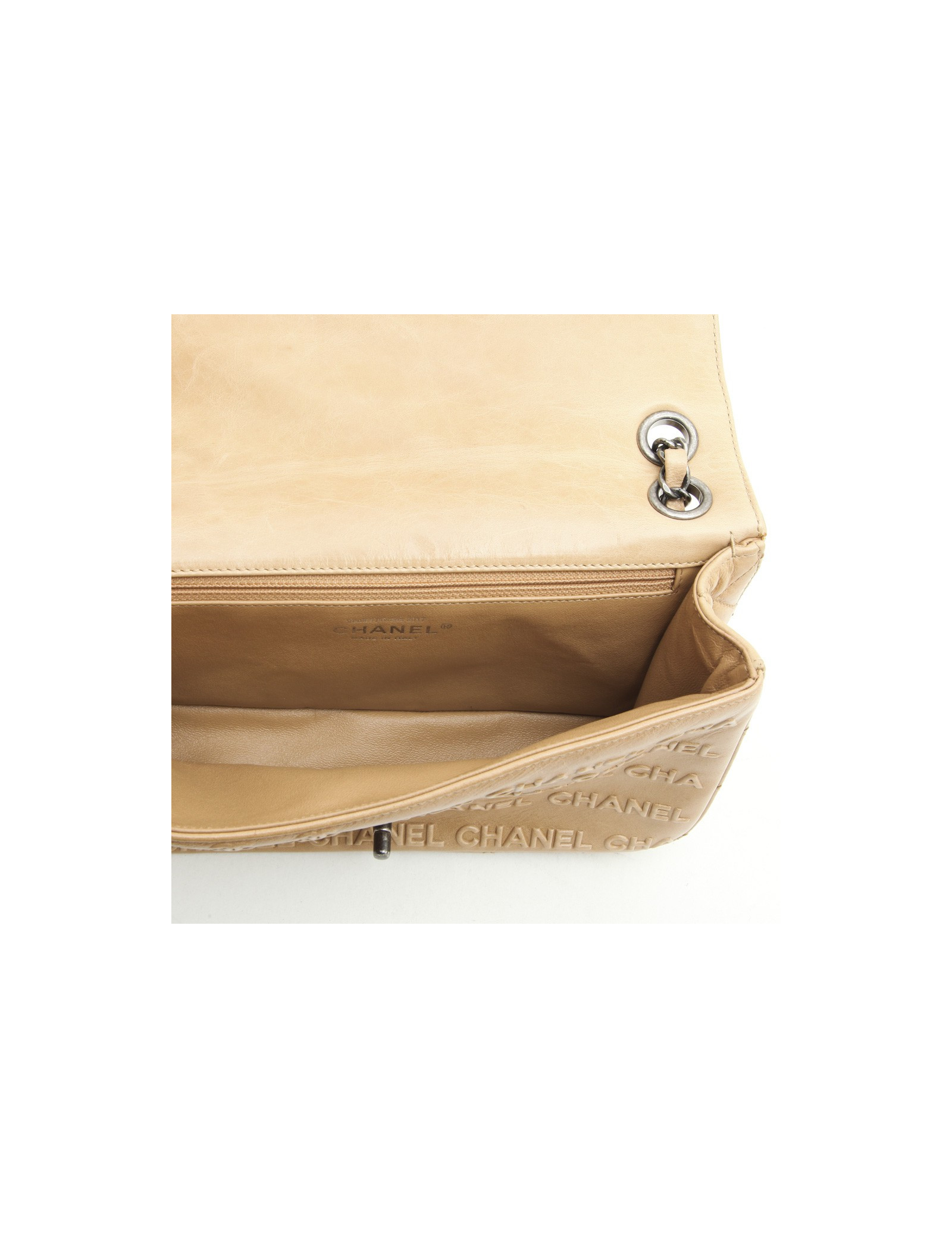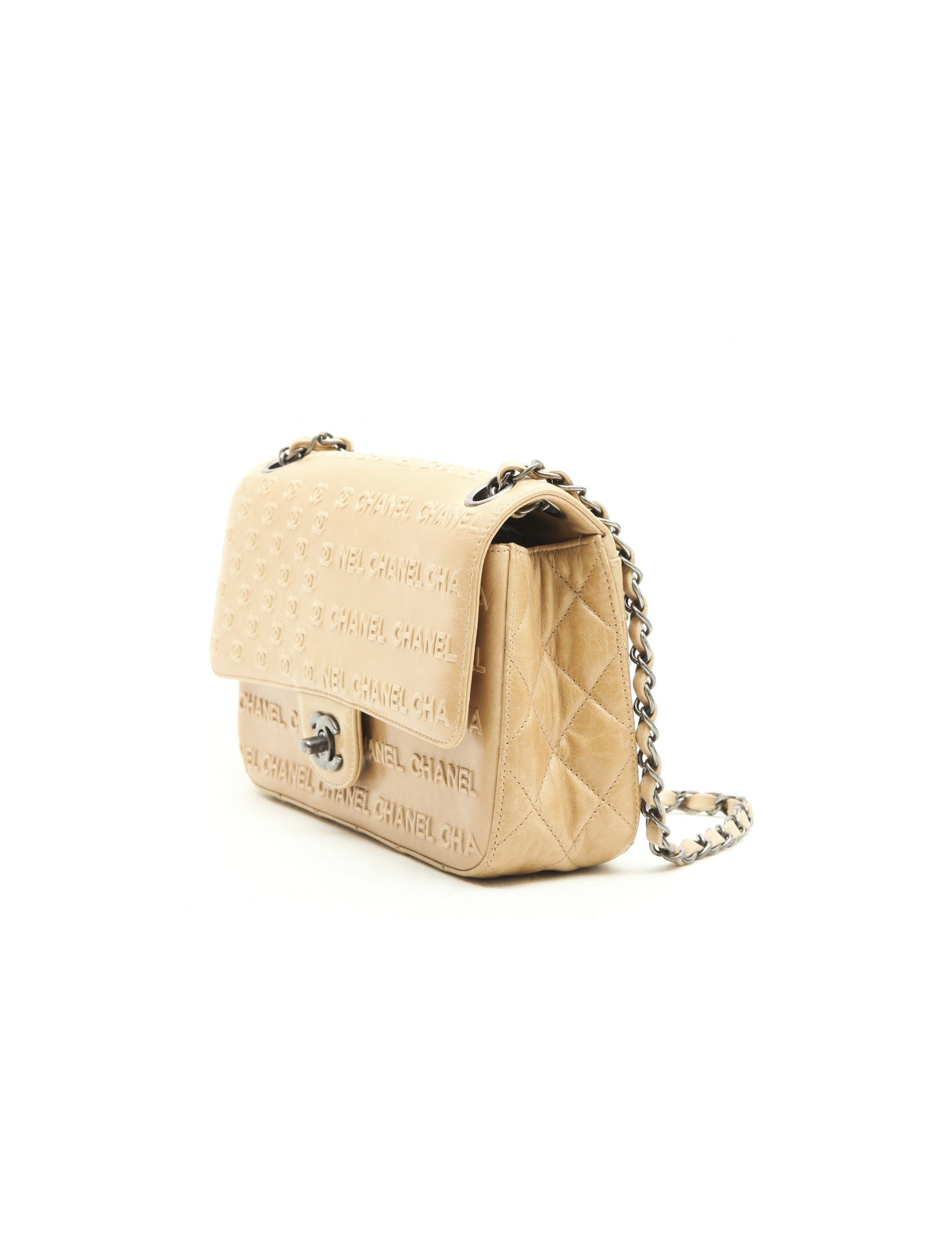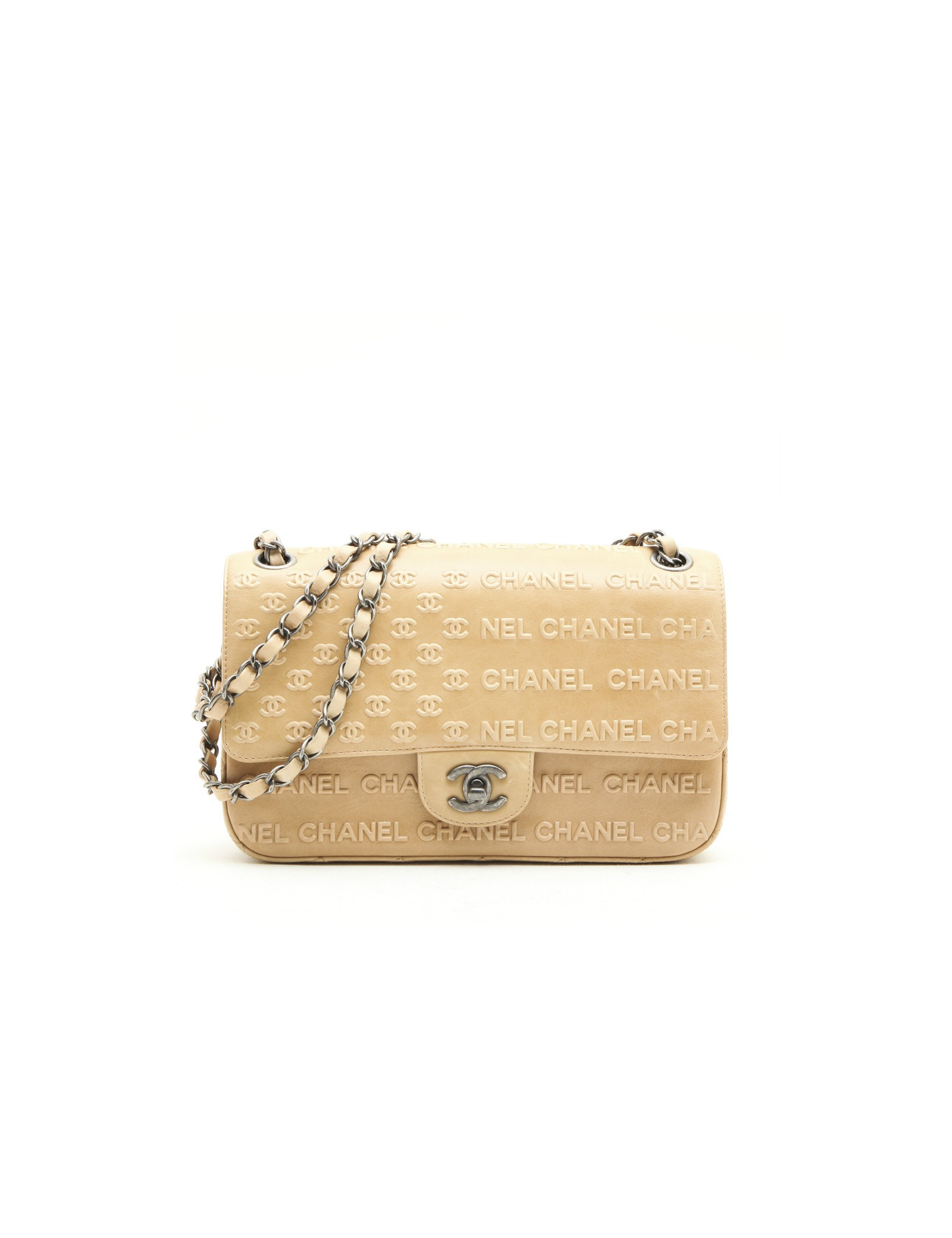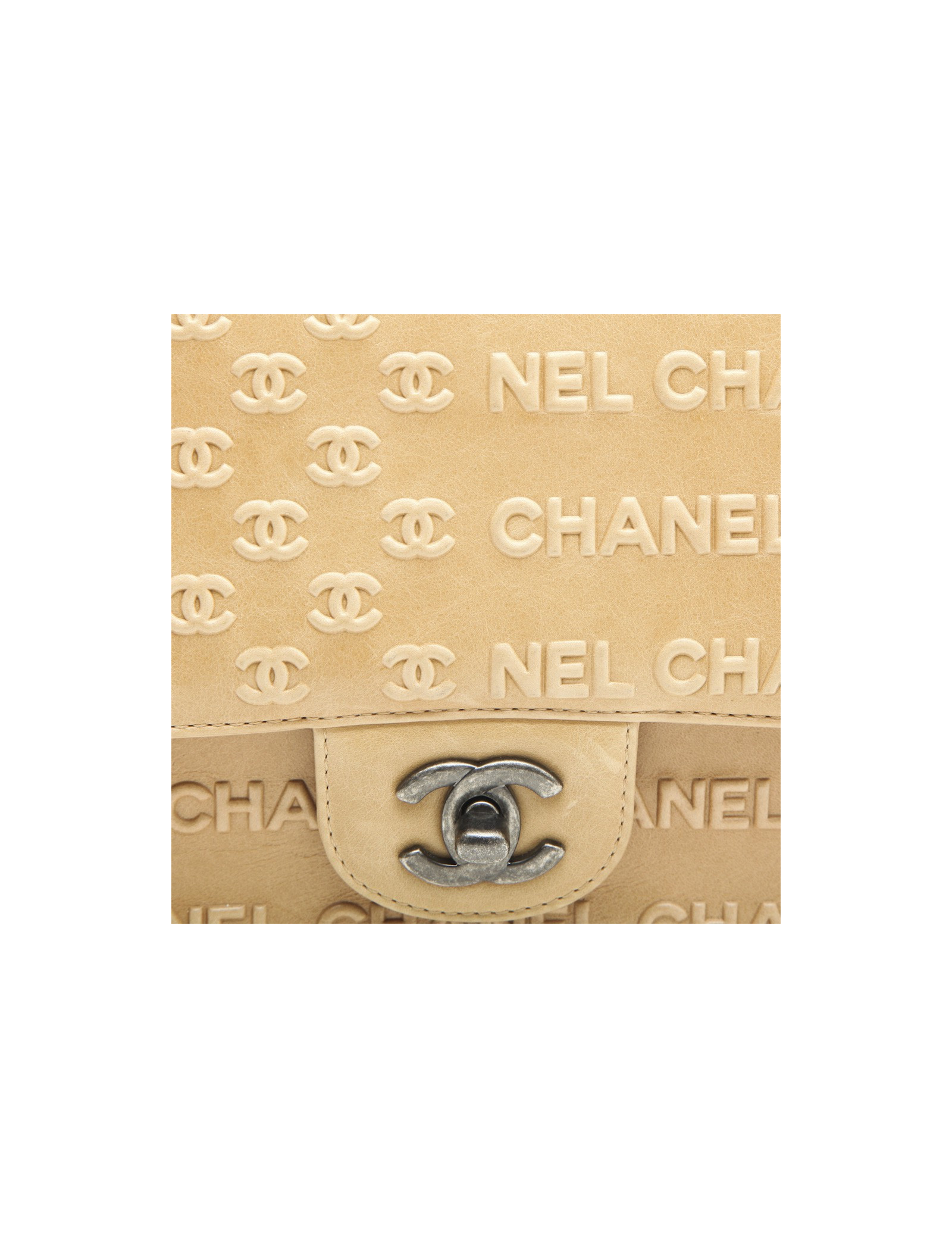 Chanel 'Timeless' bag in embossed 'CC' and 'CHANEL' beige. Aged silver metal hardware.