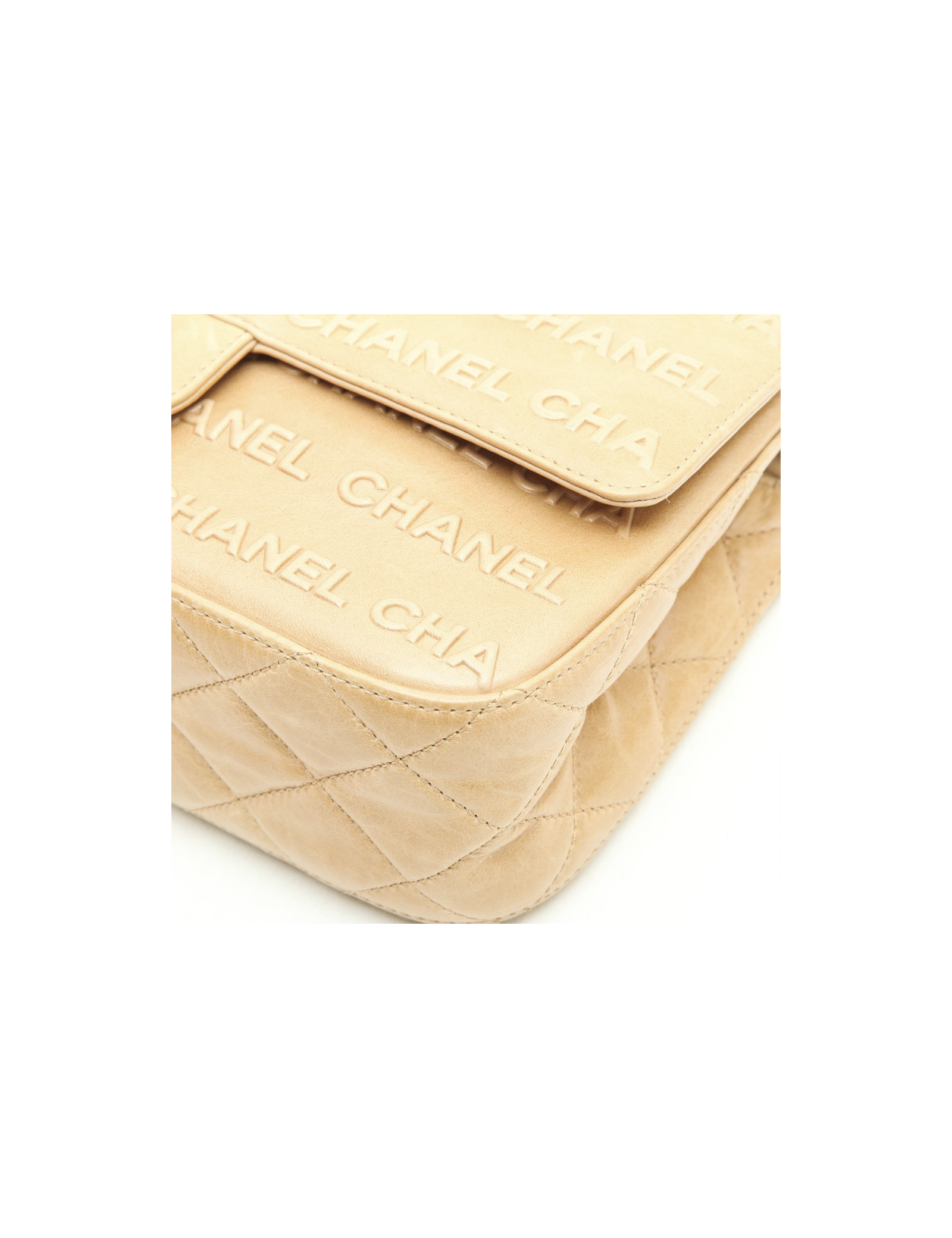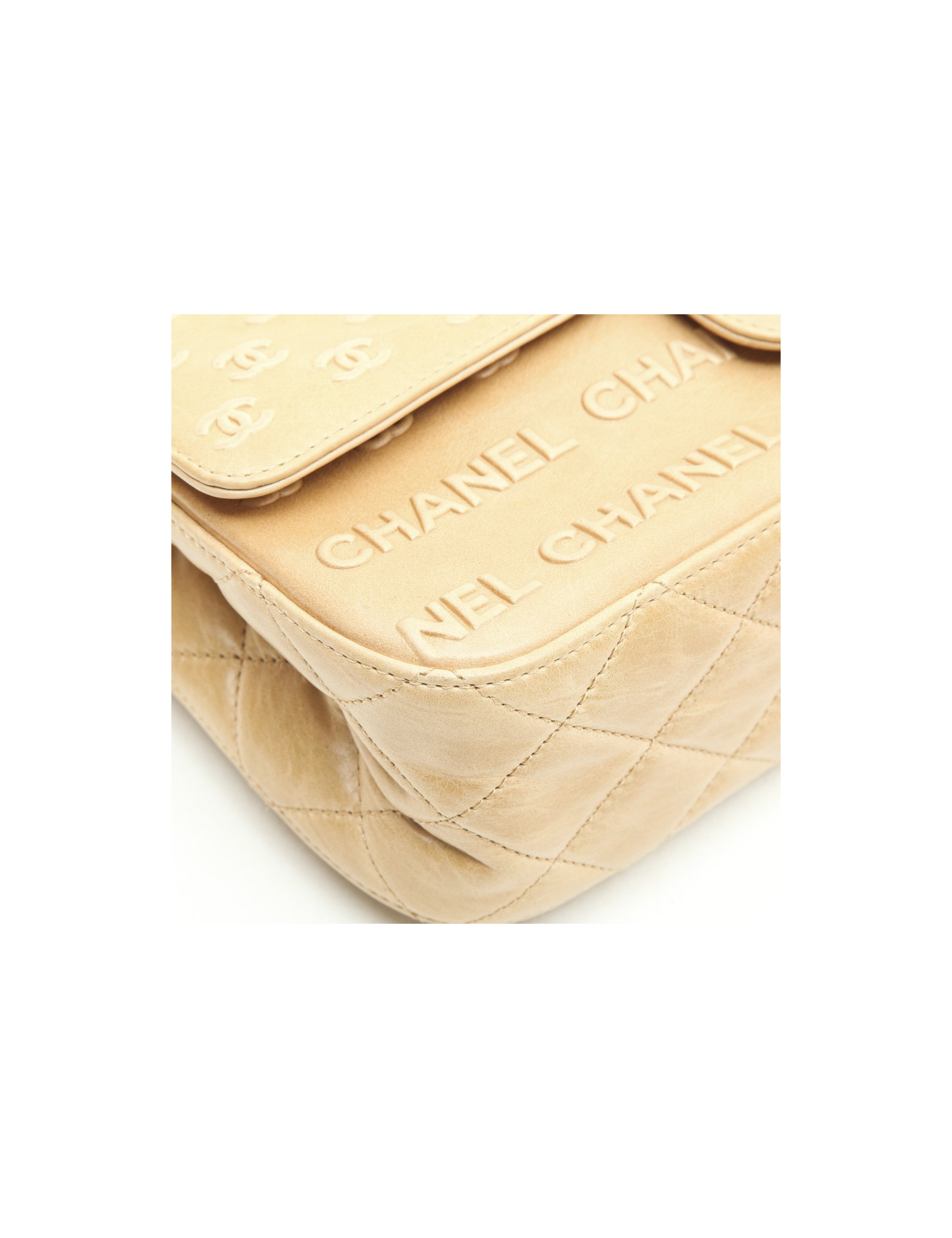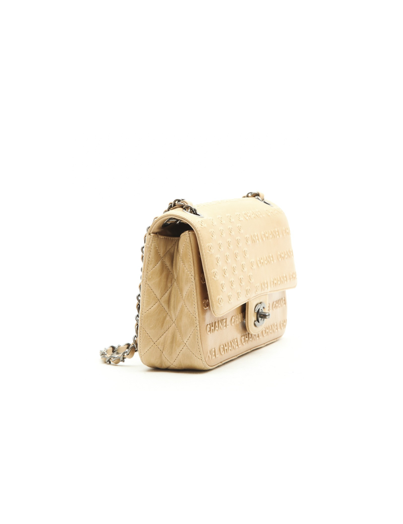 Chanel 'Timeless' bag in embossed 'CC' and 'CHANEL' beige. Aged silver metal hardware.
