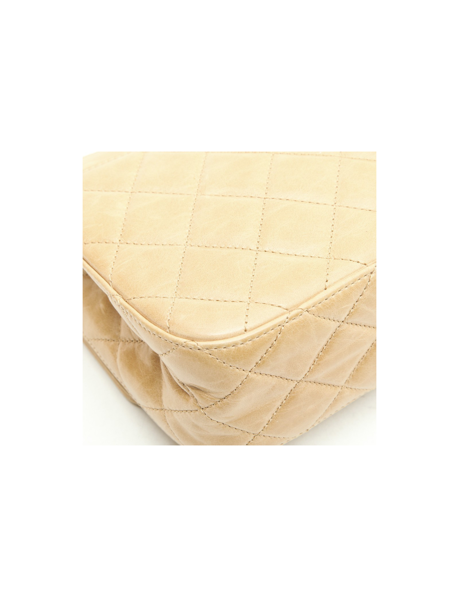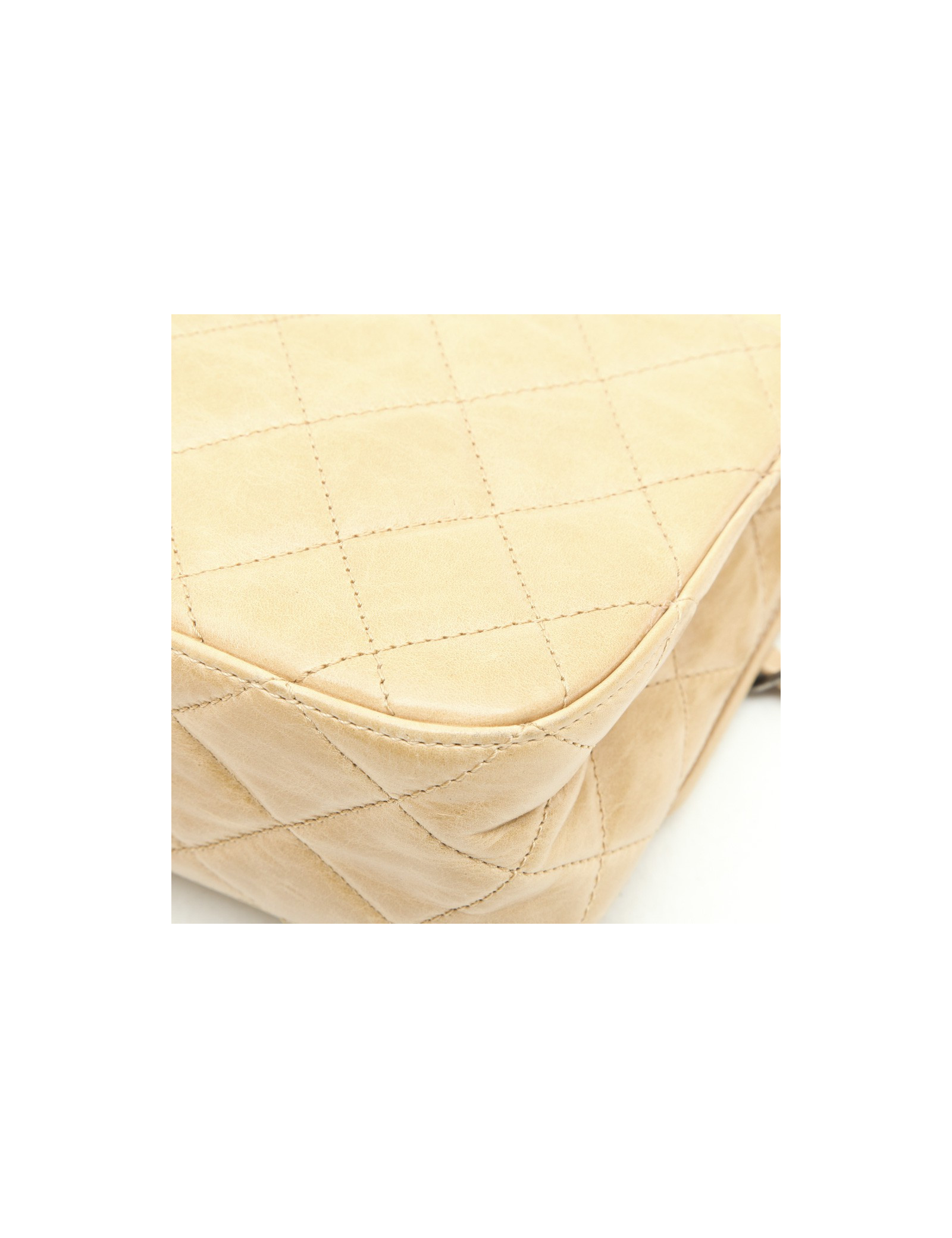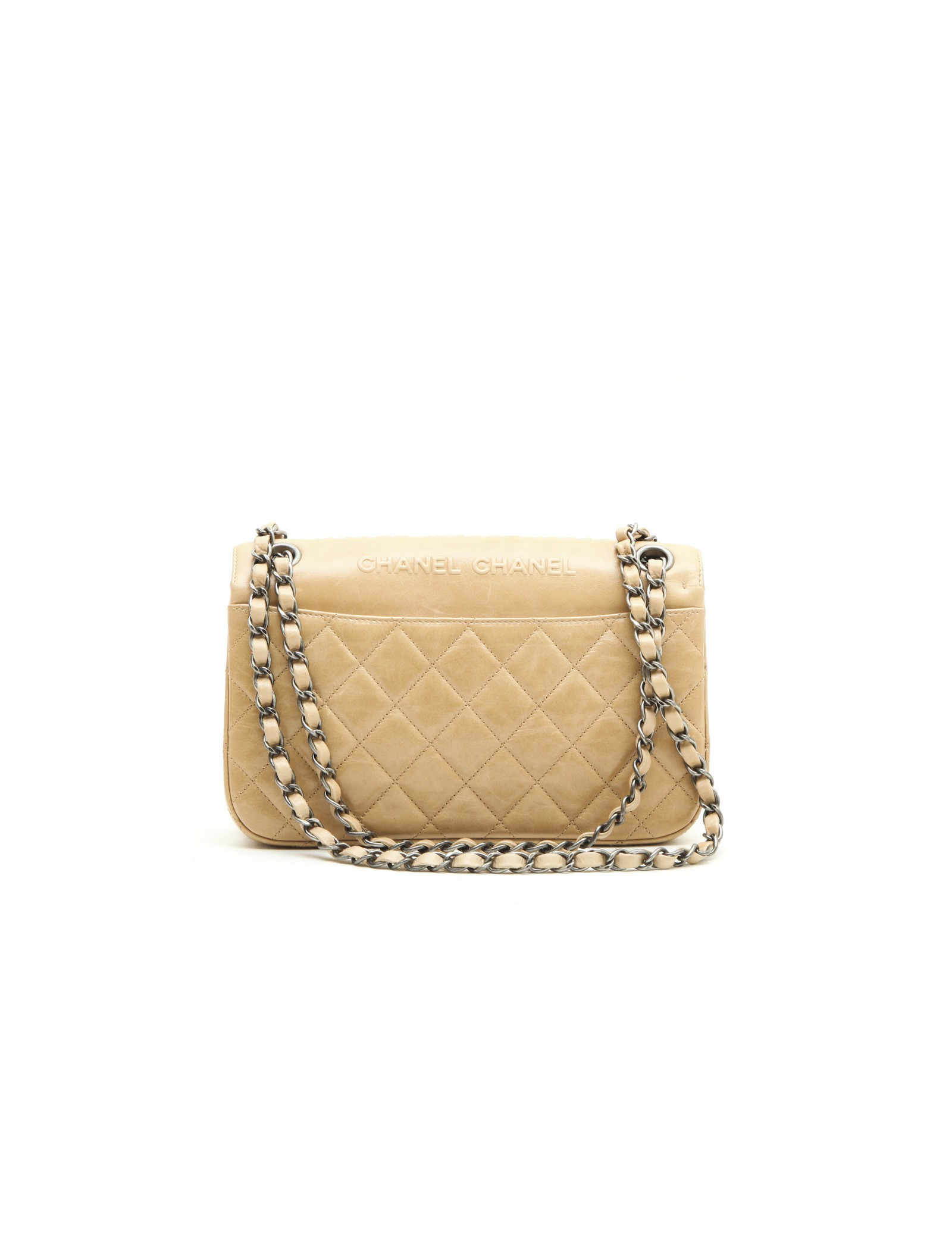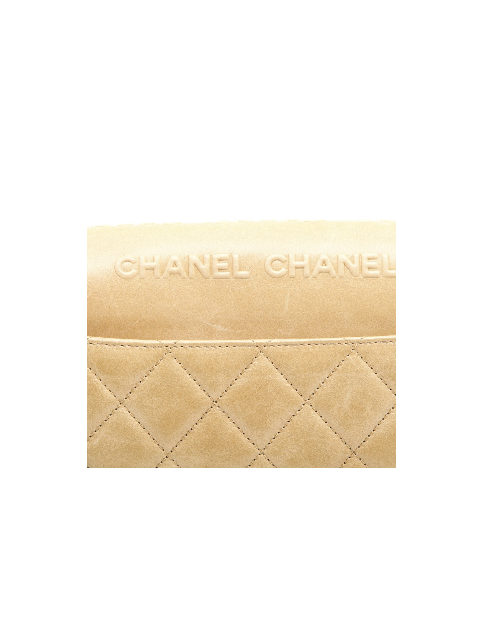 Chanel 'Timeless' bag in embossed 'CC' and 'CHANEL' beige. Aged silver metal hardware.