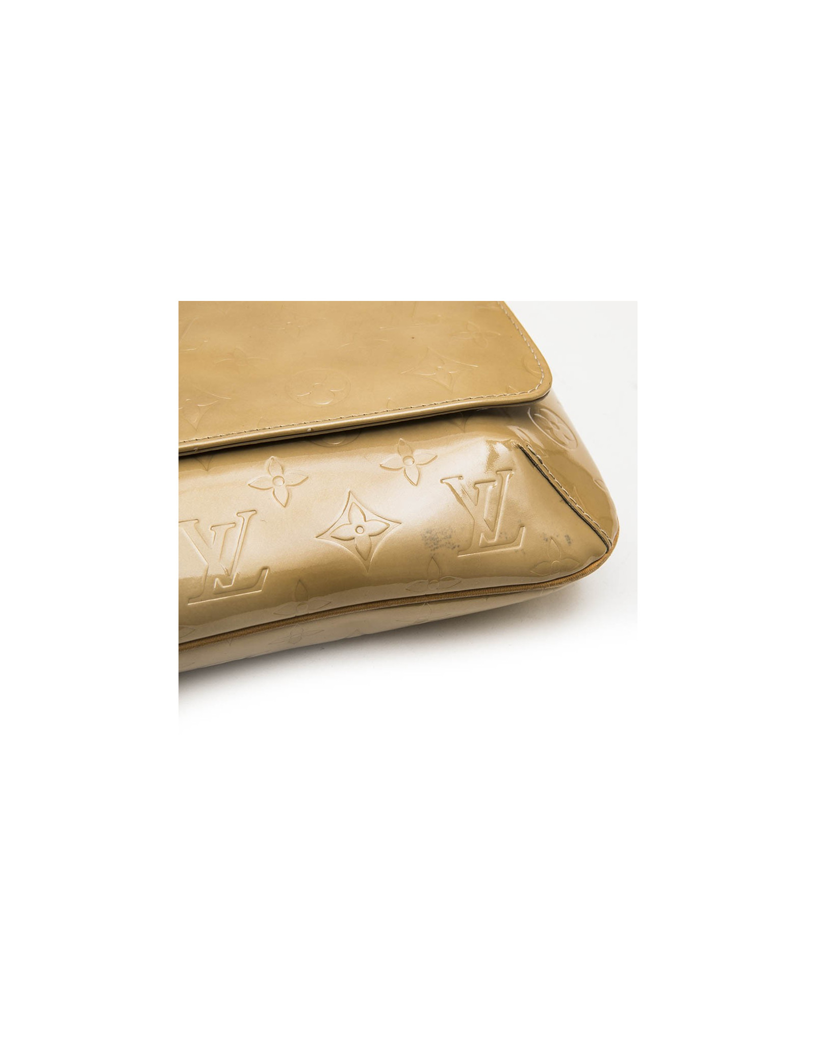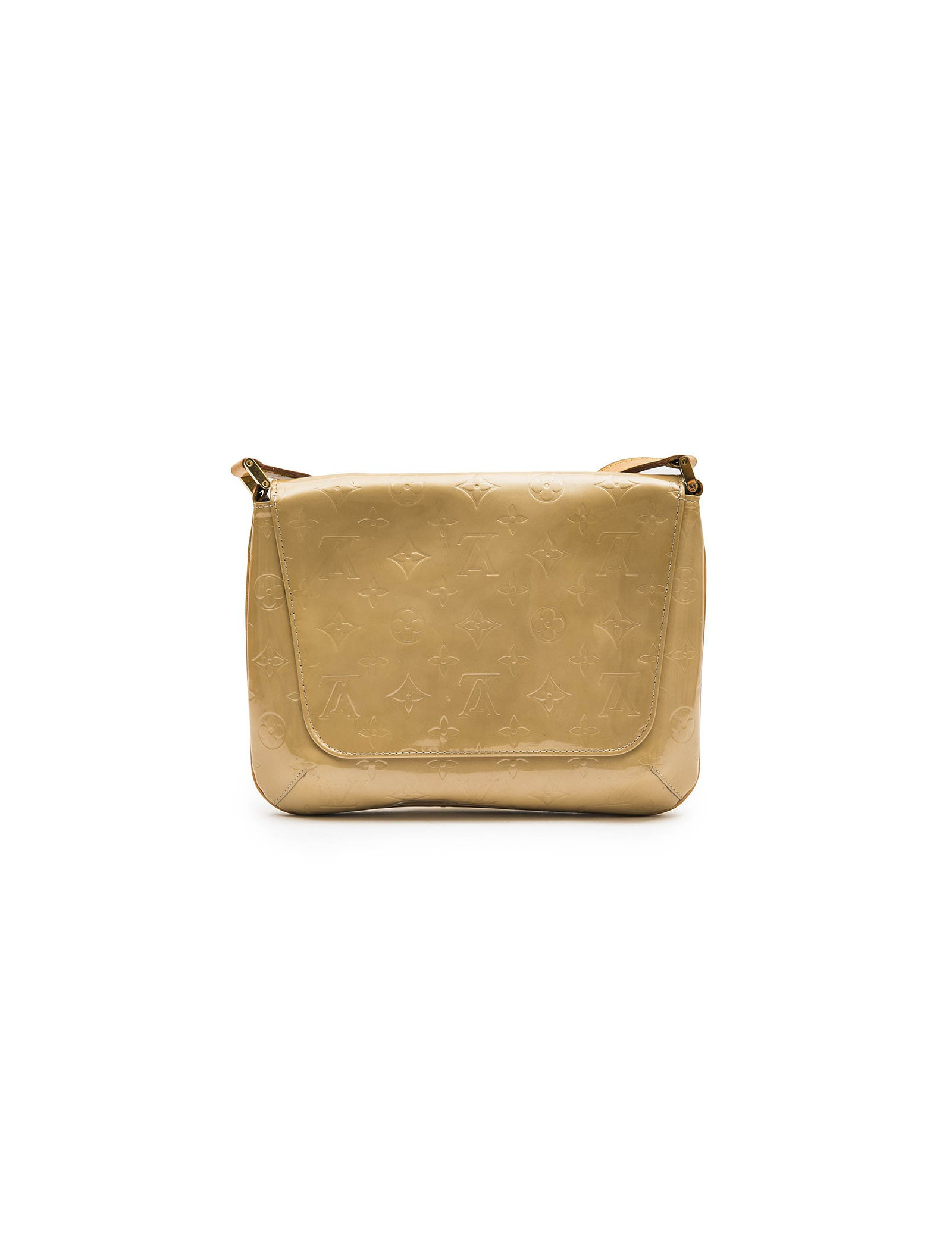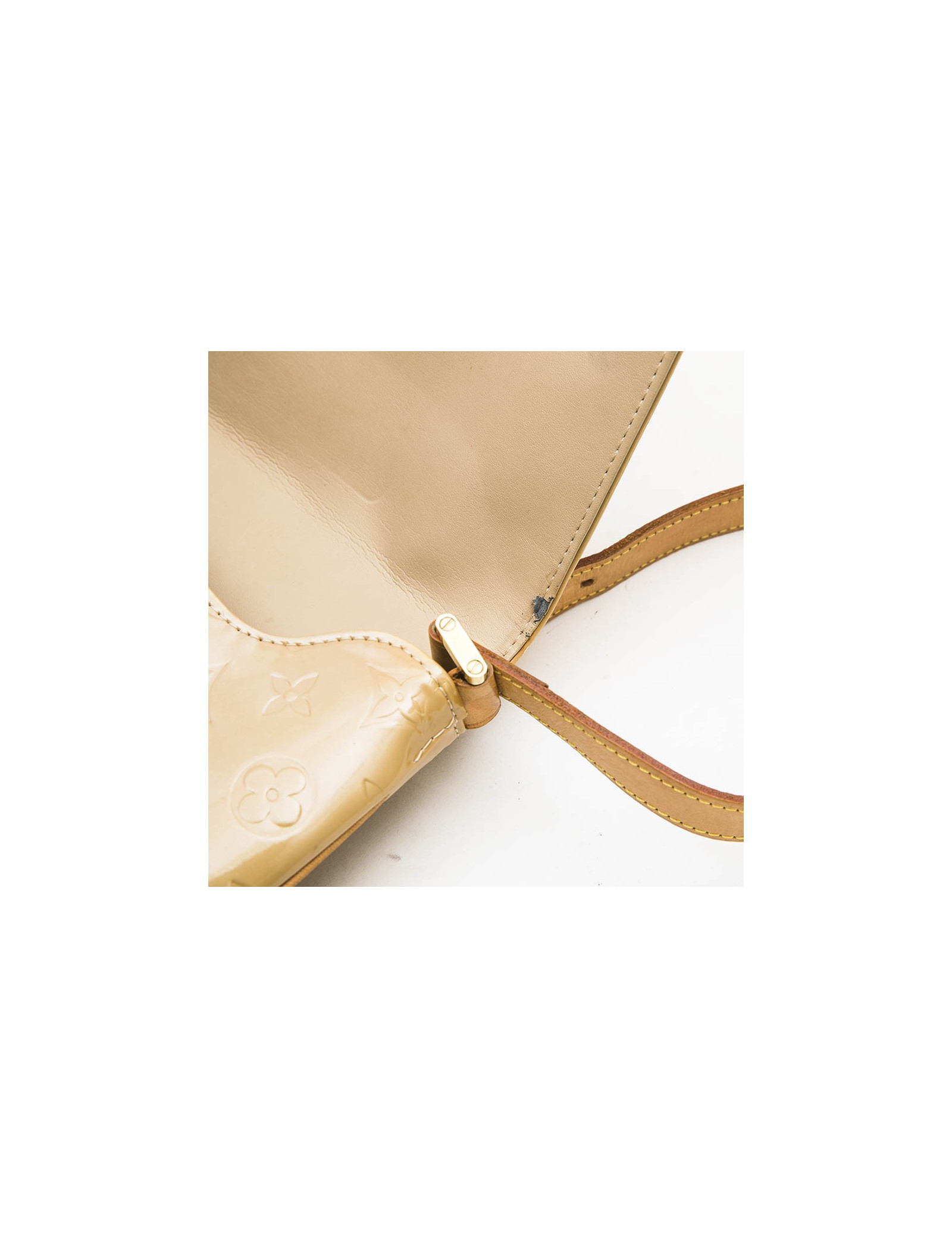 Louis Vuitton bag in beige patent monogram leather. Gilded metal hardware. Natural cowhide finishes. Snap closure.