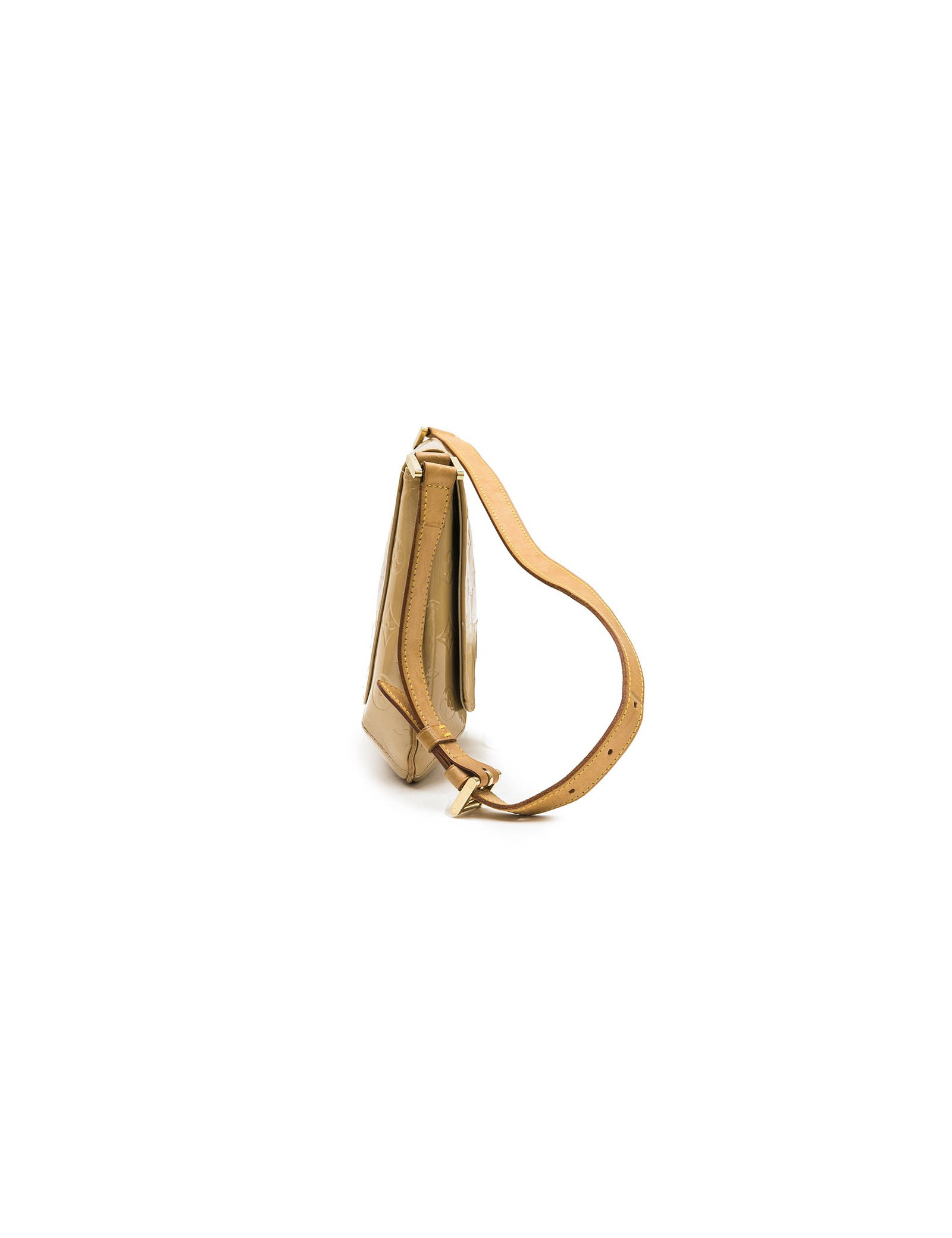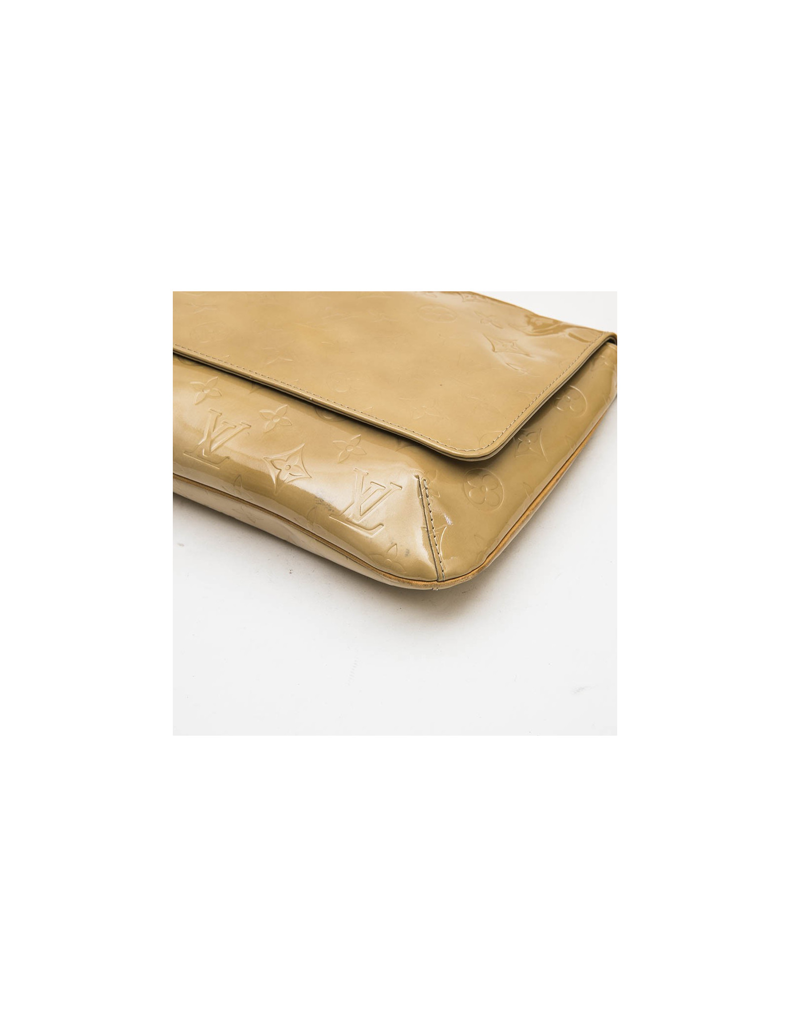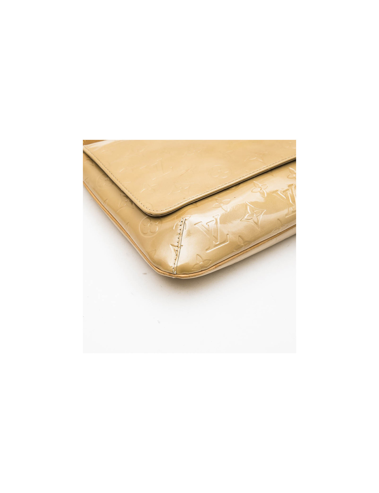 Louis Vuitton bag in beige patent monogram leather. Gilded metal hardware. Natural cowhide finishes. Snap closure.