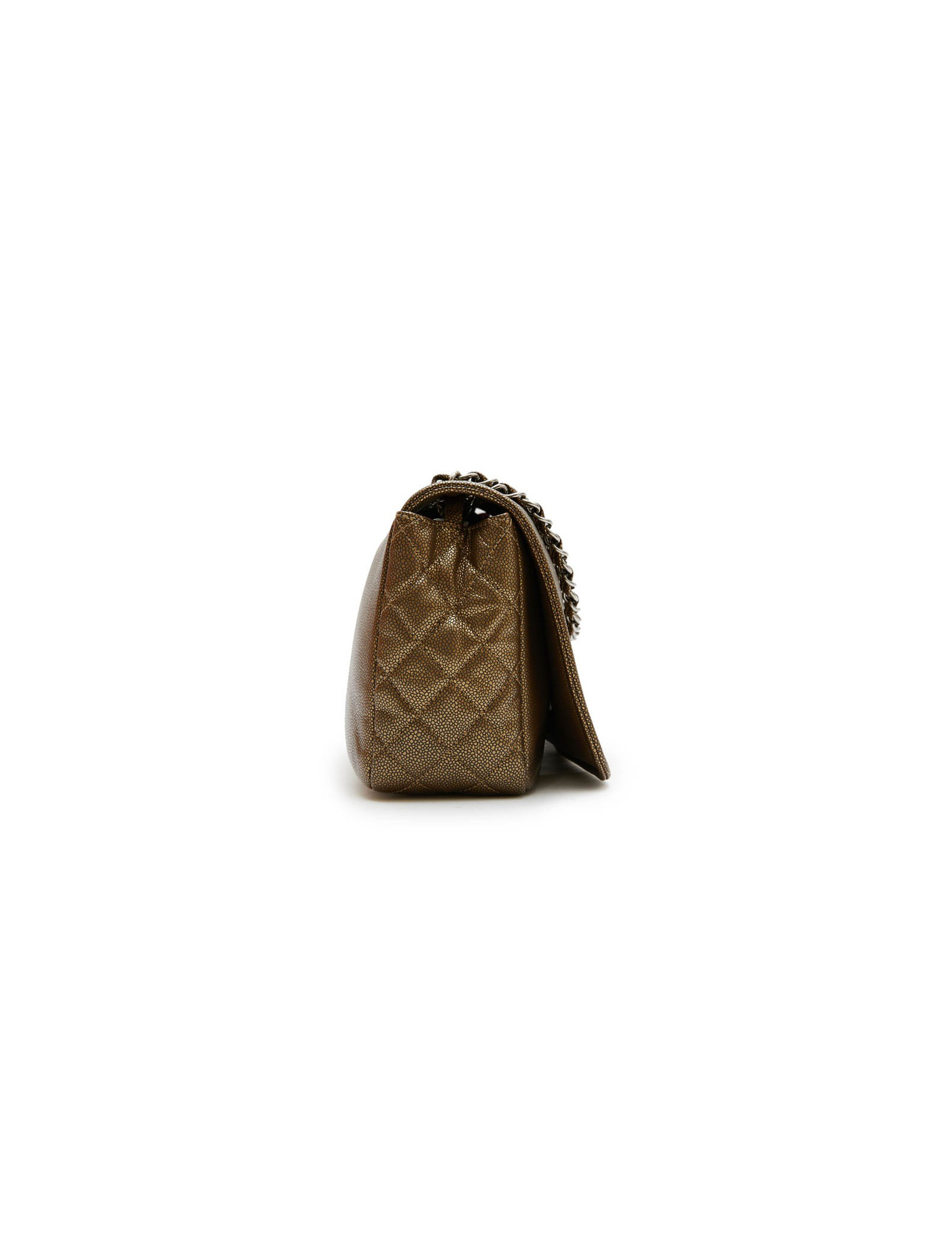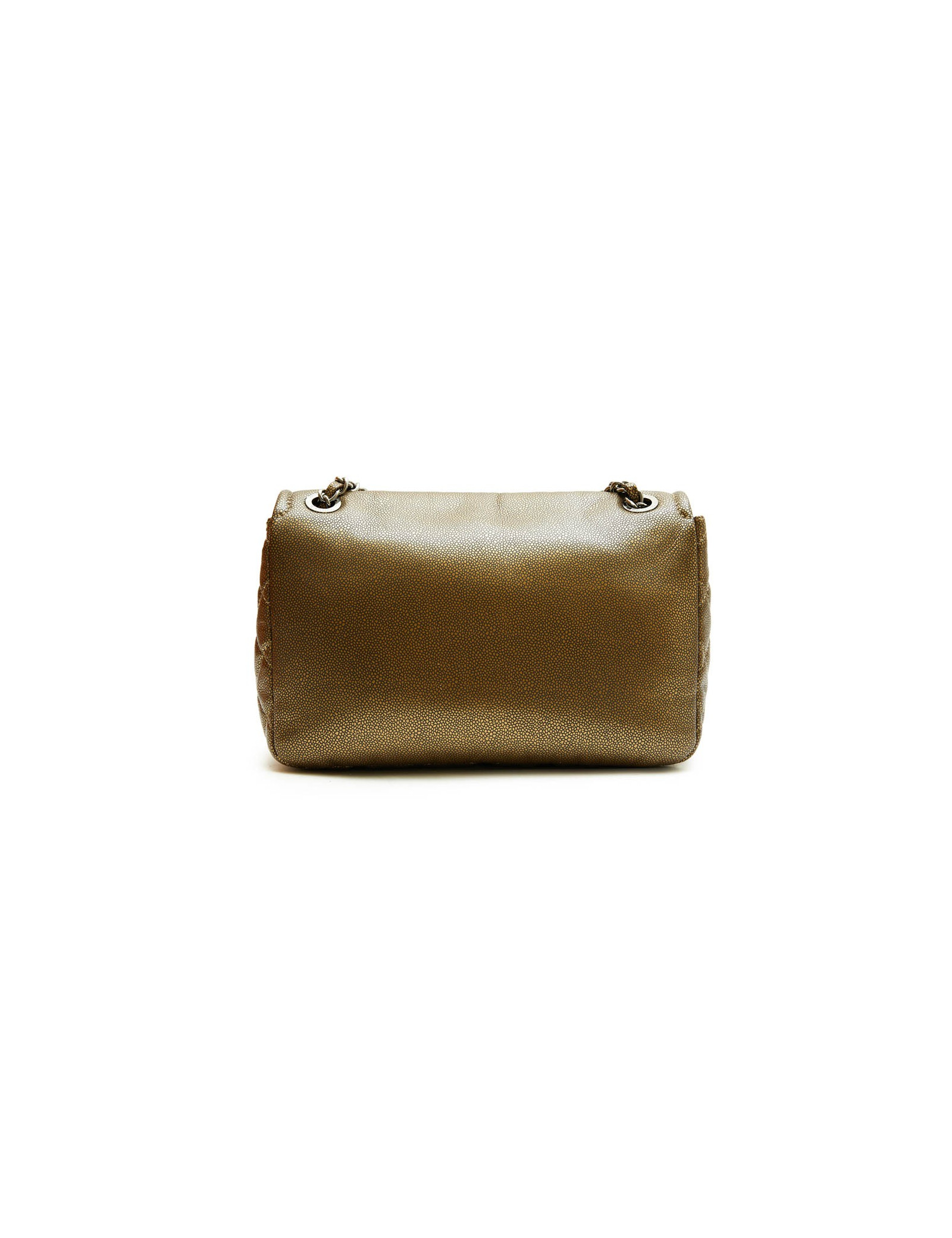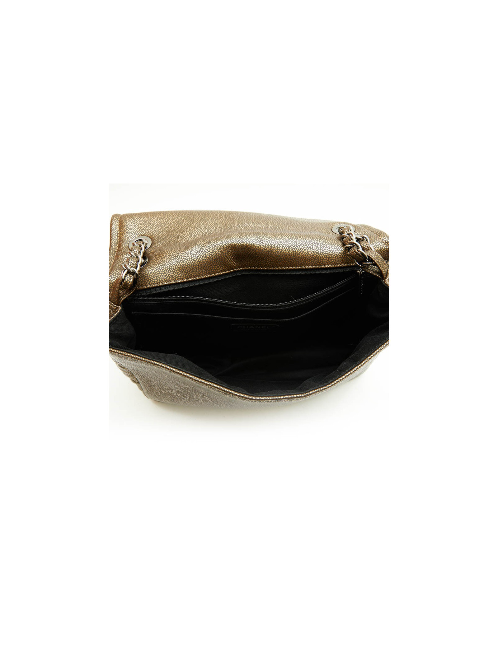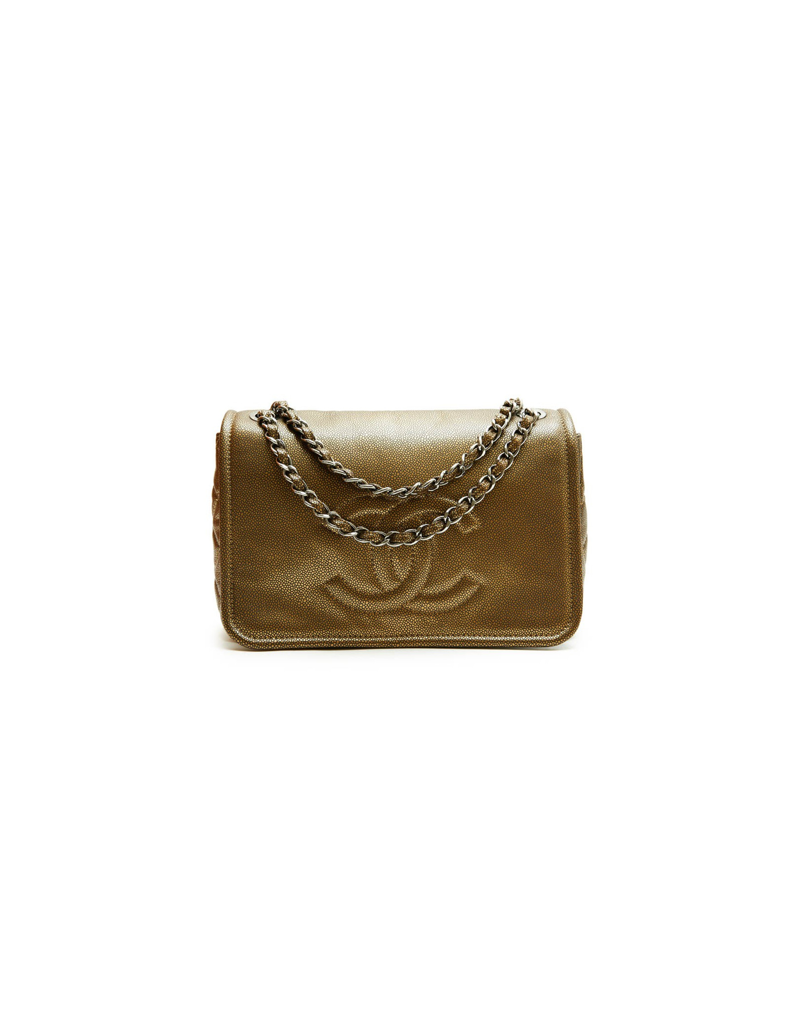 Chanel flap bag in coppered golden leather. Silver metal hardware. CC logo on the front of the bag. Snap closure.