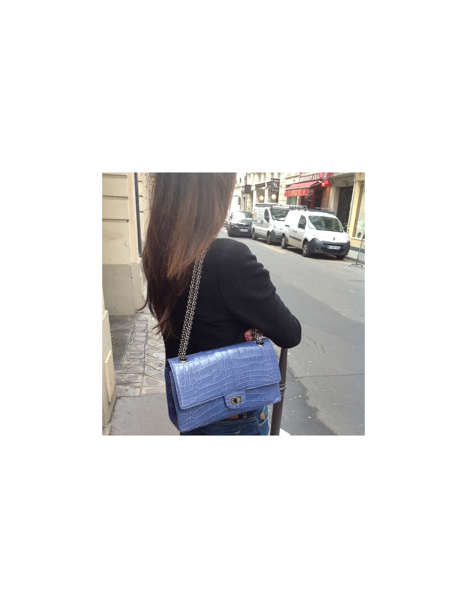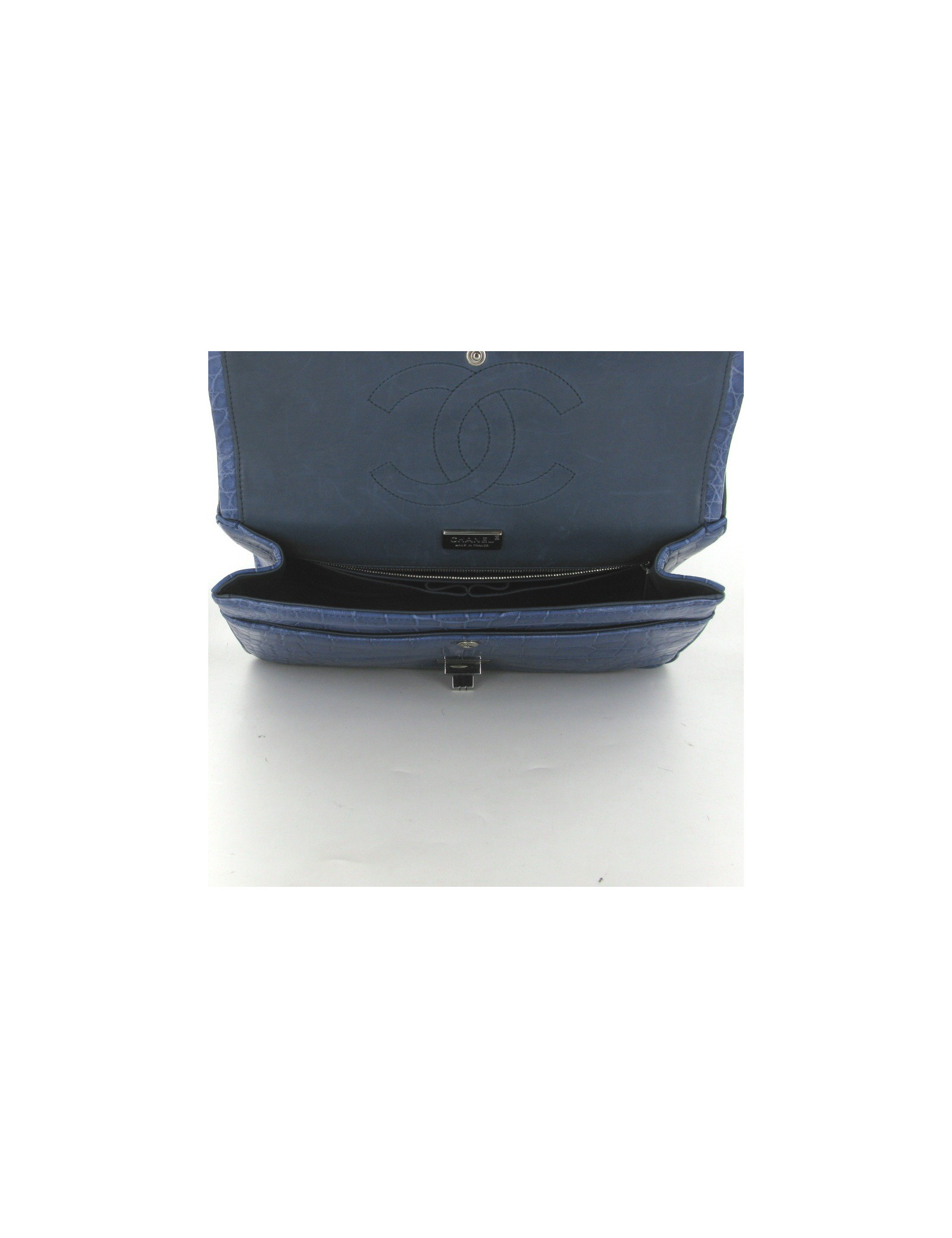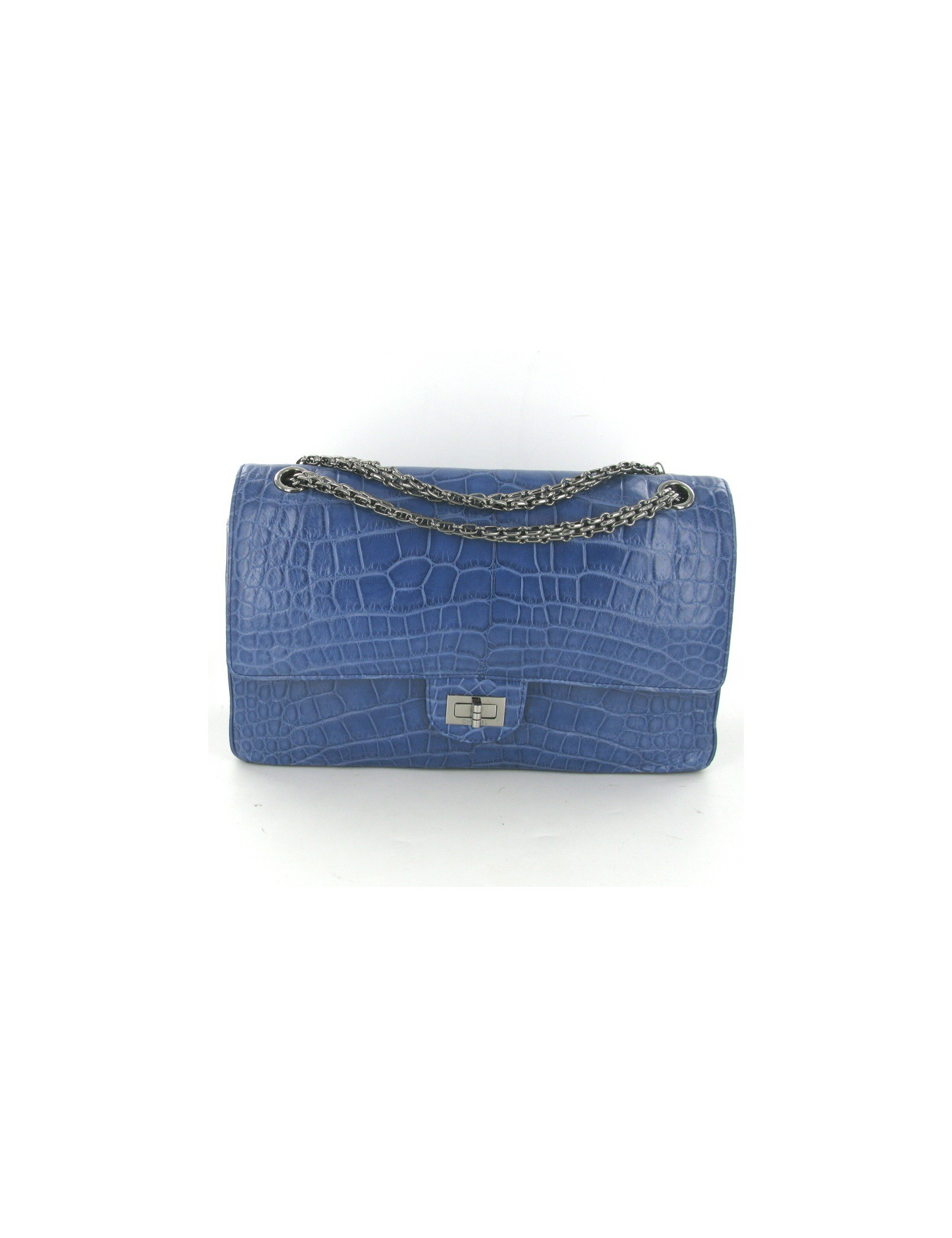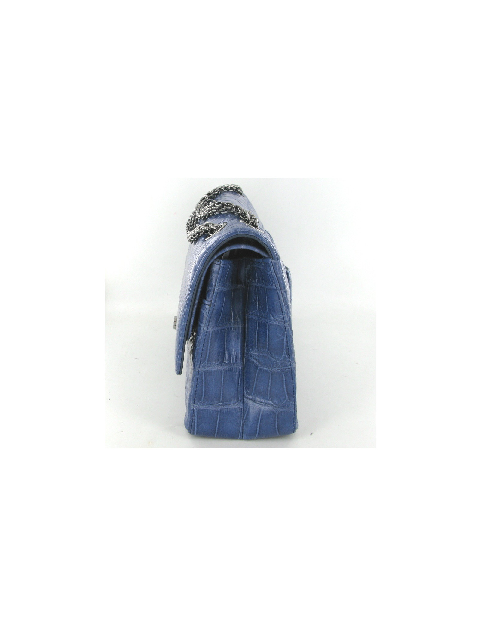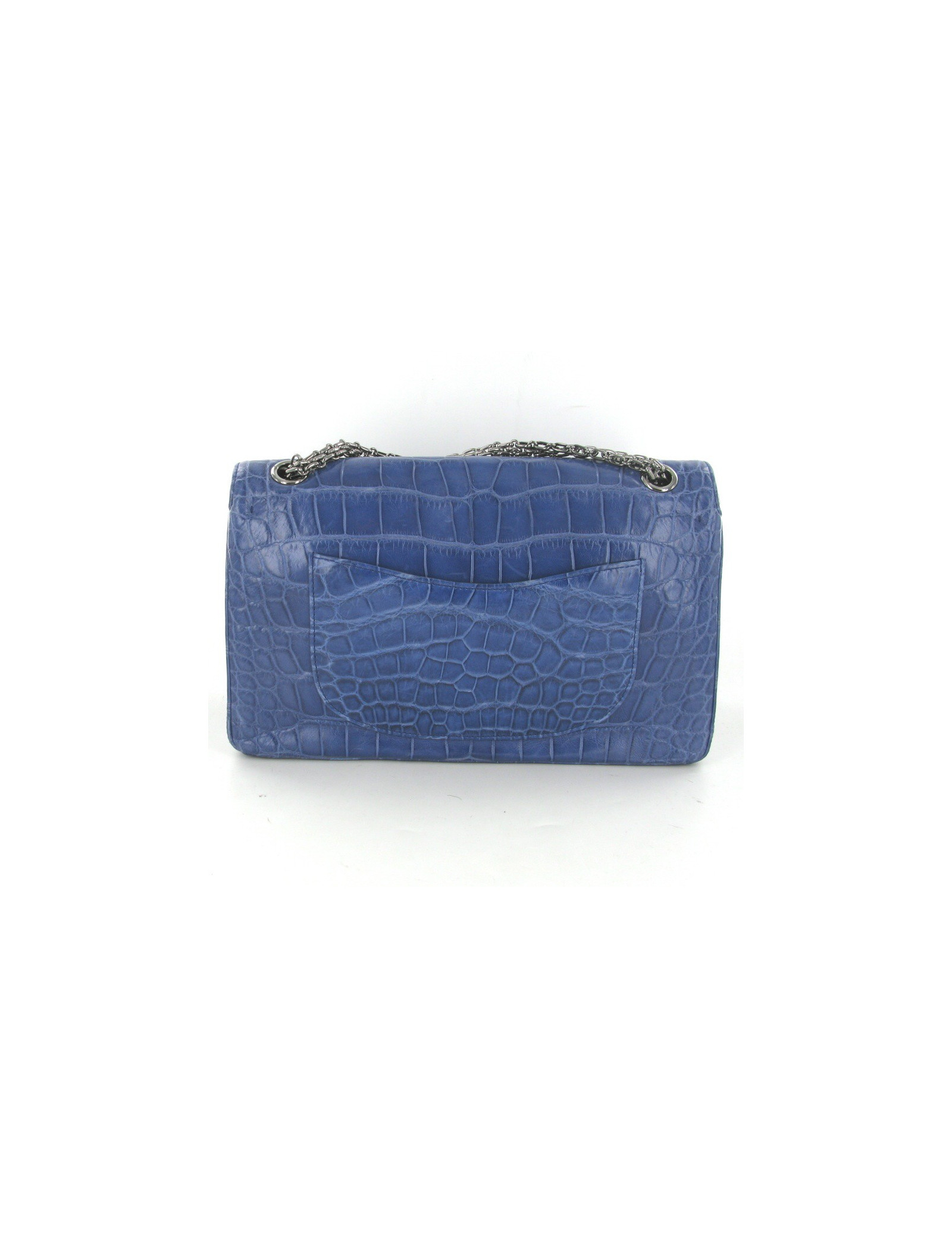 Beautiful CHANEL 2.55 blue alligator, jewelry is silver ring. It closes with a double flap. The Interior is blue leather. Storage space: there is a zipped into the first flap pocket, 1 Pocket back, a front pocket, 3 inner pockets. The strap is a silver ring chain, it measures 124 cm. very little worn, it seems out of the shop.