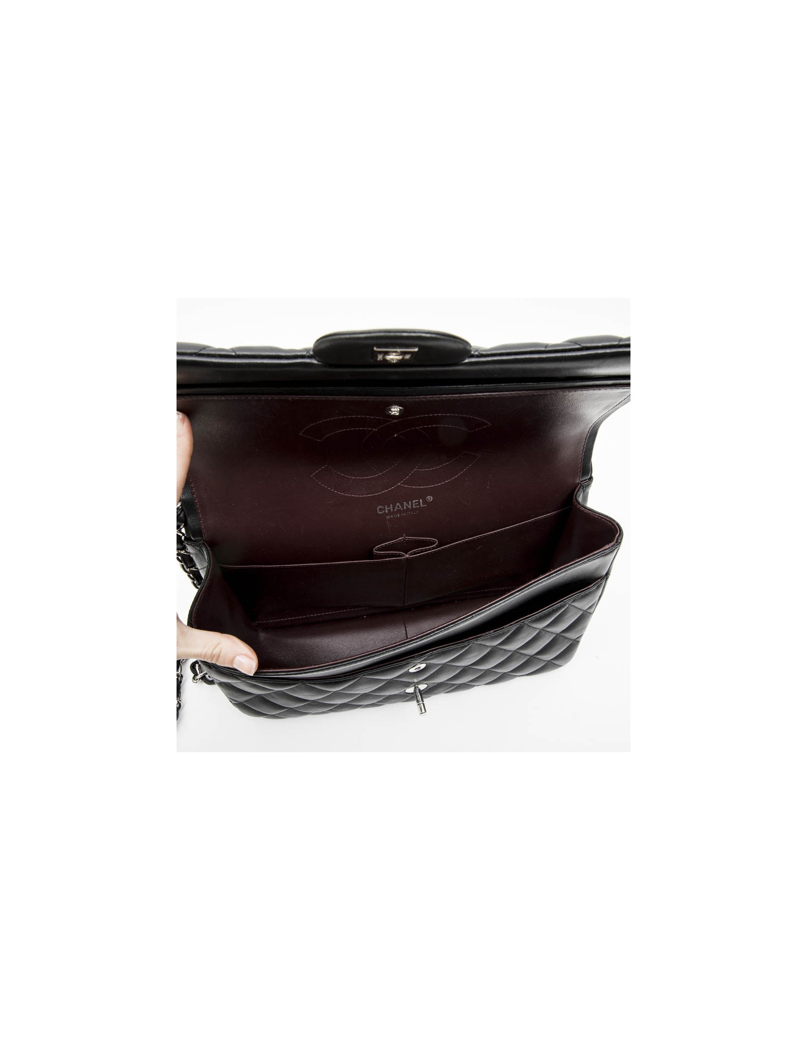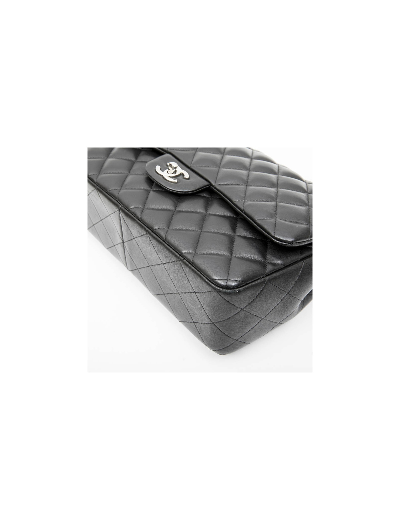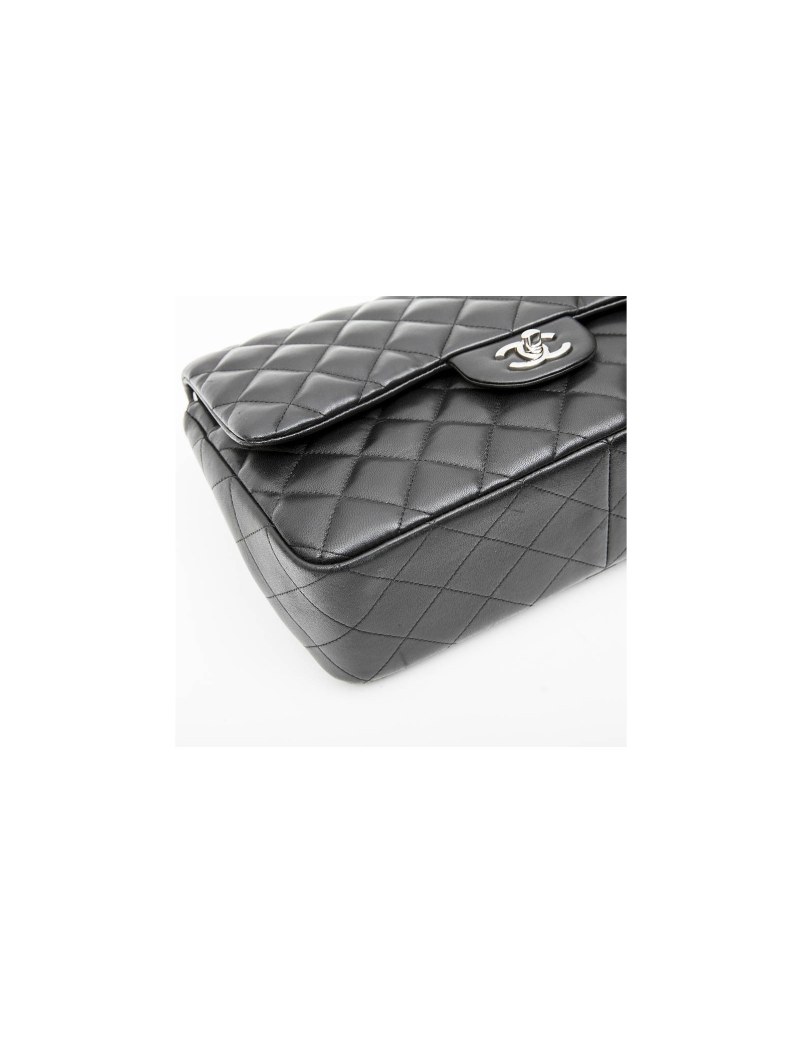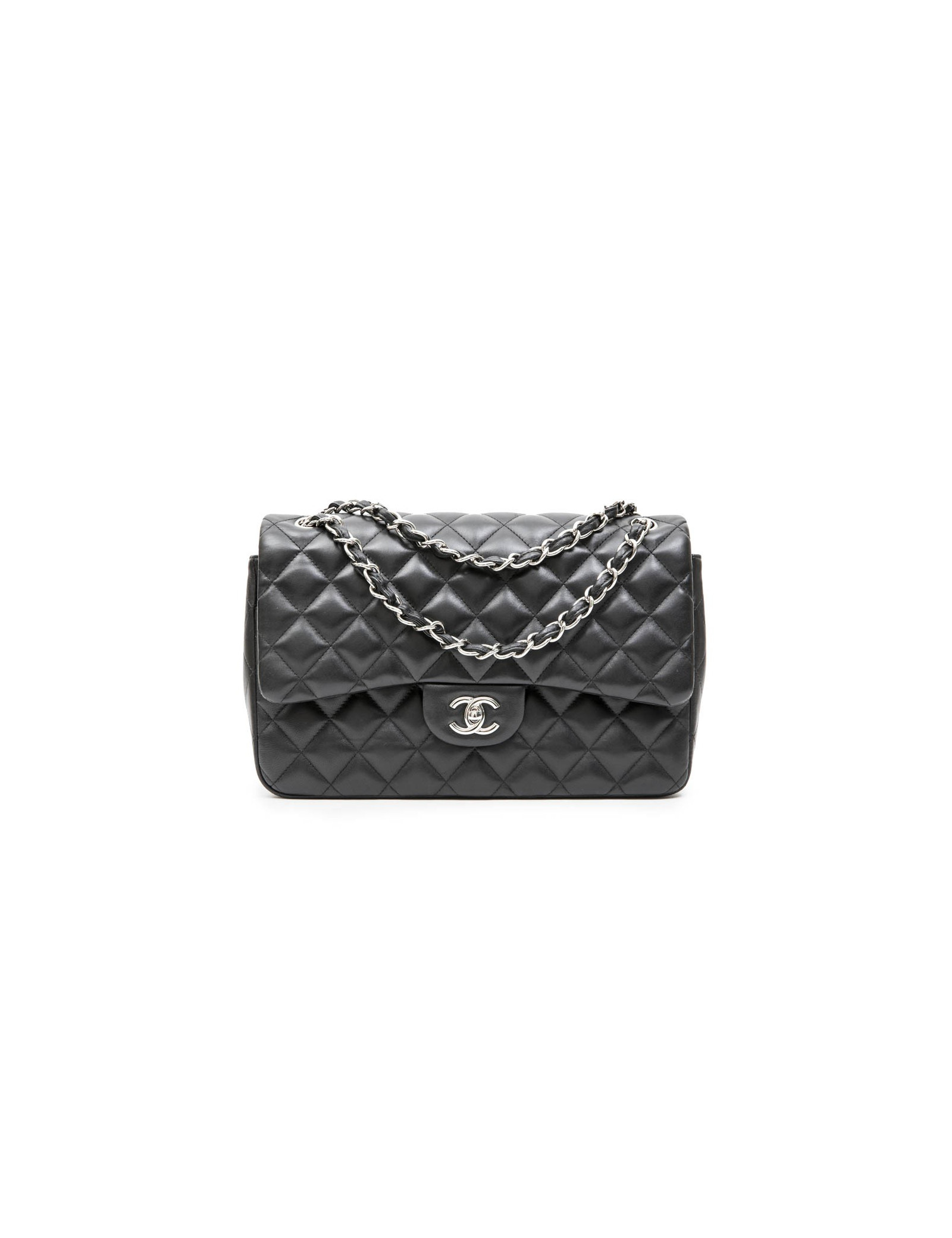 Chanel 'Jumbo' double flap bag in black smooth quilted lamb leather. Silver metal hardware. Made in Italy.
