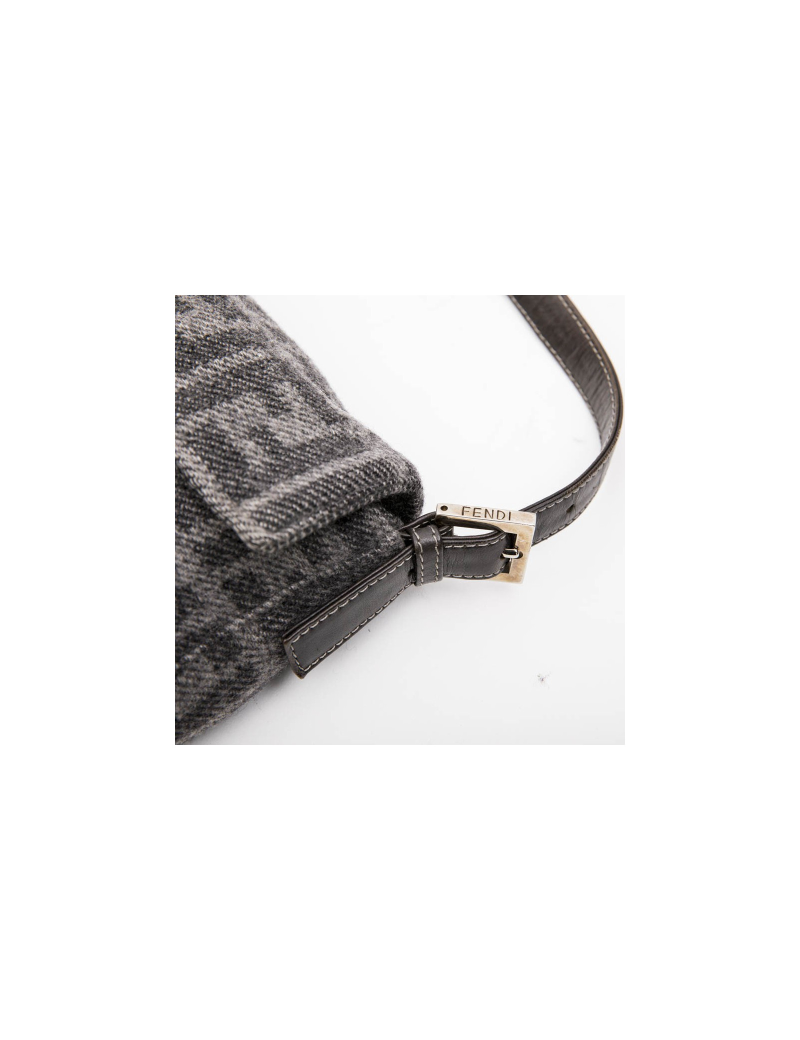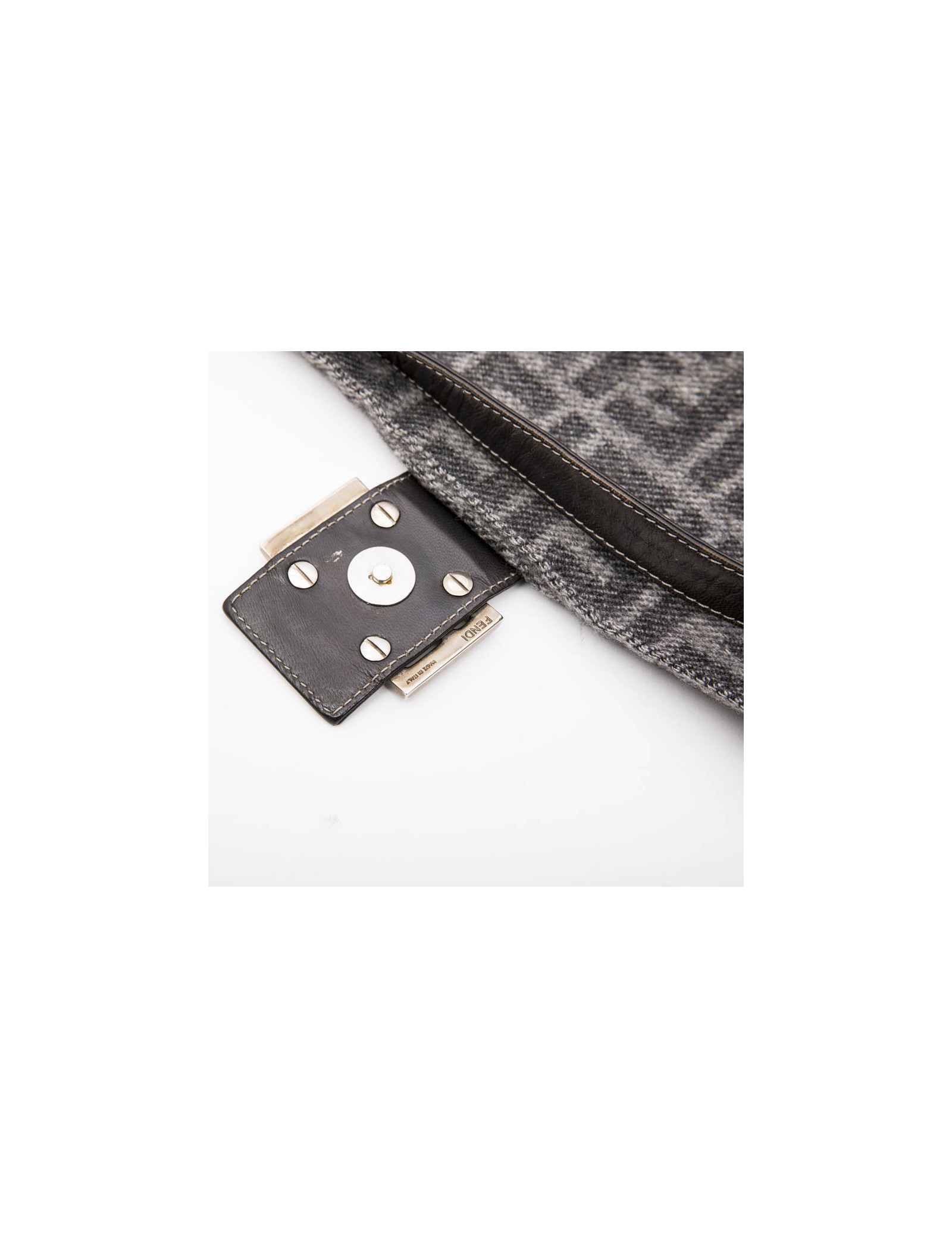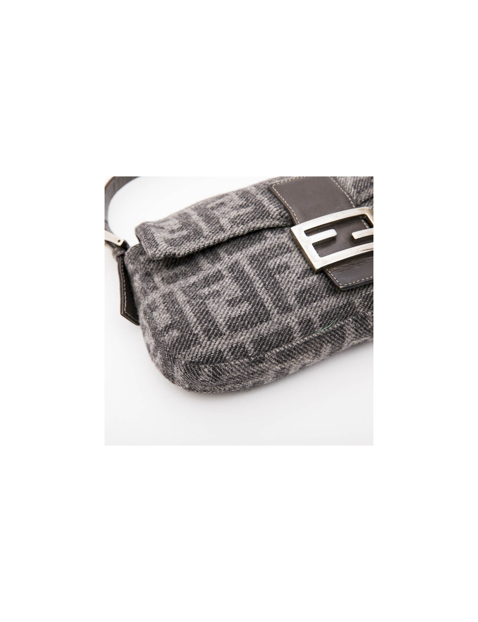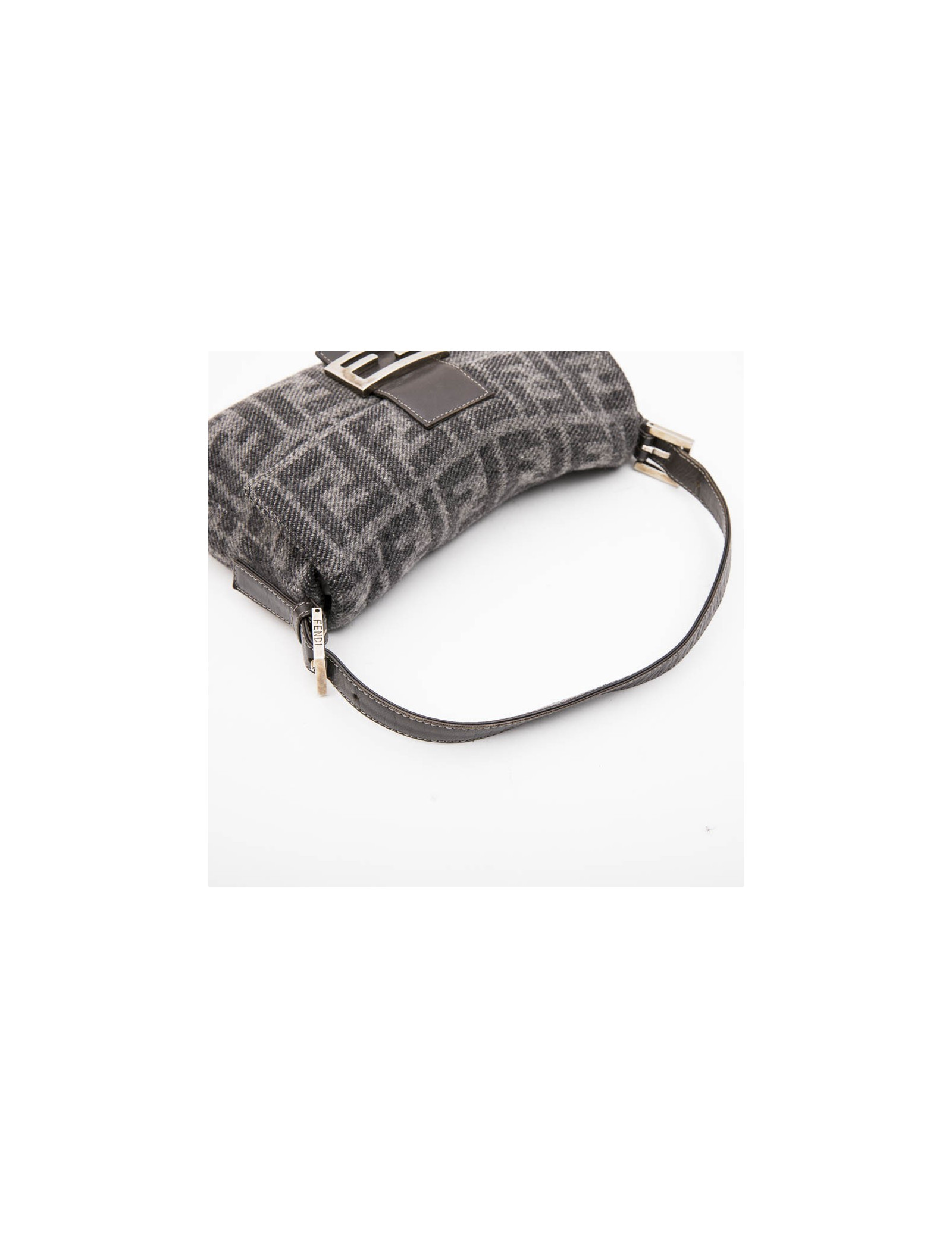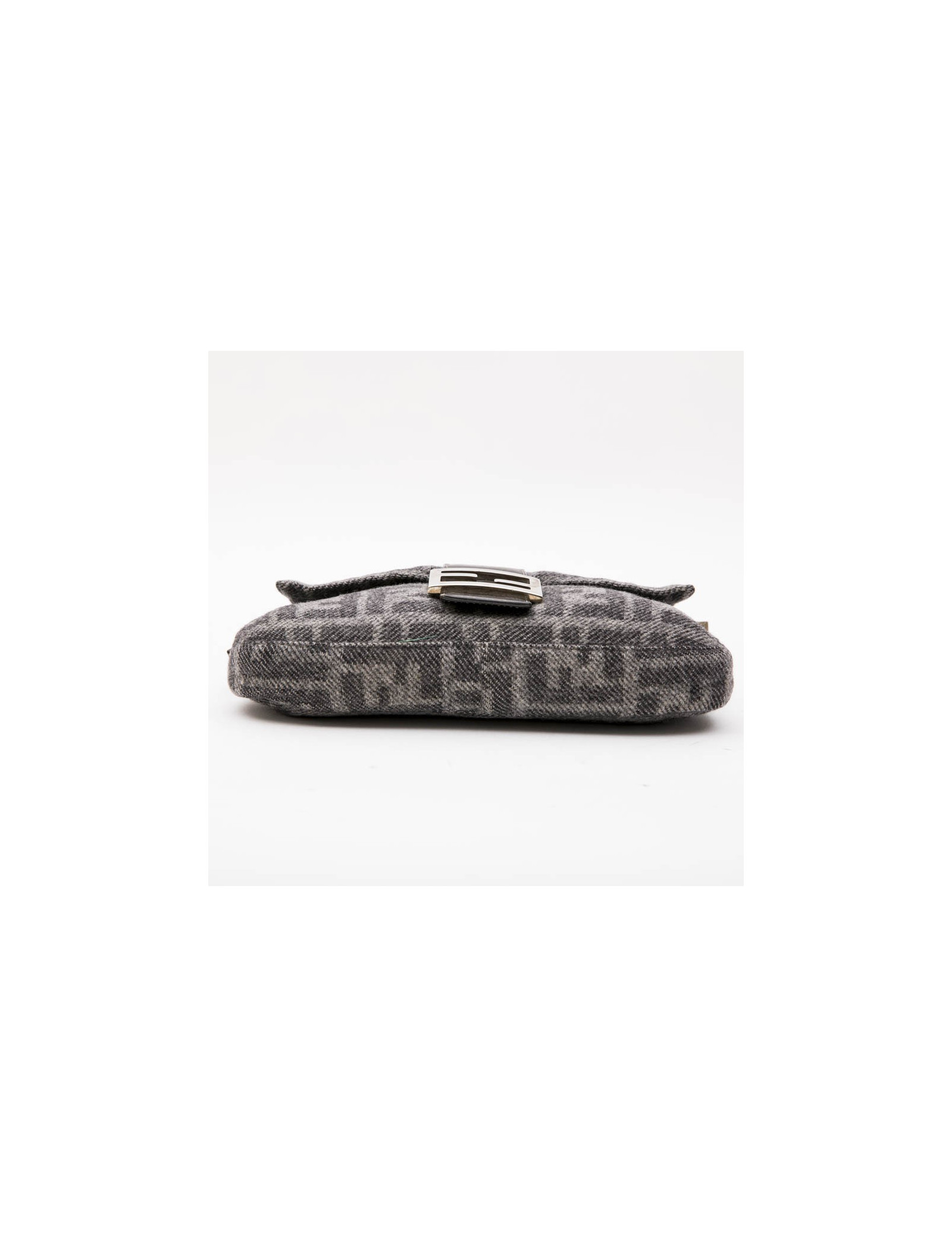 Fendi baguette bag in gray monogram wool. Snap closure. Silver metal hardware. Dark gray leather finishes.