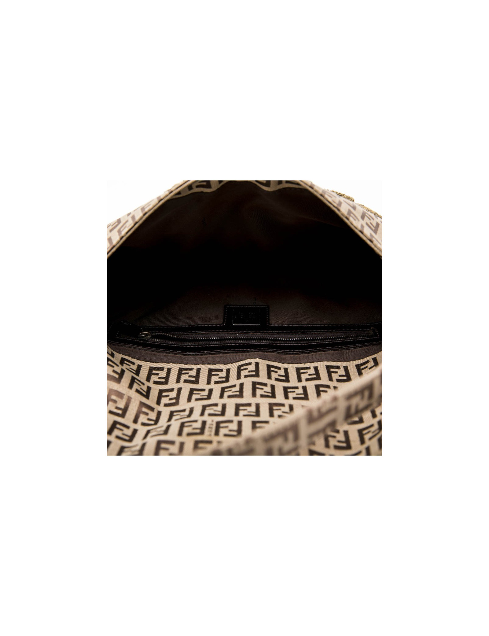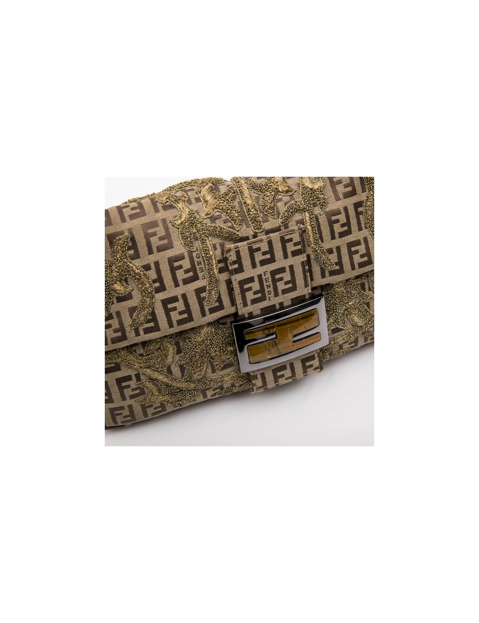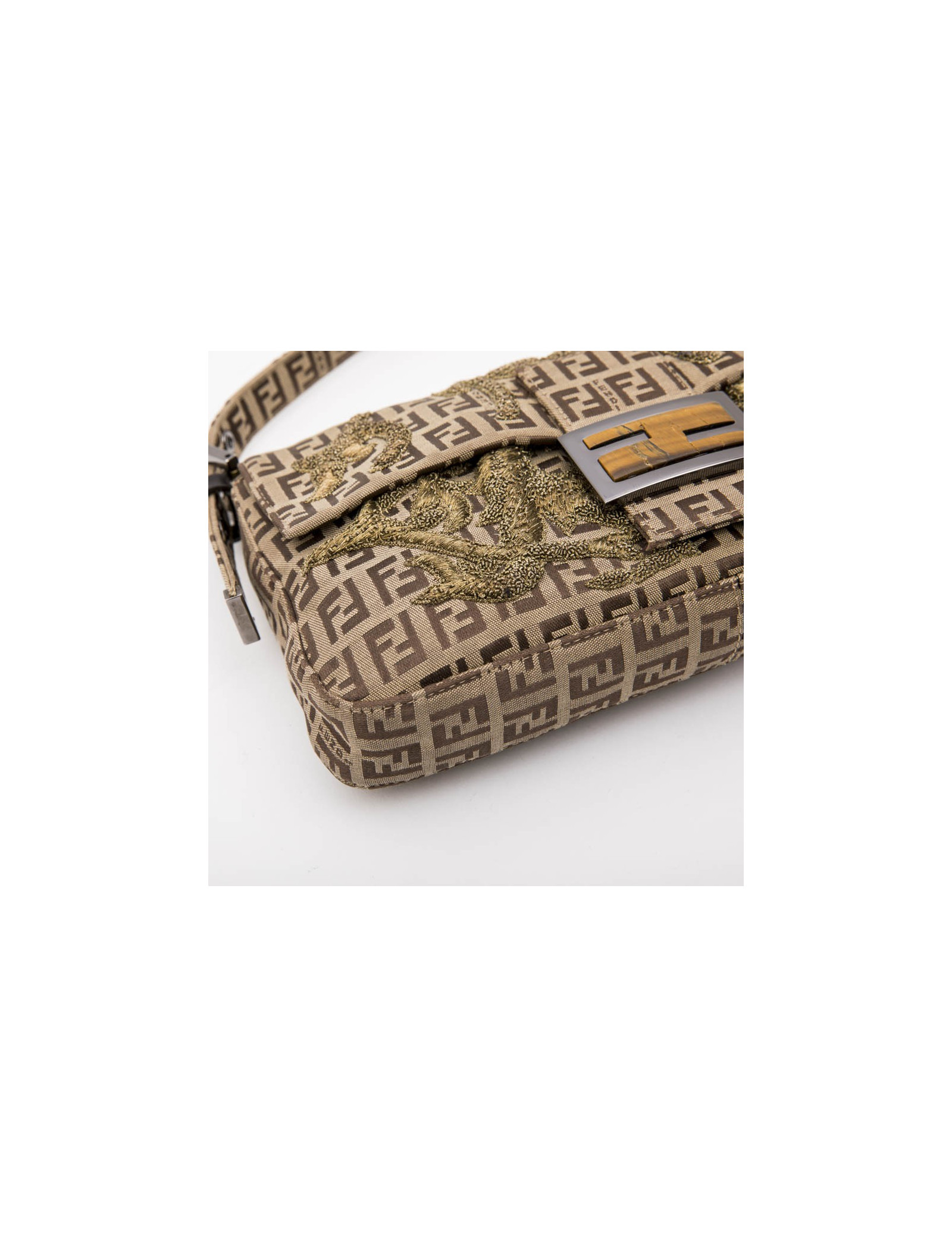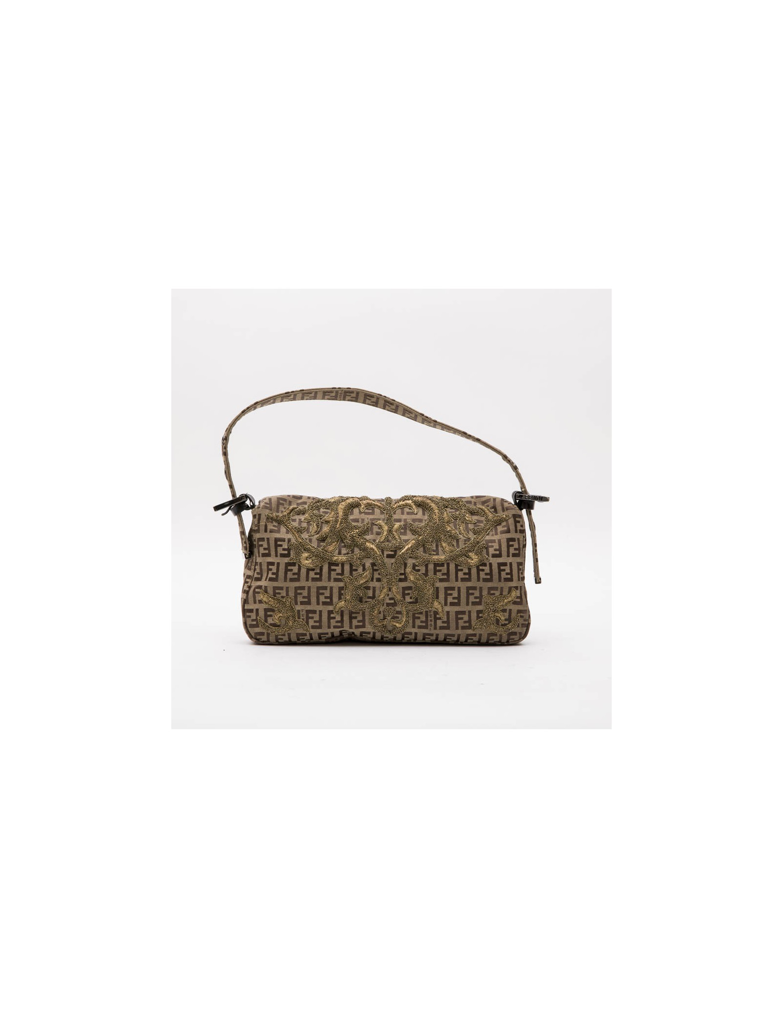 Fendi baguette bag in monogram canvas, gold thread embroidery. Ruthenium metal hardware. Snap closure.