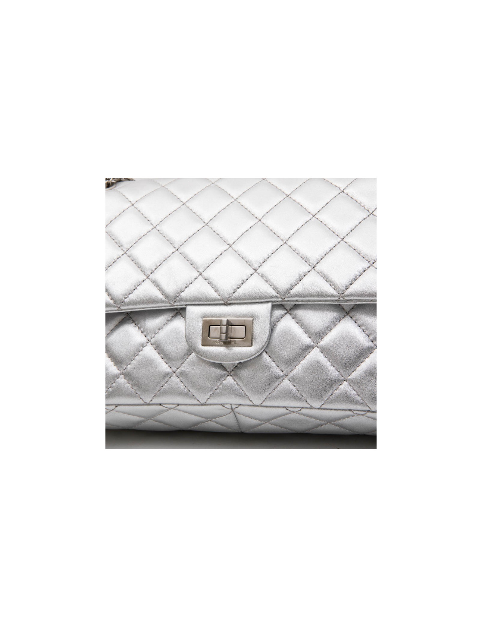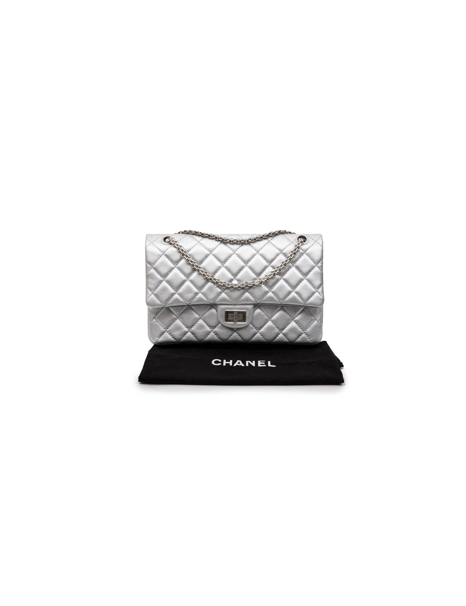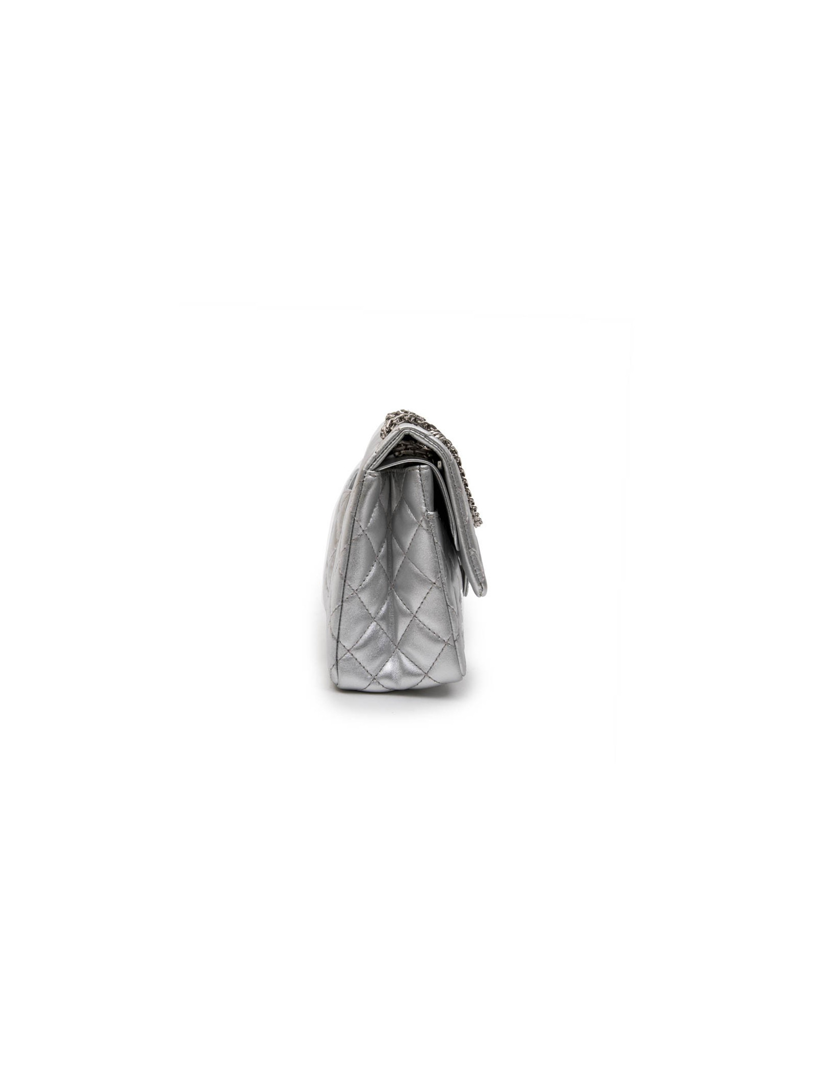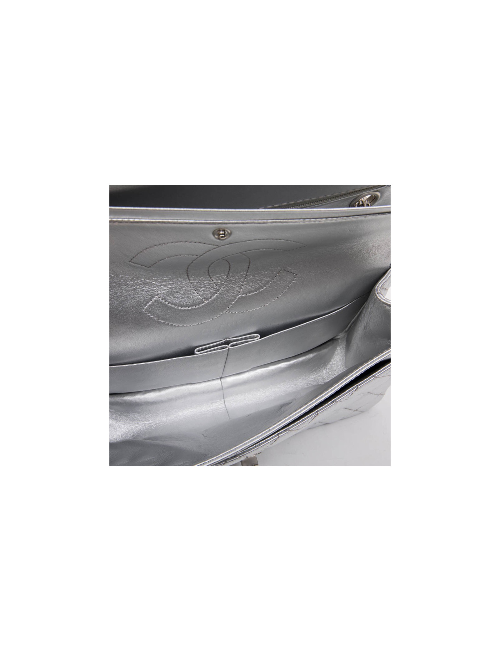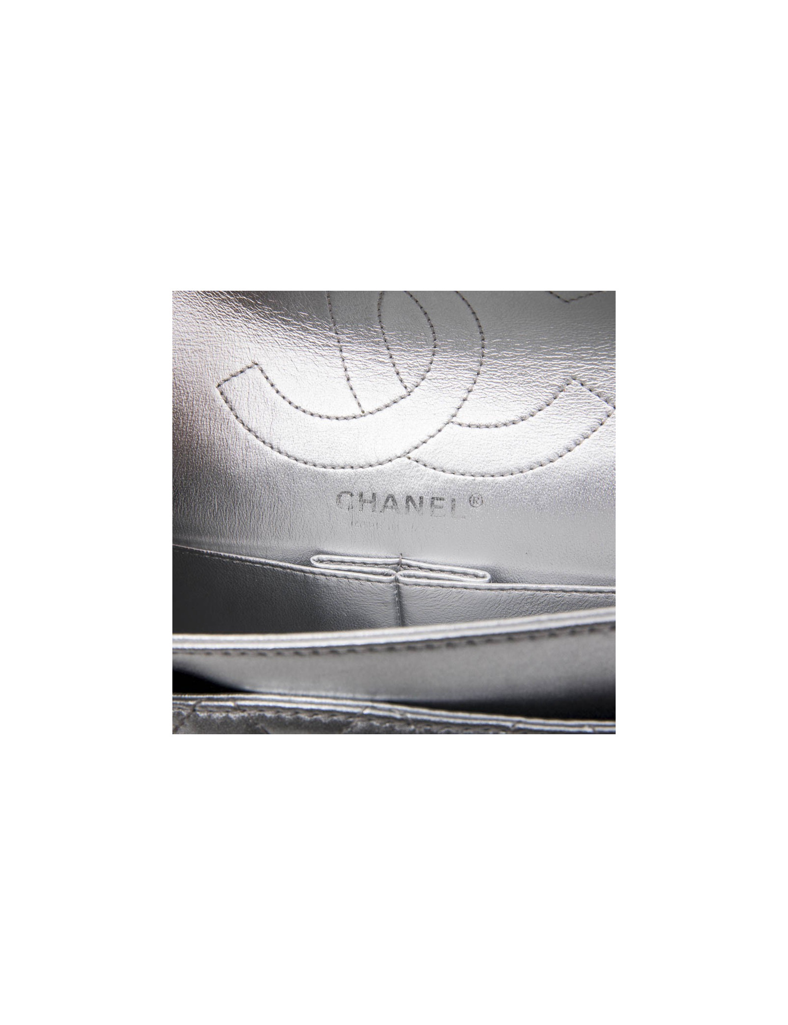 Chanel 'Timeless' double flap bag in silver quilted leather. Clasp 2.55. Matt silver hardware. The interior is fully lined in silver leather. Made in France.