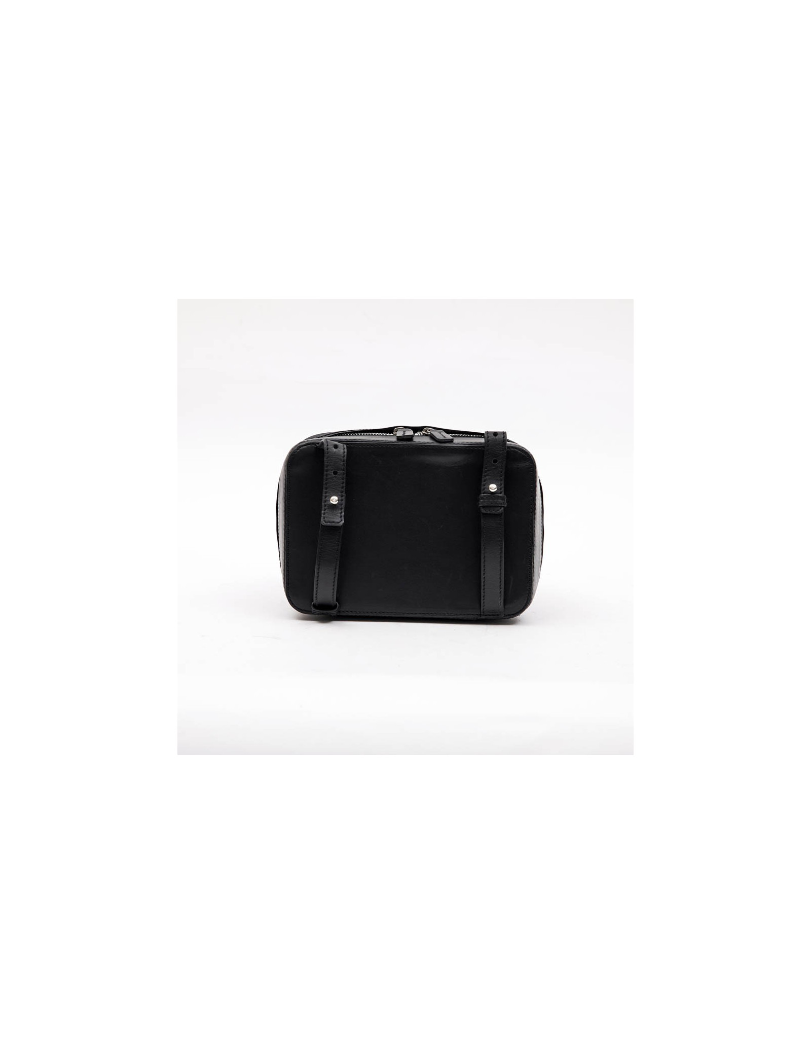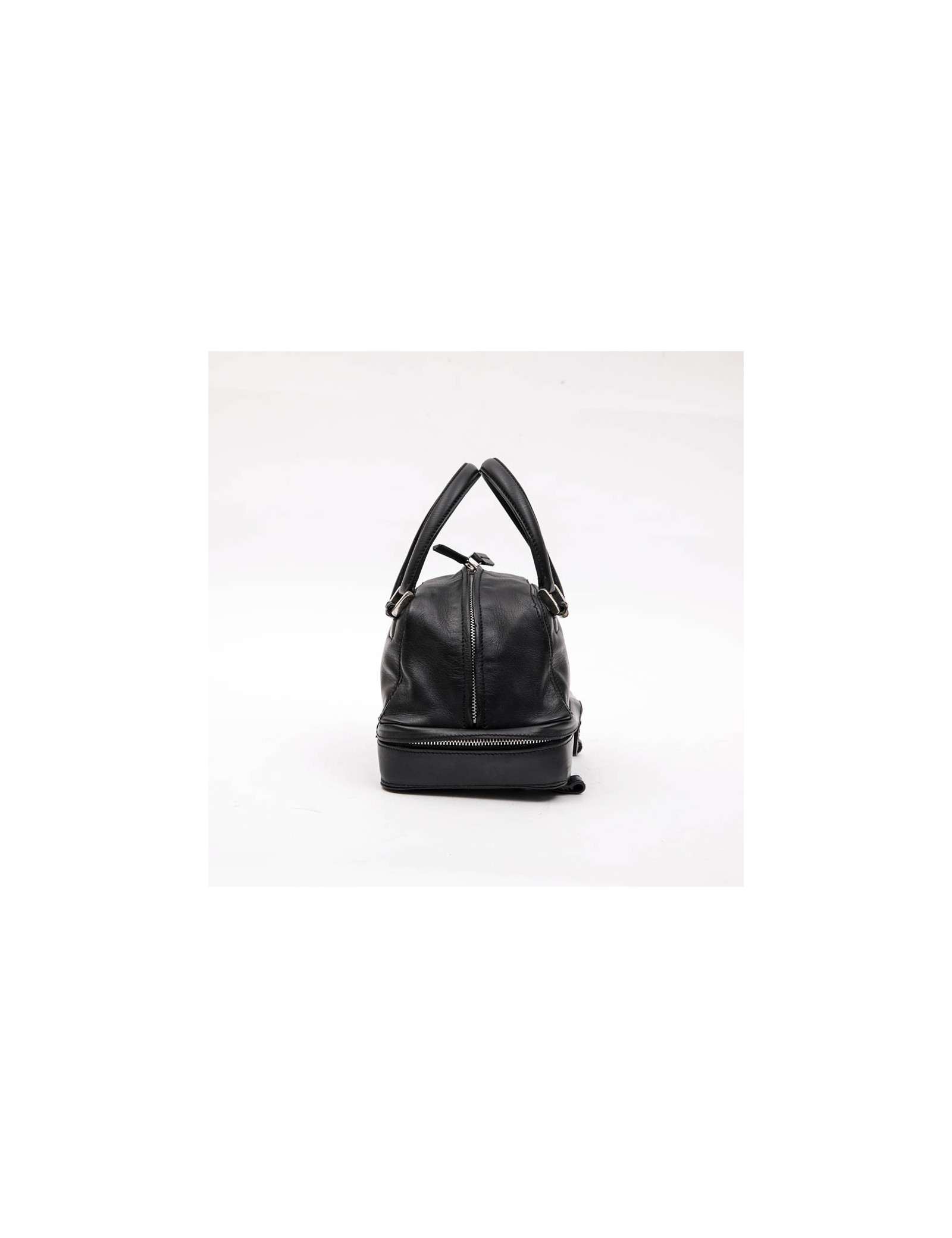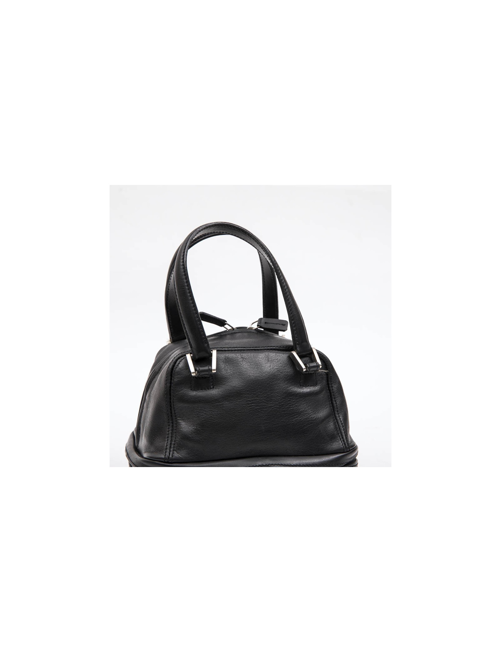 Mini LAGERFELD bowling bag in black leather, silver metal hardware, zipper on the top.