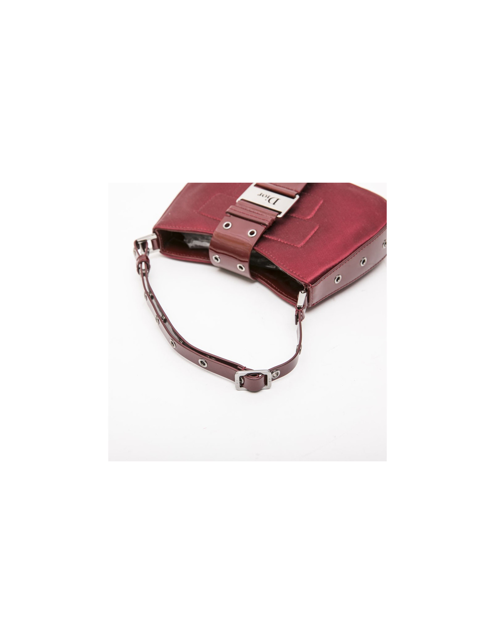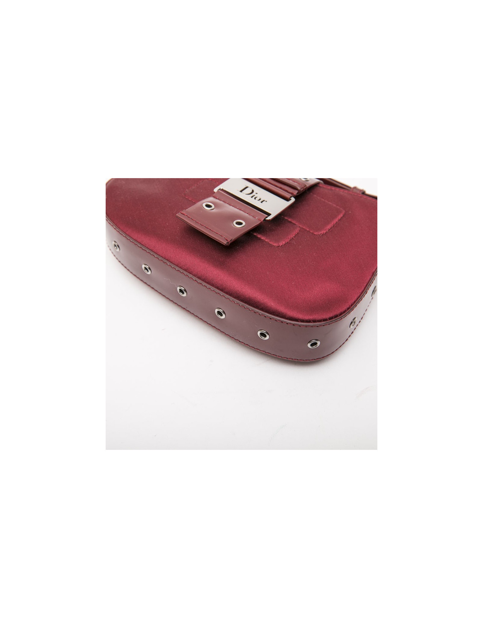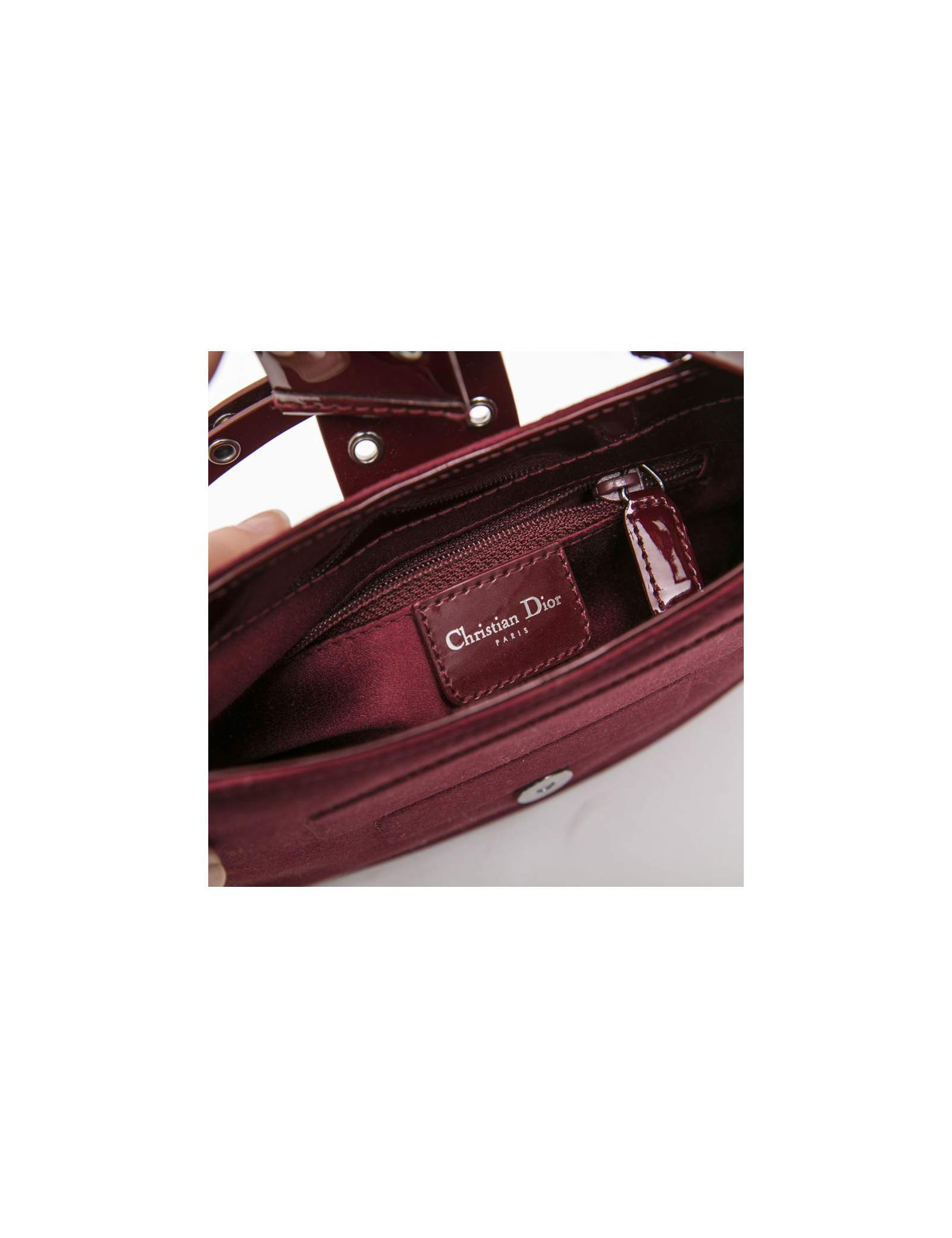 Christian Dior mini bag in burgundy satin and patent leather. Silver metal hardware. Magnetic closure.