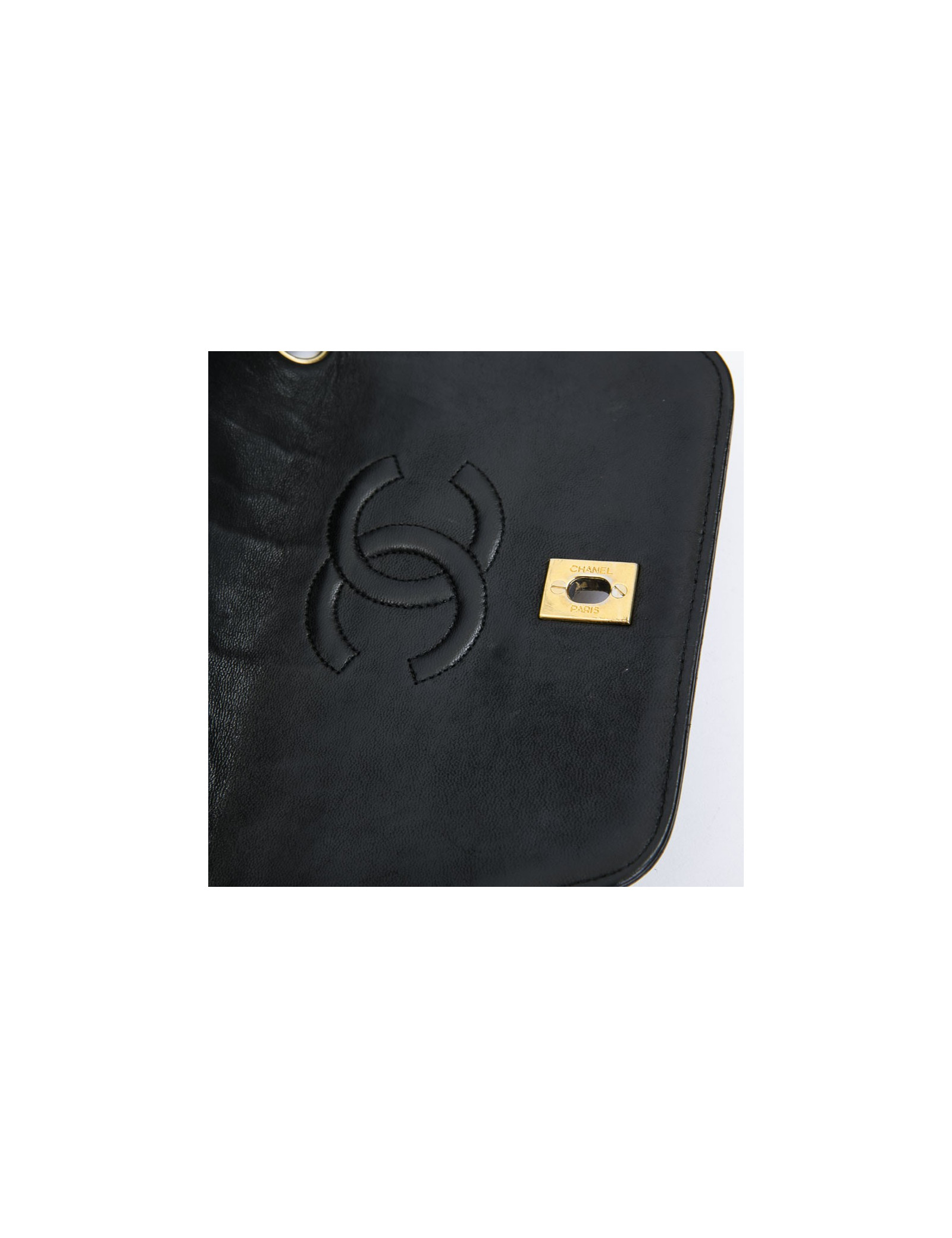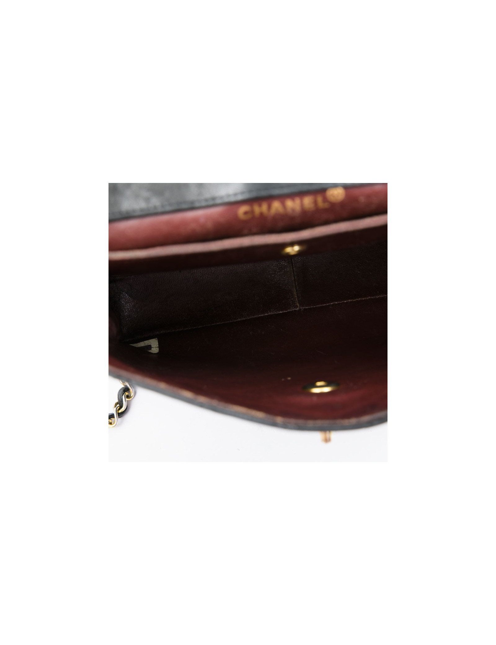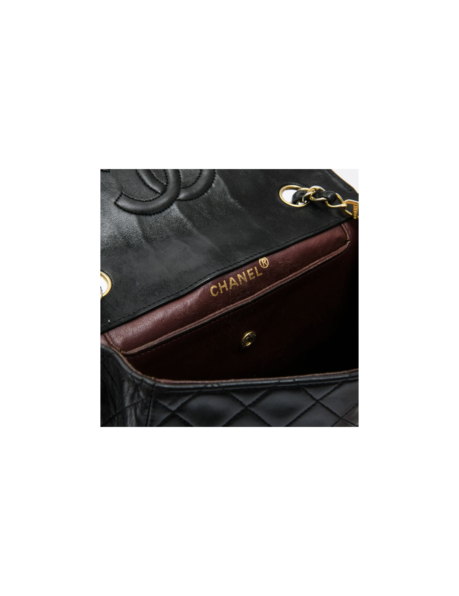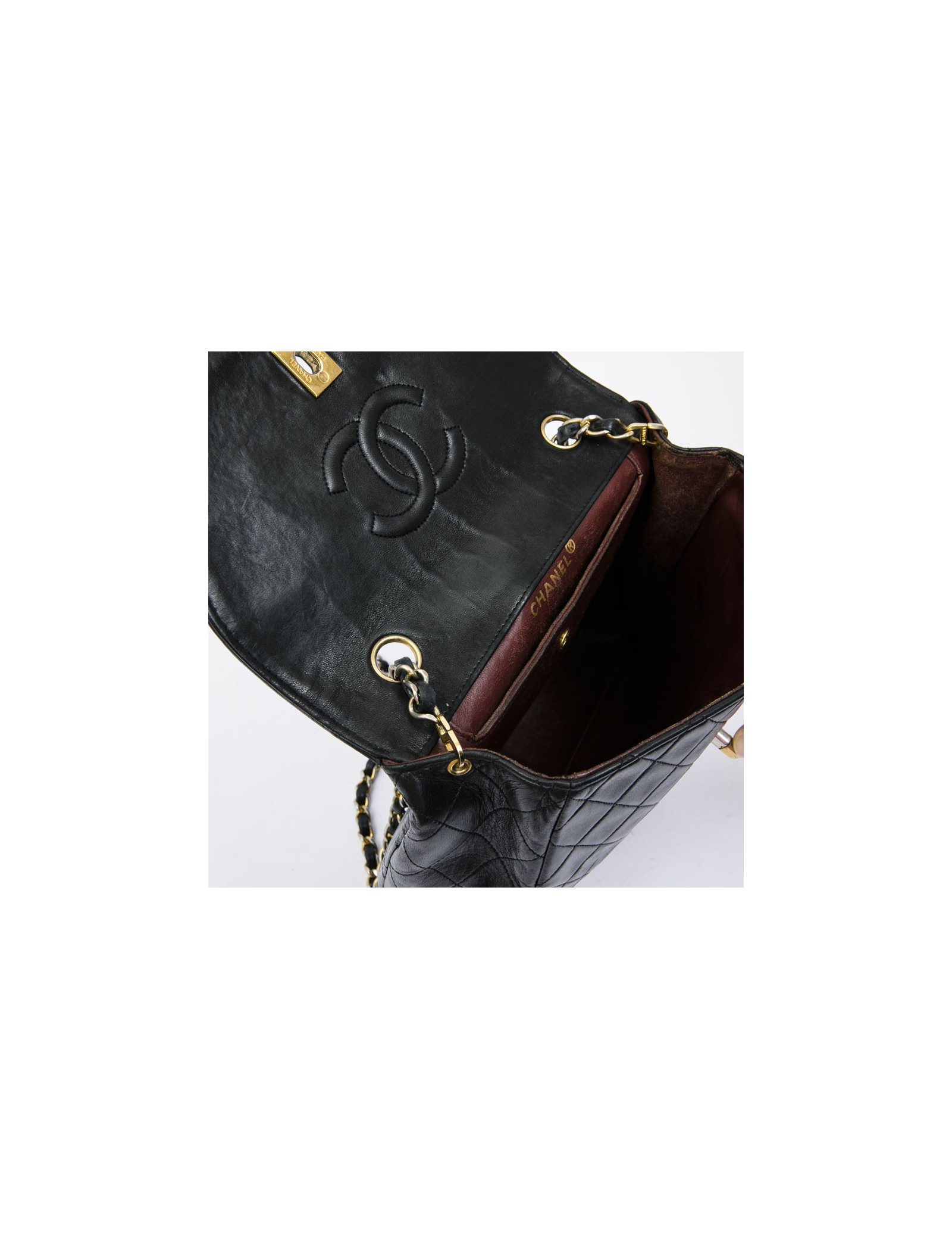 CHANEL vintage bag in black quilted leather. Hardware is in gold metal. The burgundy smooth leather interior has a flat pocket. Flat pocket also outside. Clasp CC.