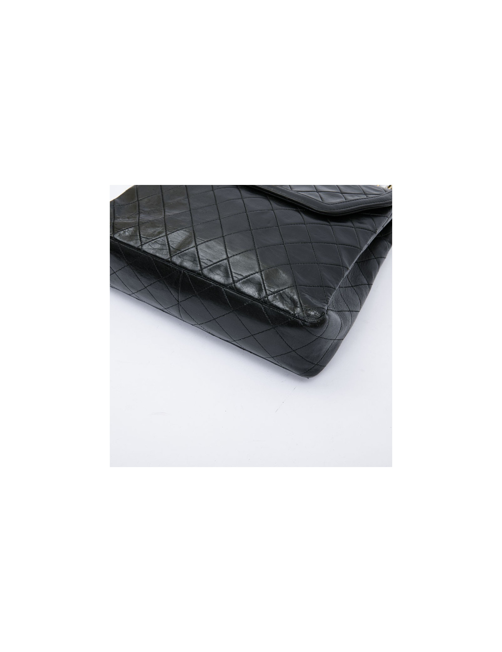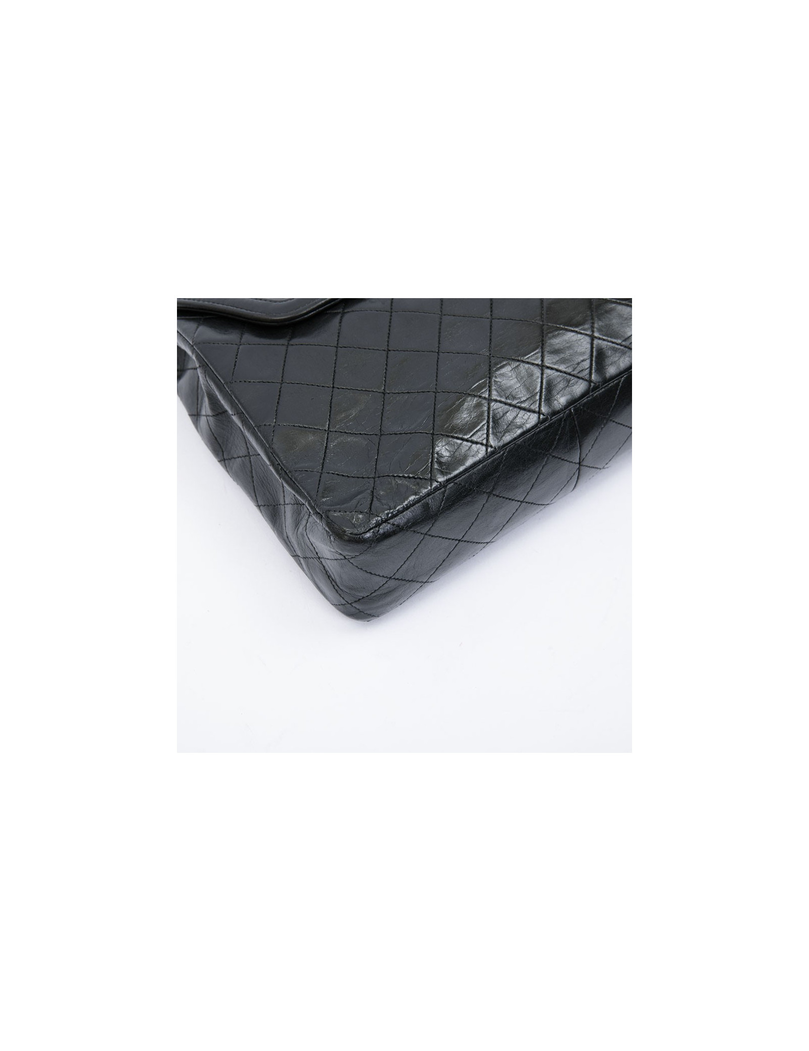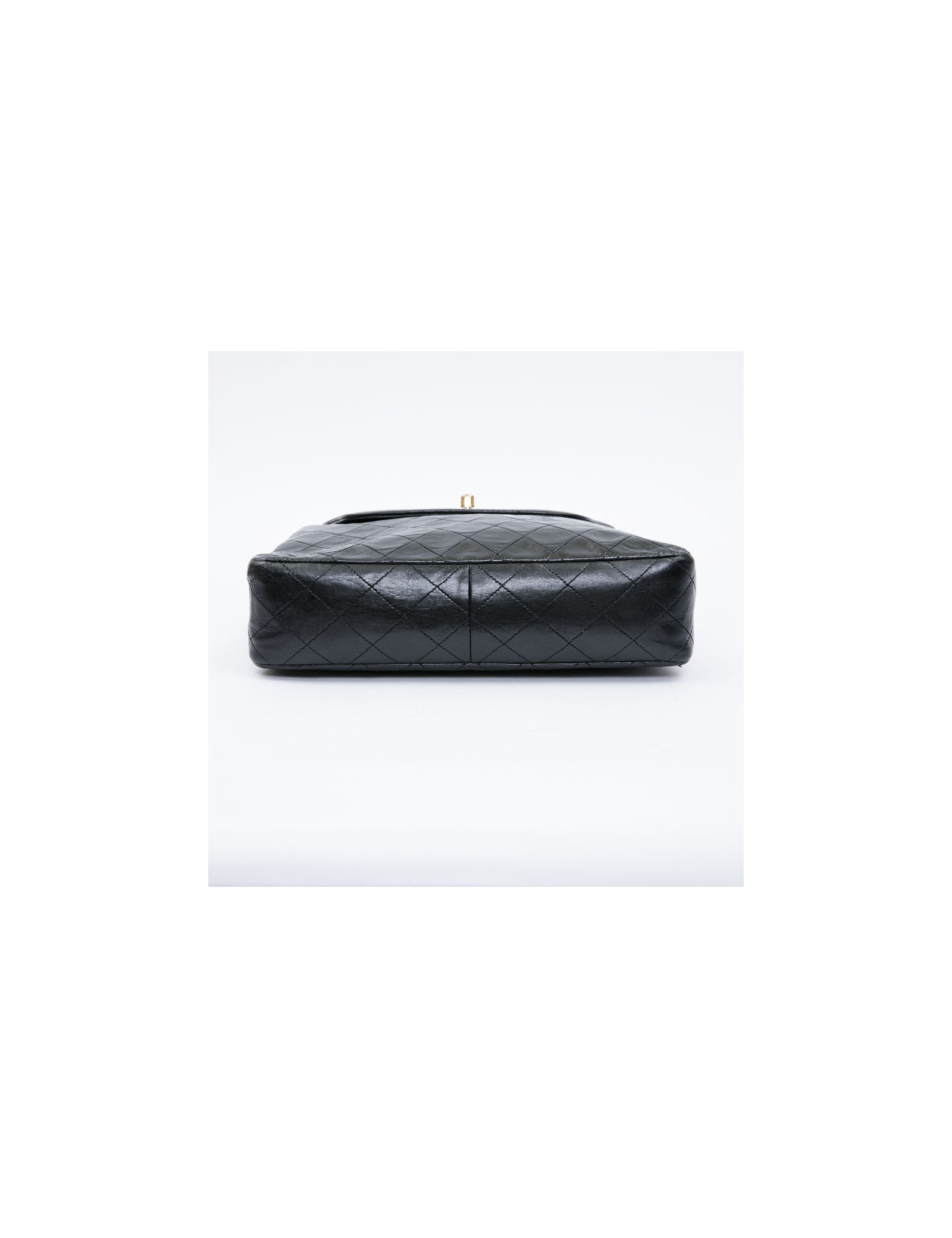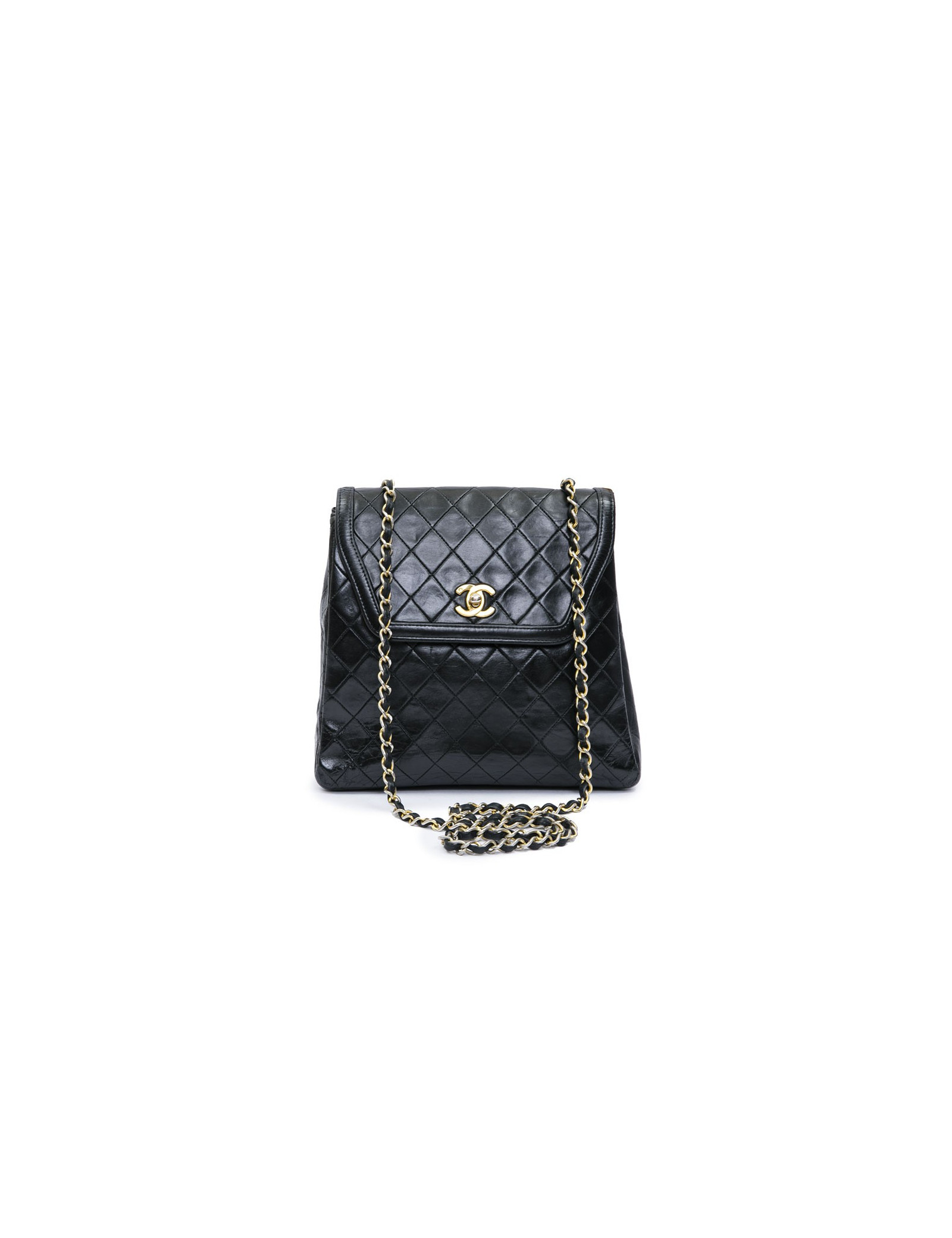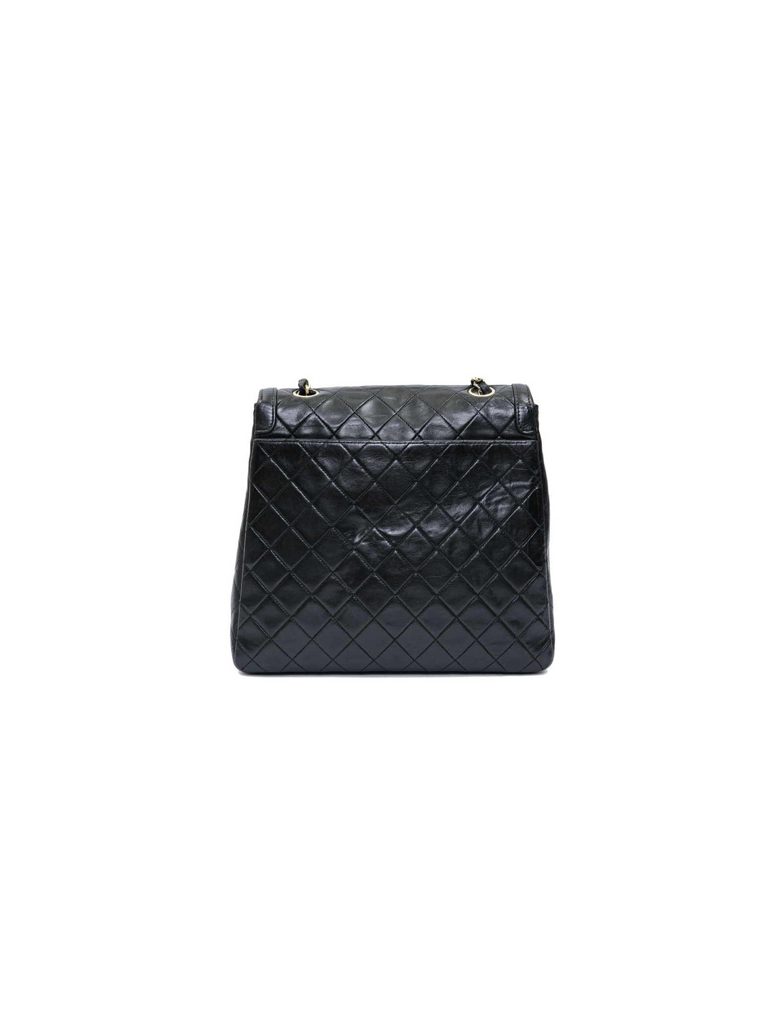 CHANEL vintage bag in black quilted leather. Hardware is in gold metal. The burgundy smooth leather interior has a flat pocket. Flat pocket also outside. Clasp CC.