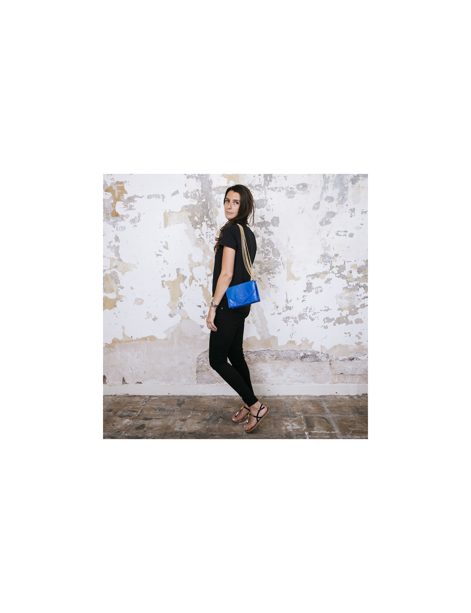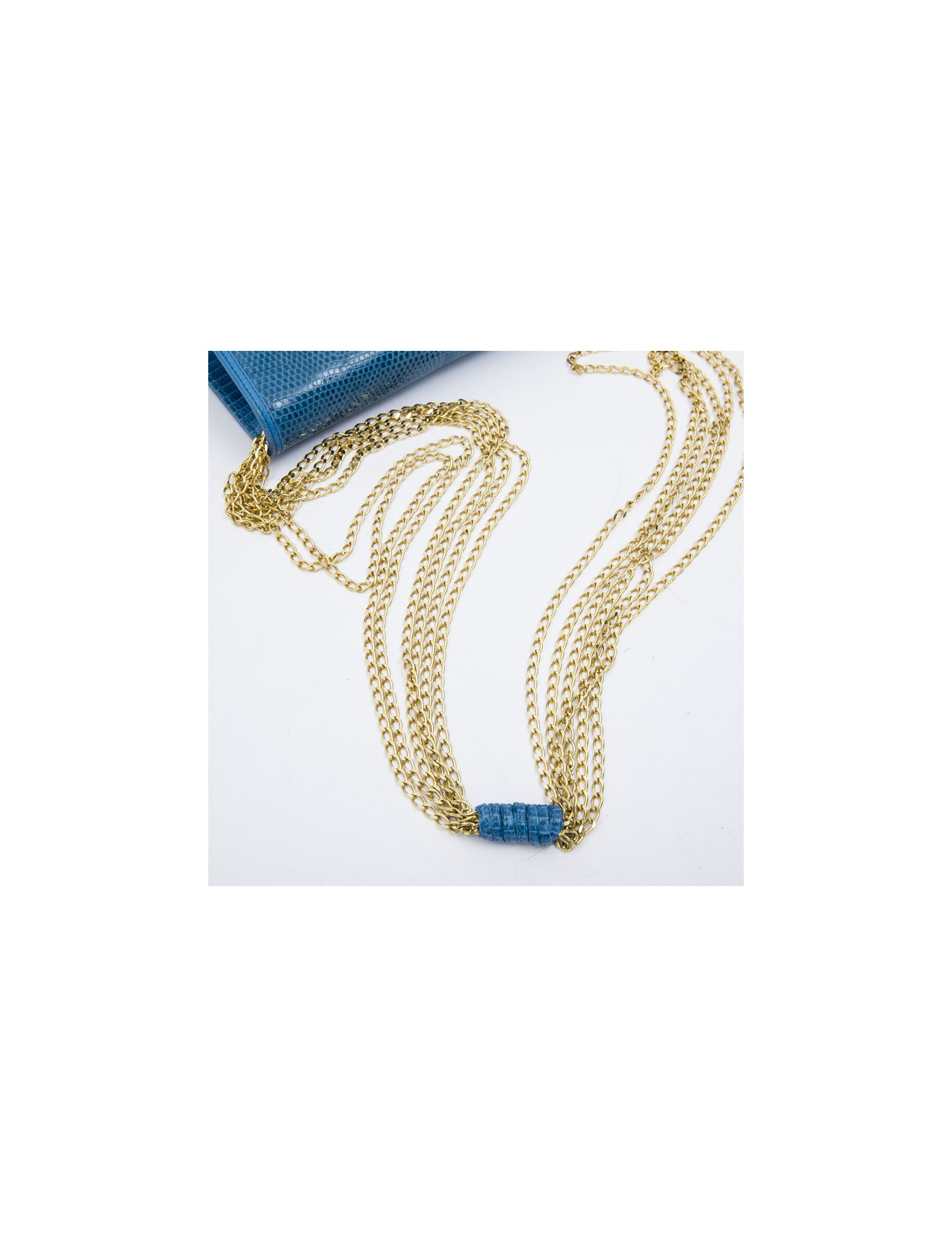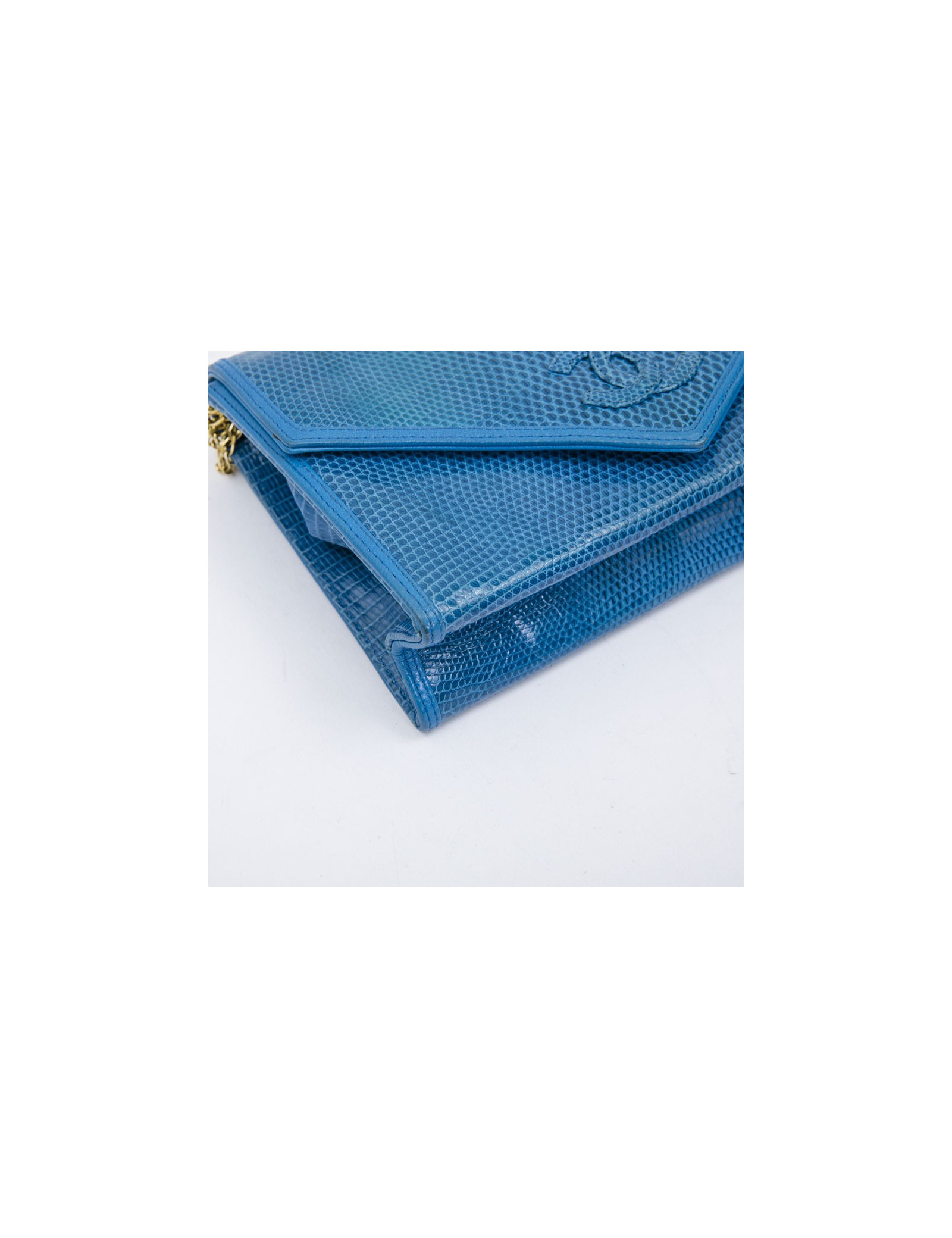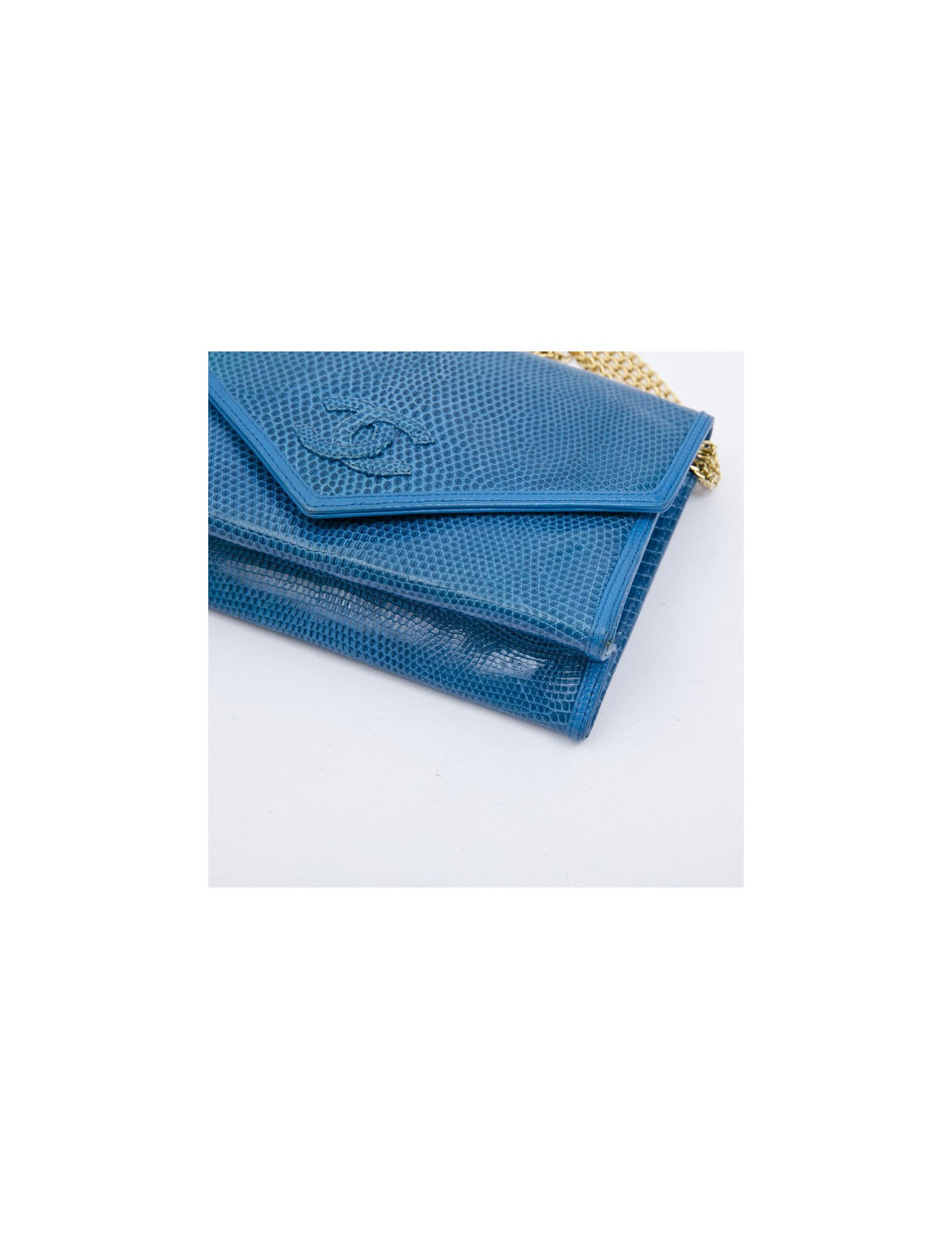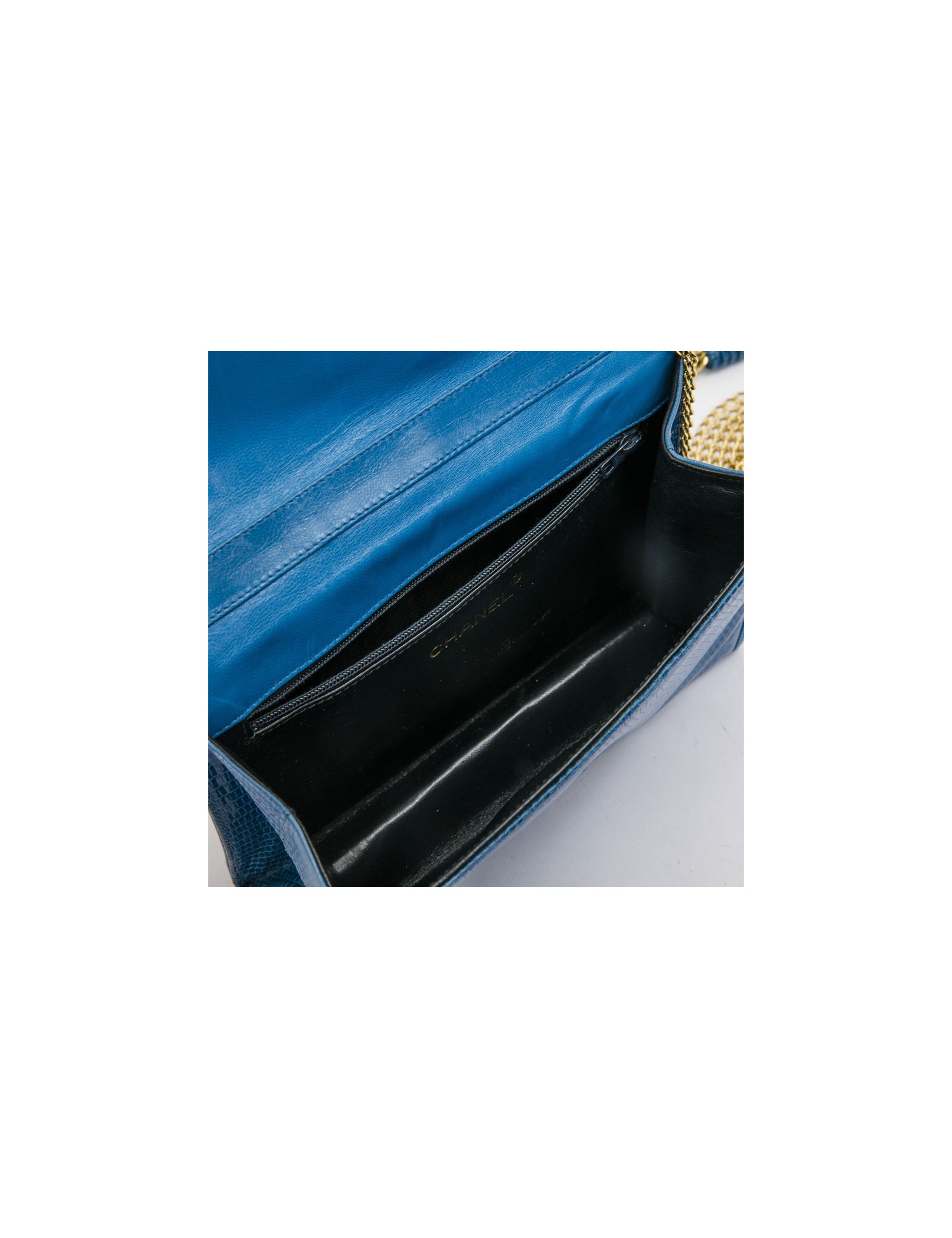 Exceptional piece. Chanel vintage rare bag in blue lizard. Signature CC in lizard on the front. Closing by pressure. Six golden metal chains allow for shoulder wear. Inner lining in black smooth leather with large flat zipped pocket